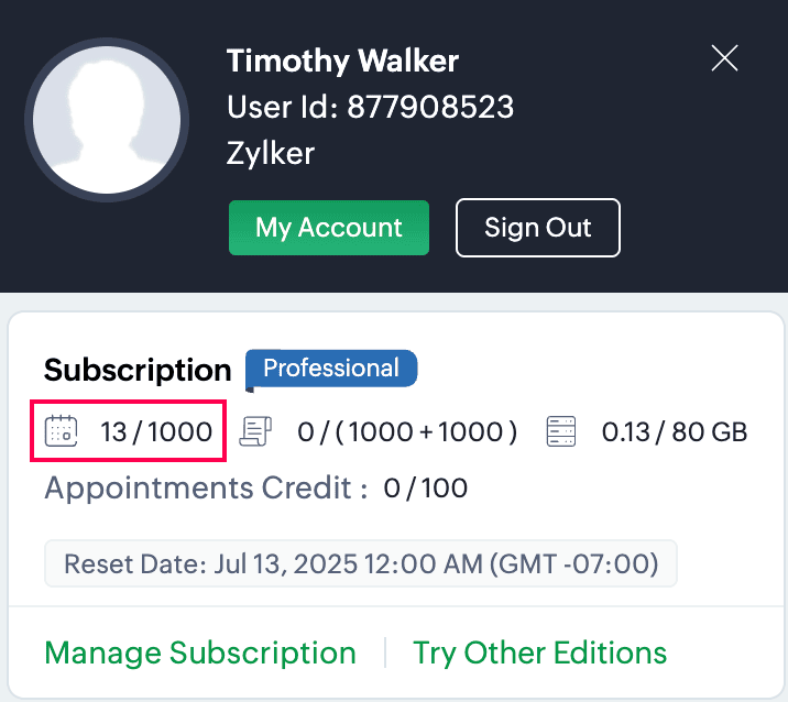 Multi-day appointment usage in Zoho FSM is calculated based on the number of distinct dates recorded in the time sheets of a service appointment. One appointment is deducted when the Service Appointment is created, and additional appointments are ...
