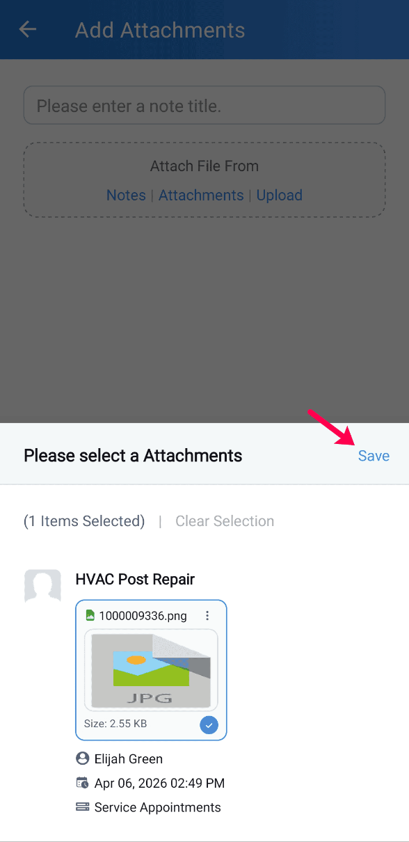 - Notes / Attachments (Select from existing attachments available in the Notes/Attachments tab of the Service Appointment)