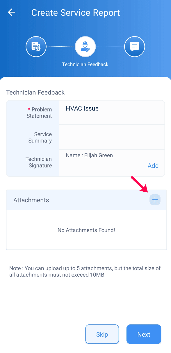 Adding attachments while adding technician feedback during Service Report creation