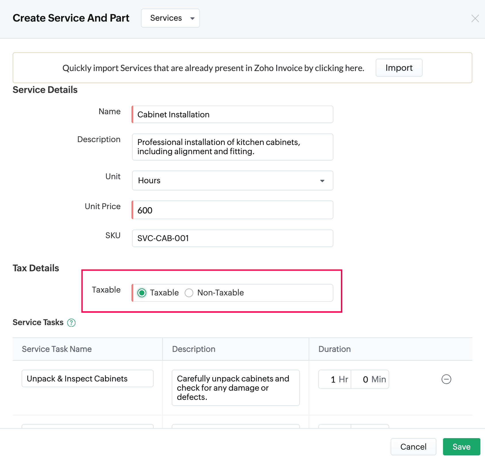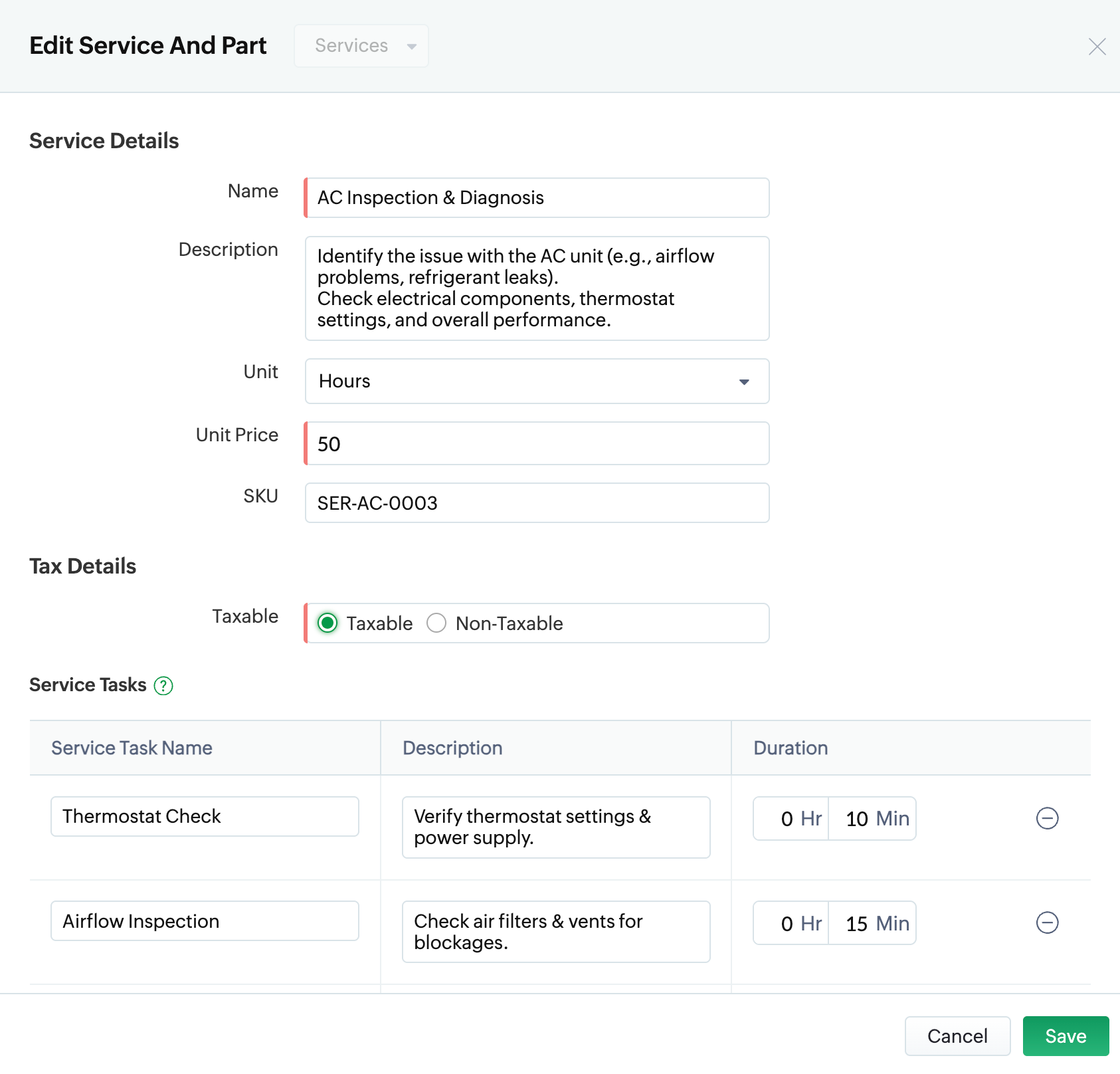 To add a service in Zoho FSM : Go to the Services and Parts module. Hover over Create and select Services. In the Create Service and Part page, enter the Service details. Select whether the service is Taxable or Non-Taxable. To add Service Tasks: ...