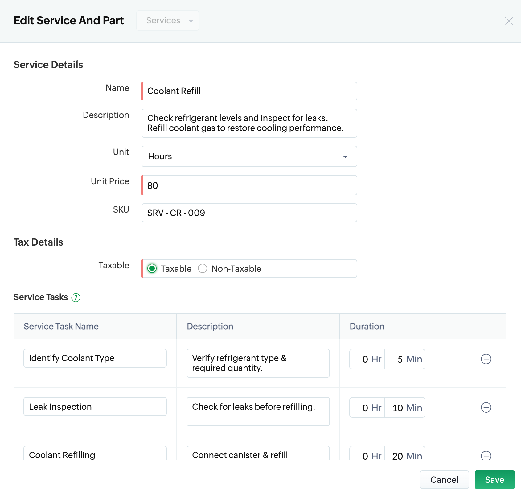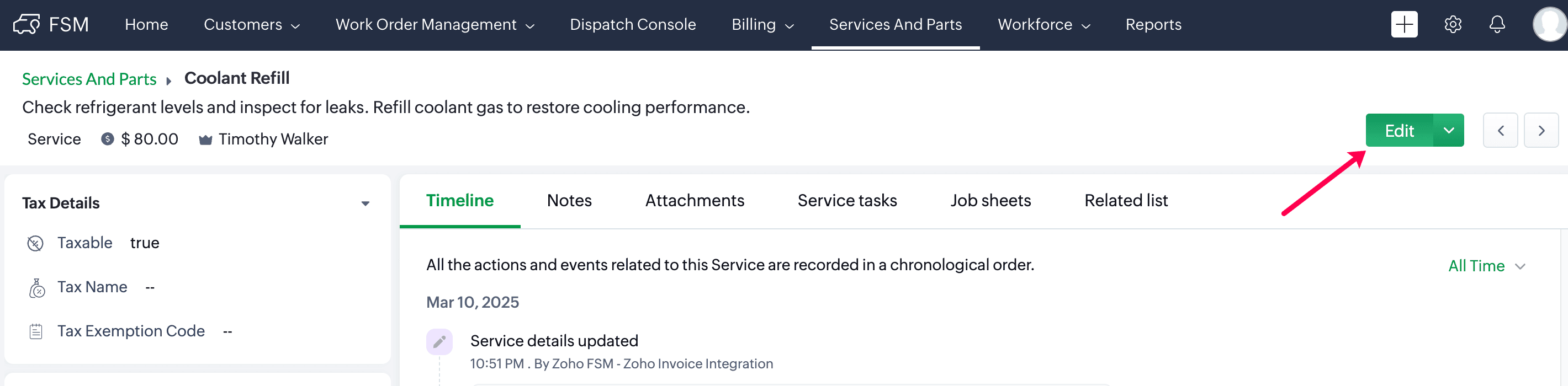 To edit a service or part in Zoho FSM :
