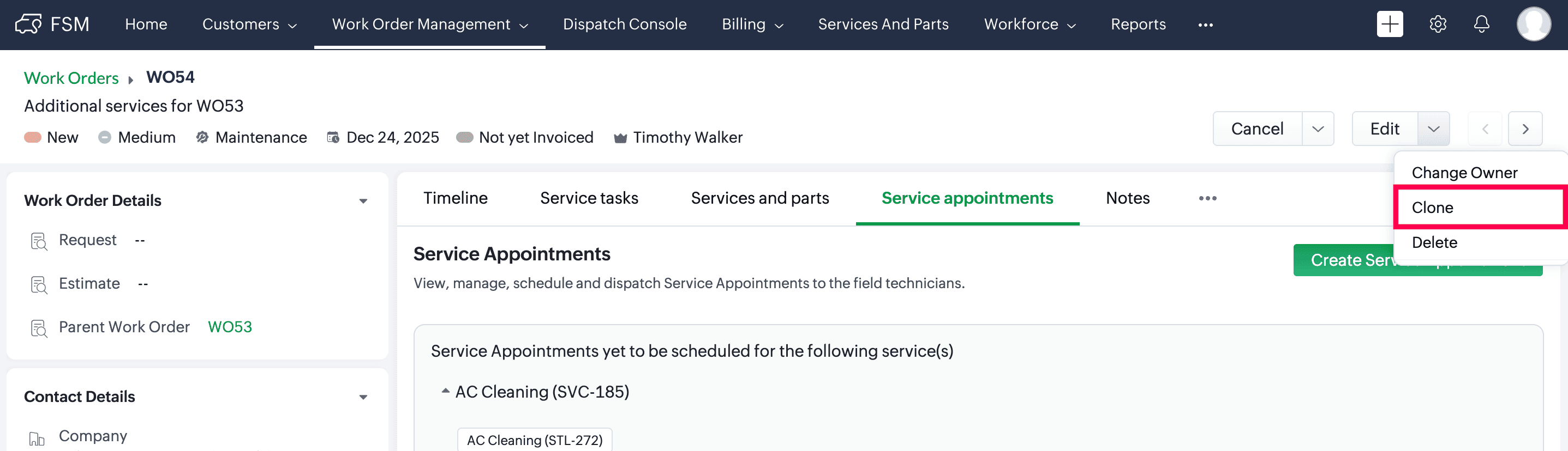 How do I clone a Work Order in Zoho FSM?