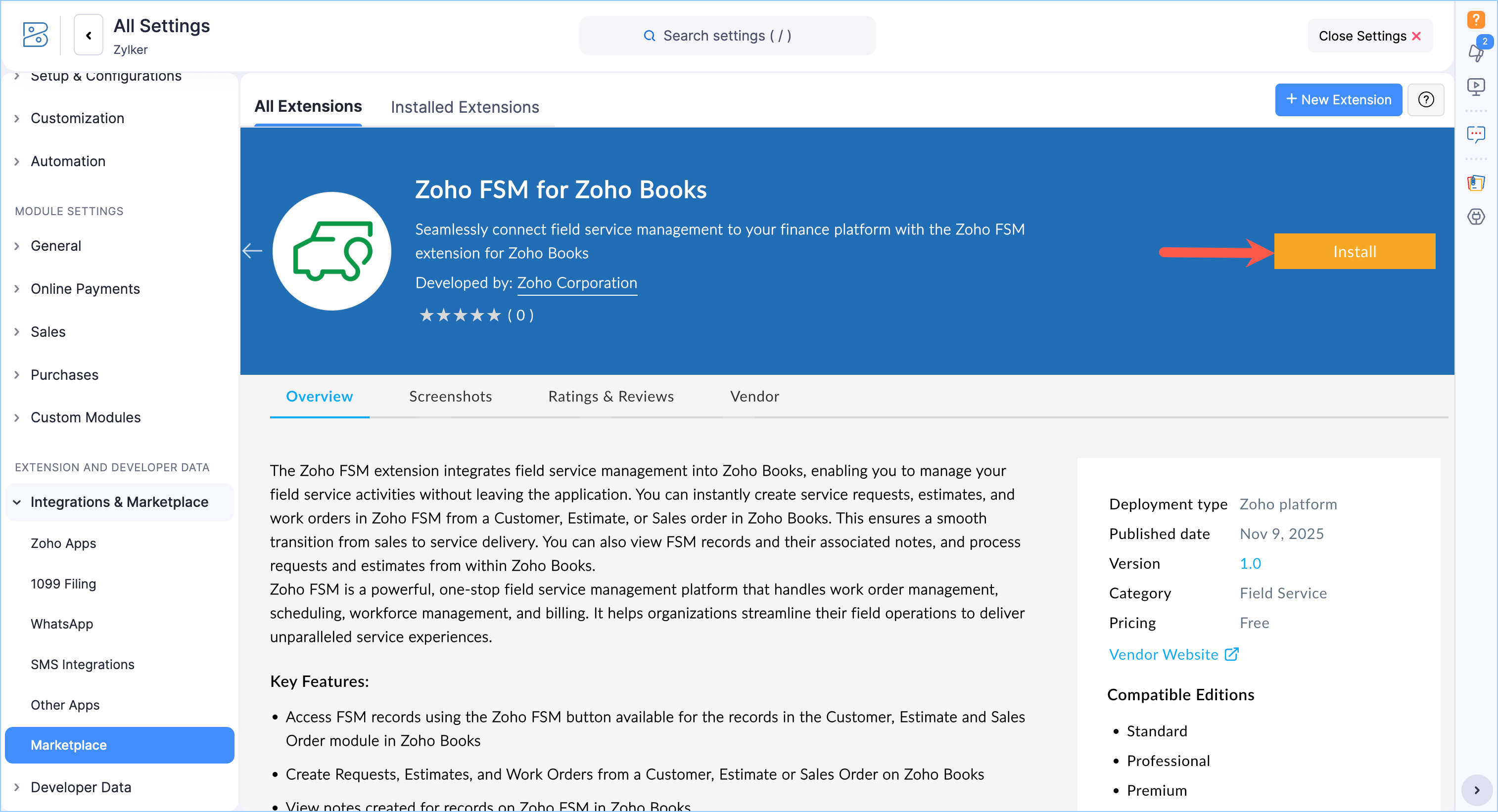 You can install Zoho FSM for Zoho Books either from