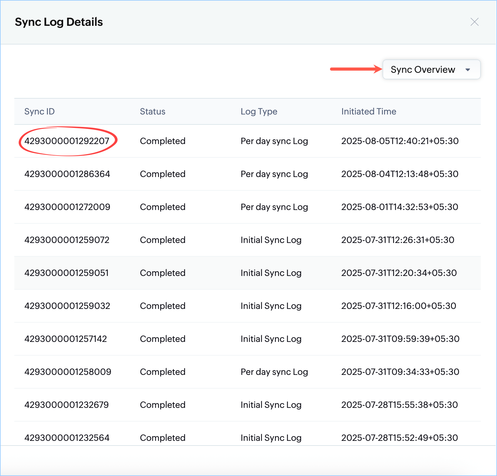 You can see the consolidated view of your sync history, showing the success and failure details of records synced between Zoho CRM and Zoho FSM.