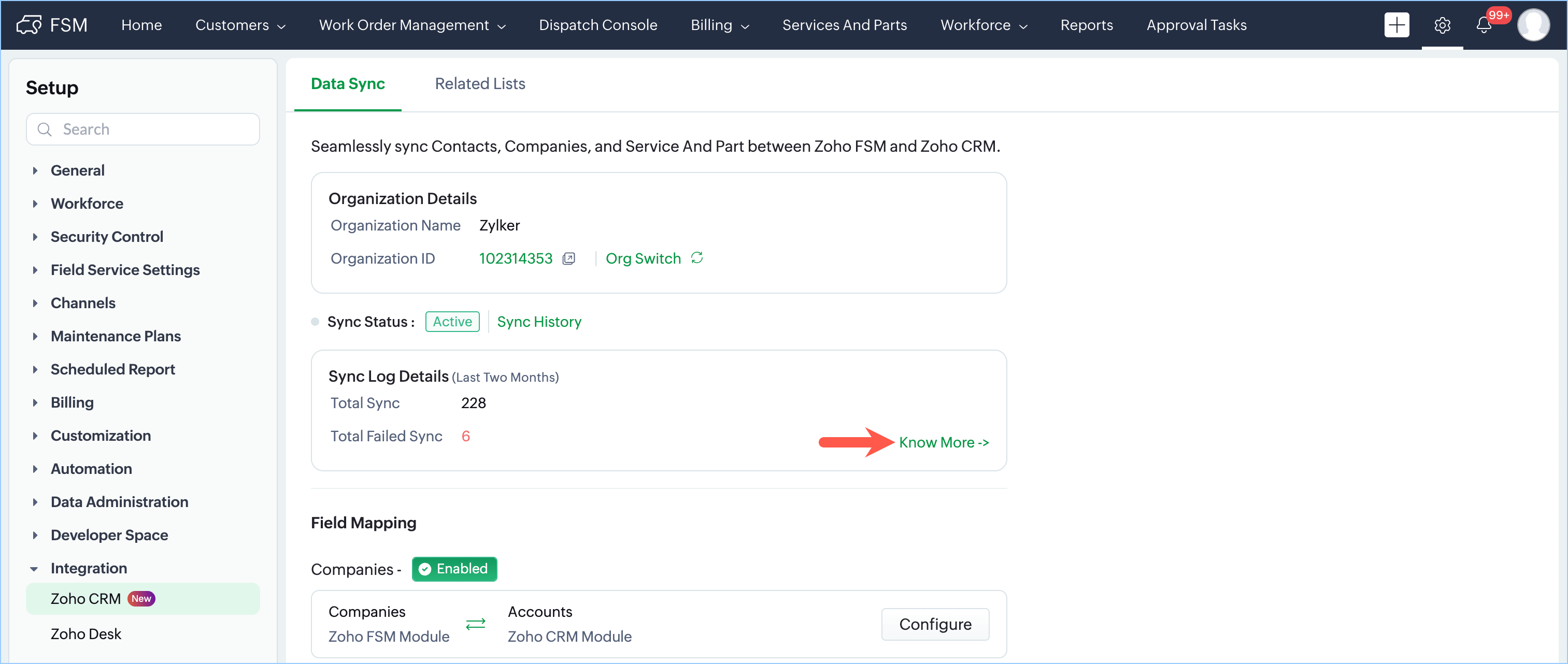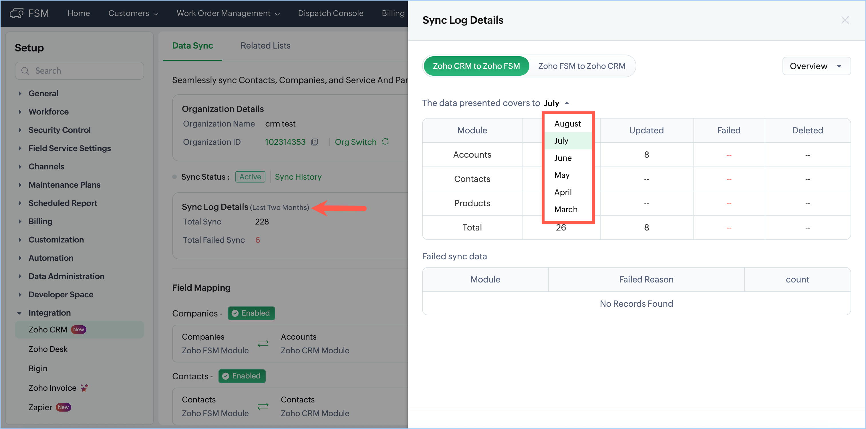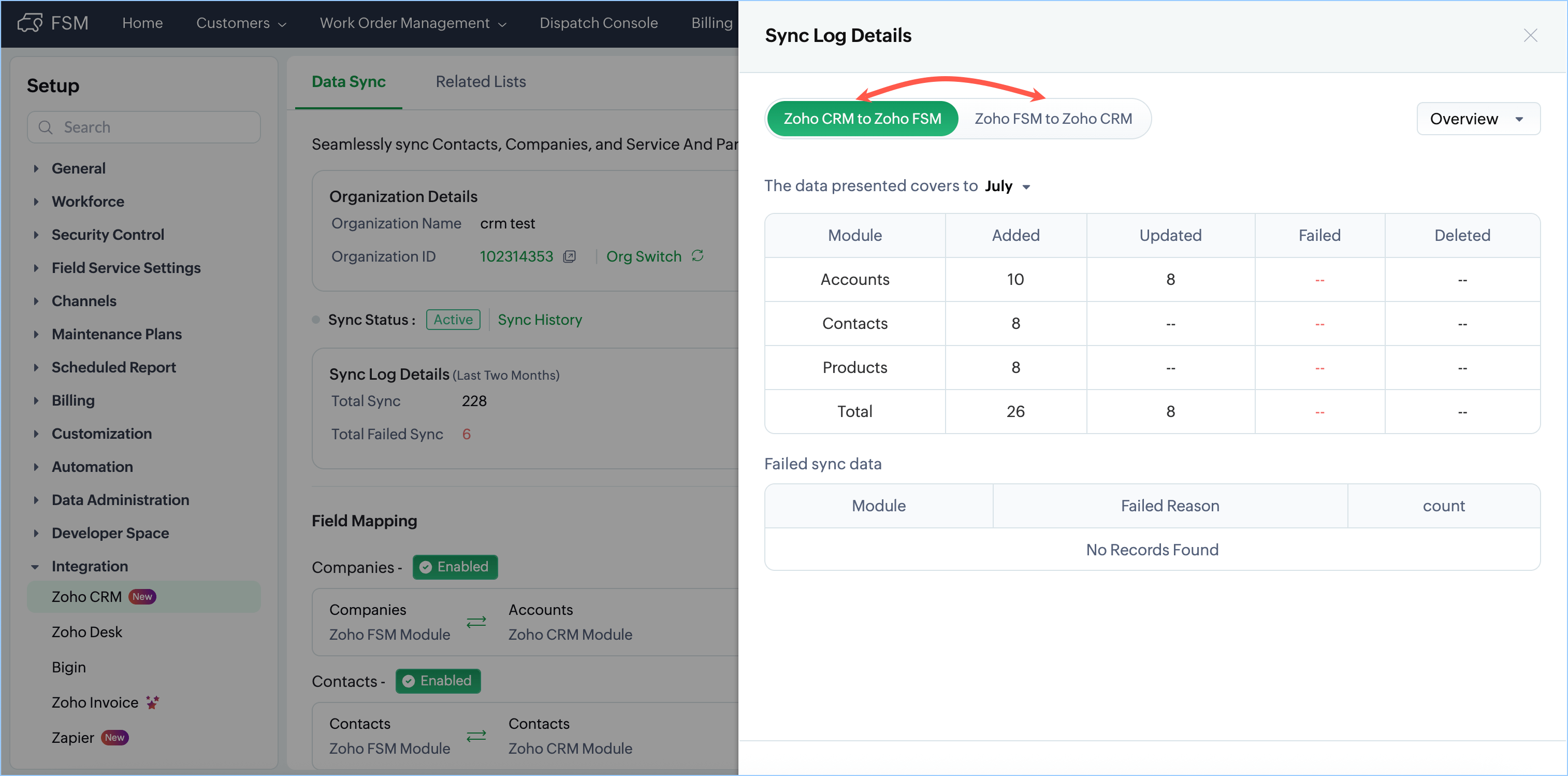 1. Zoho CRM to Zoho FSM: Shows the sync details of data that is pulled from Zoho CRM to Zoho FSM