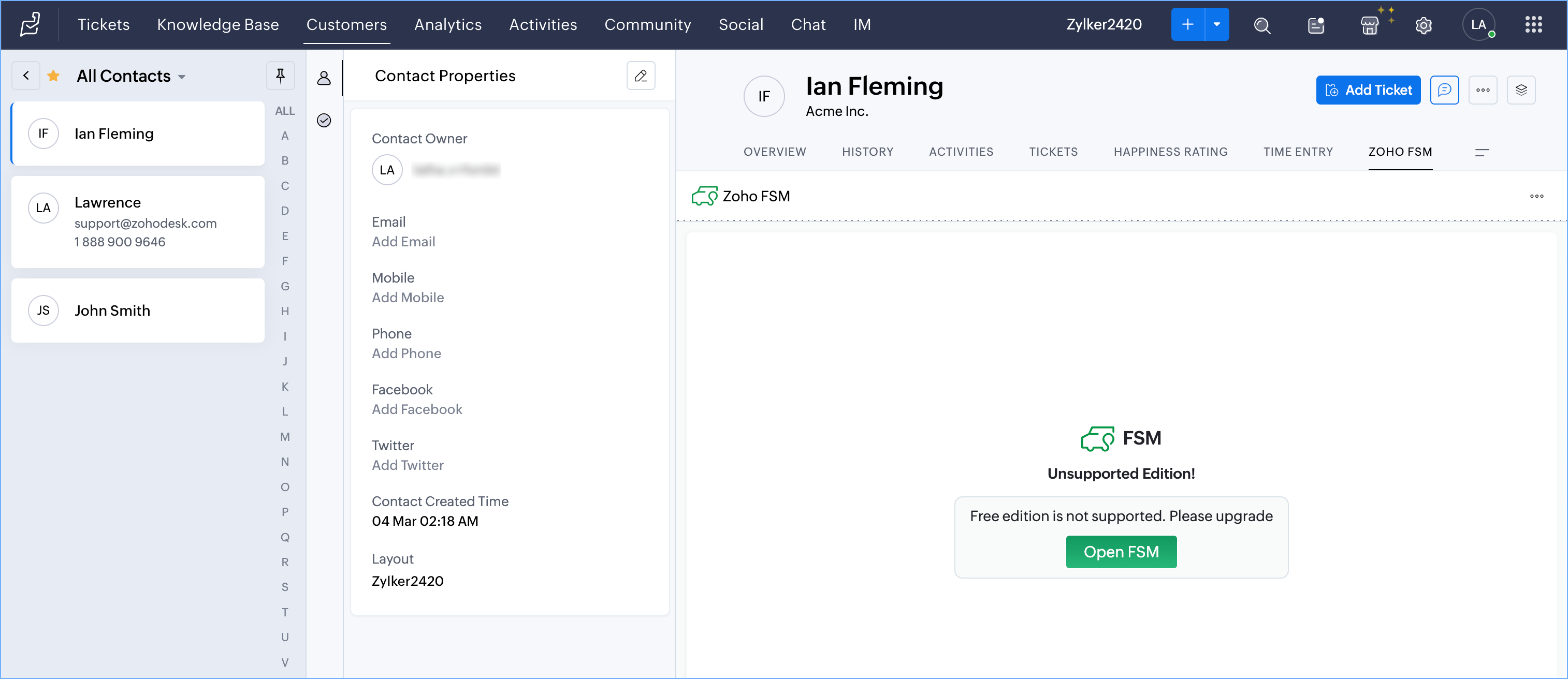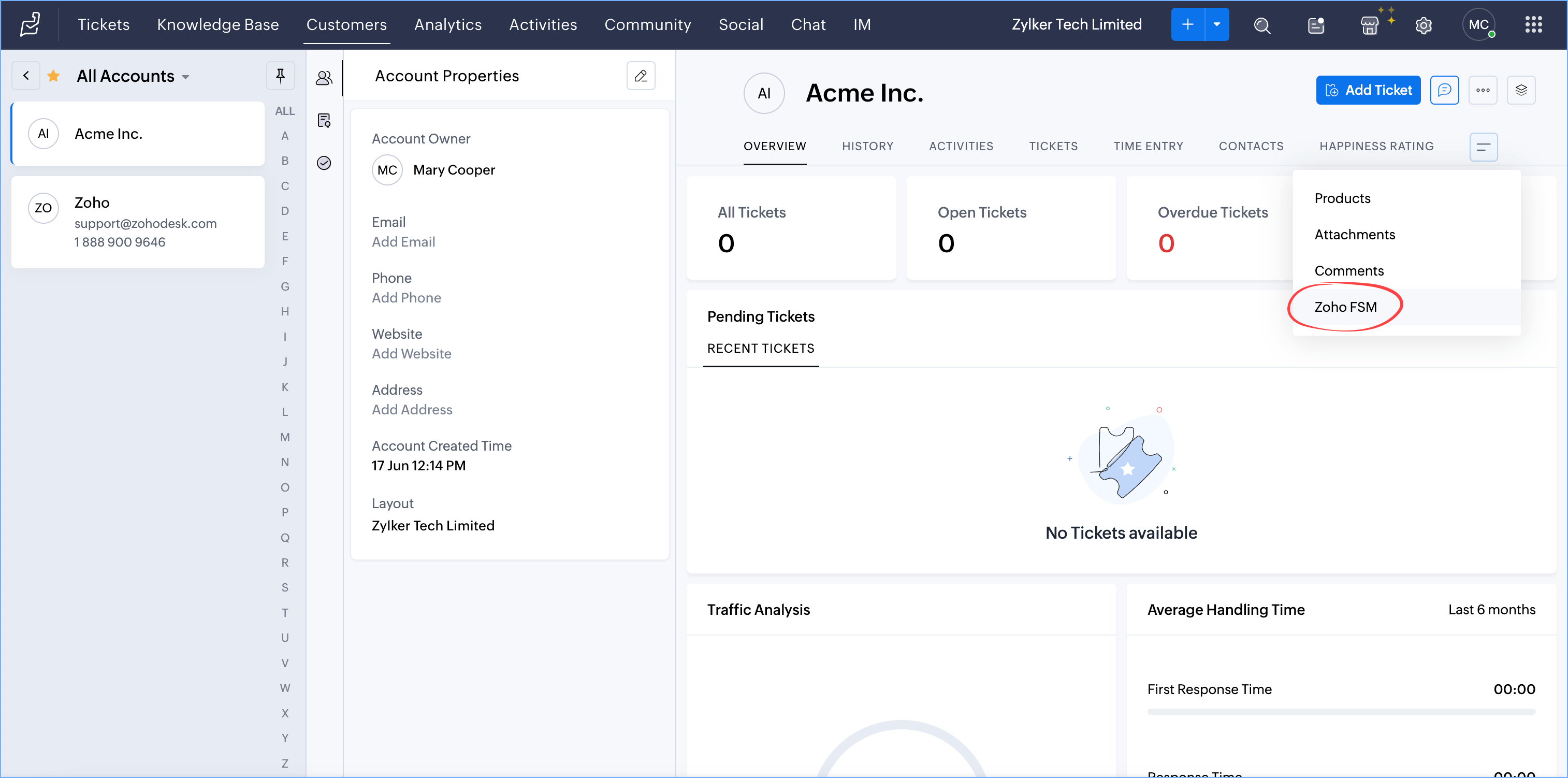 - From Tickets/Accounts/Contacts, select a record and click Zoho FSM.