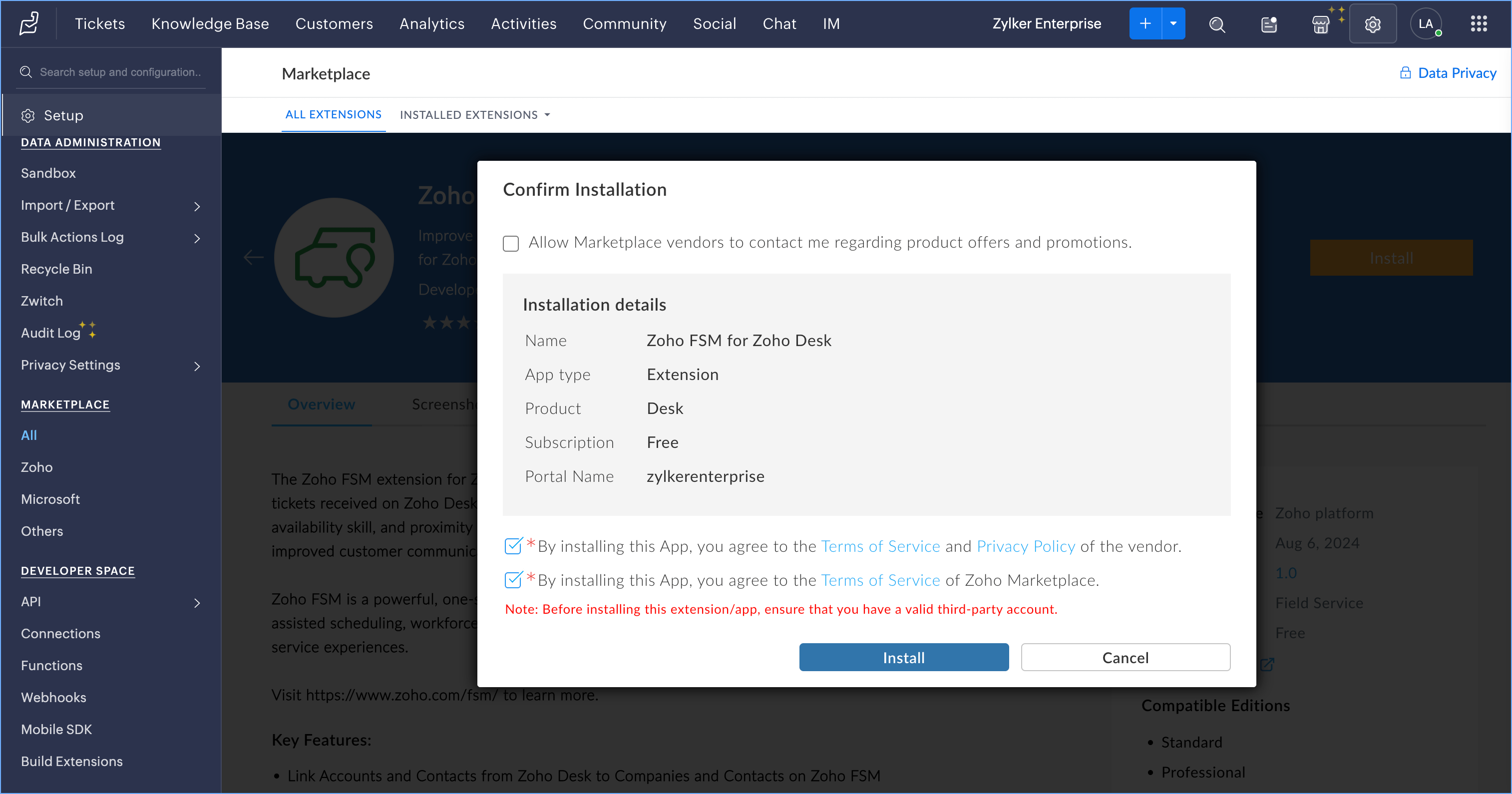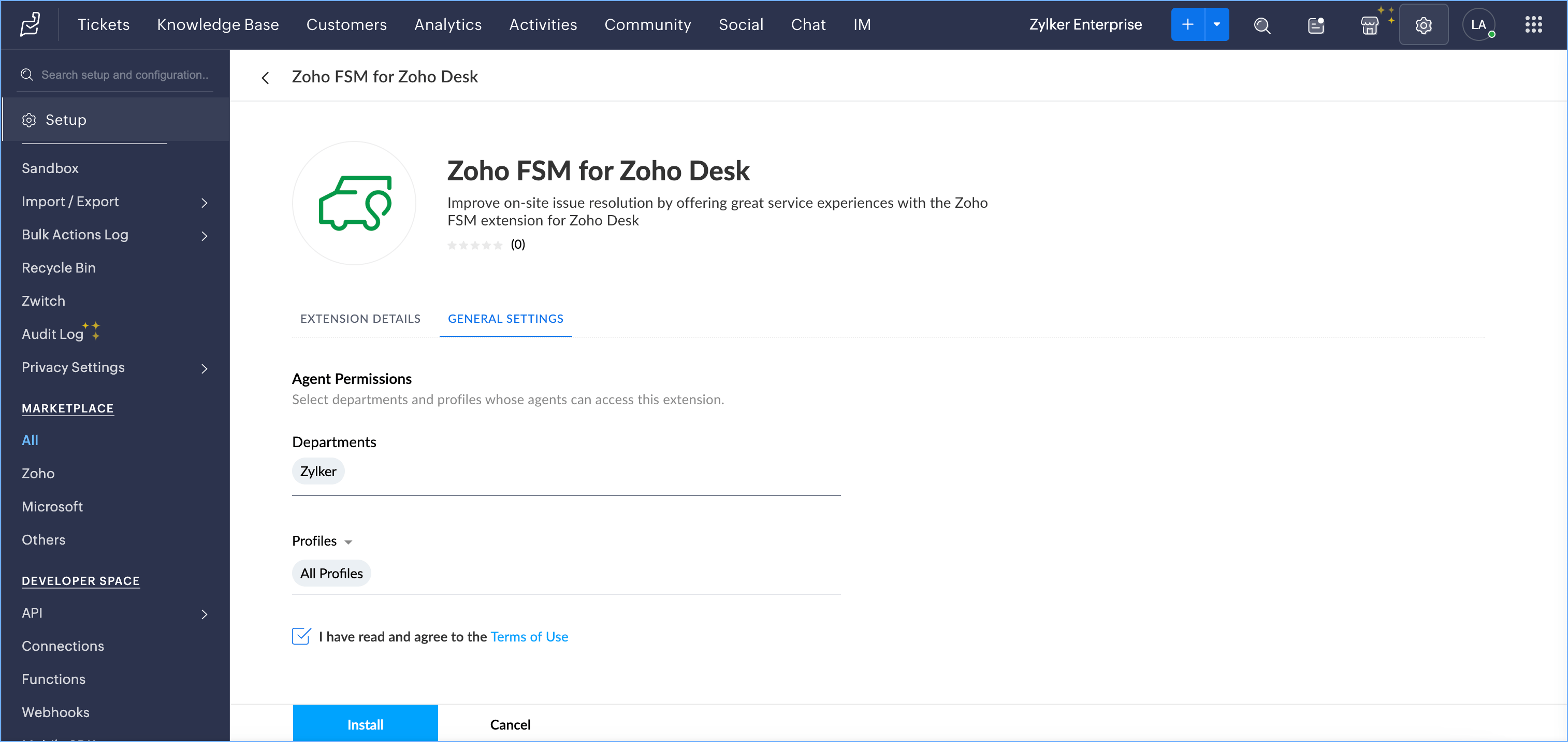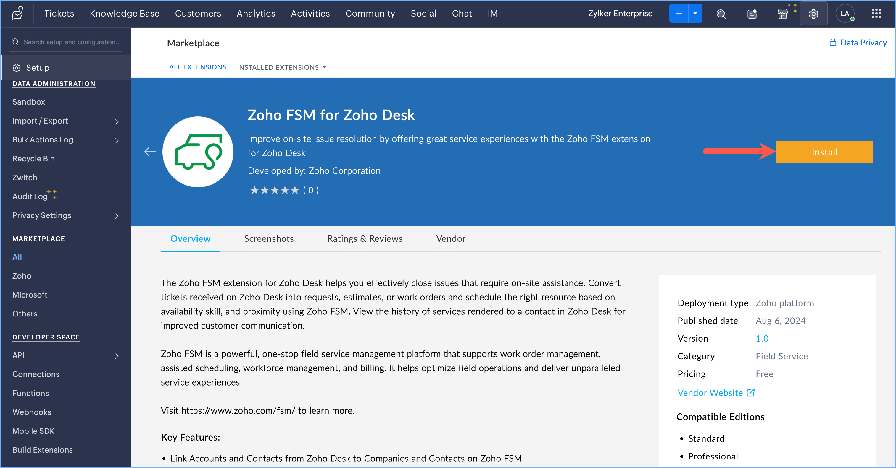 You can install Zoho FSM for Zoho Desk either from