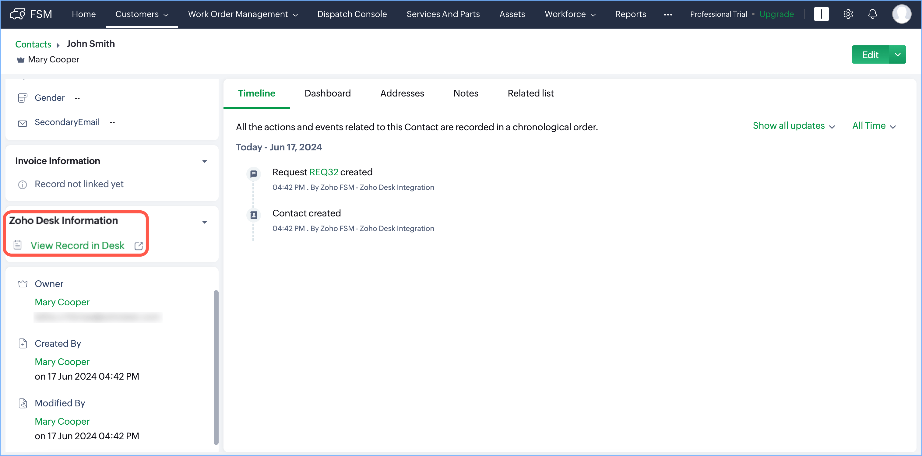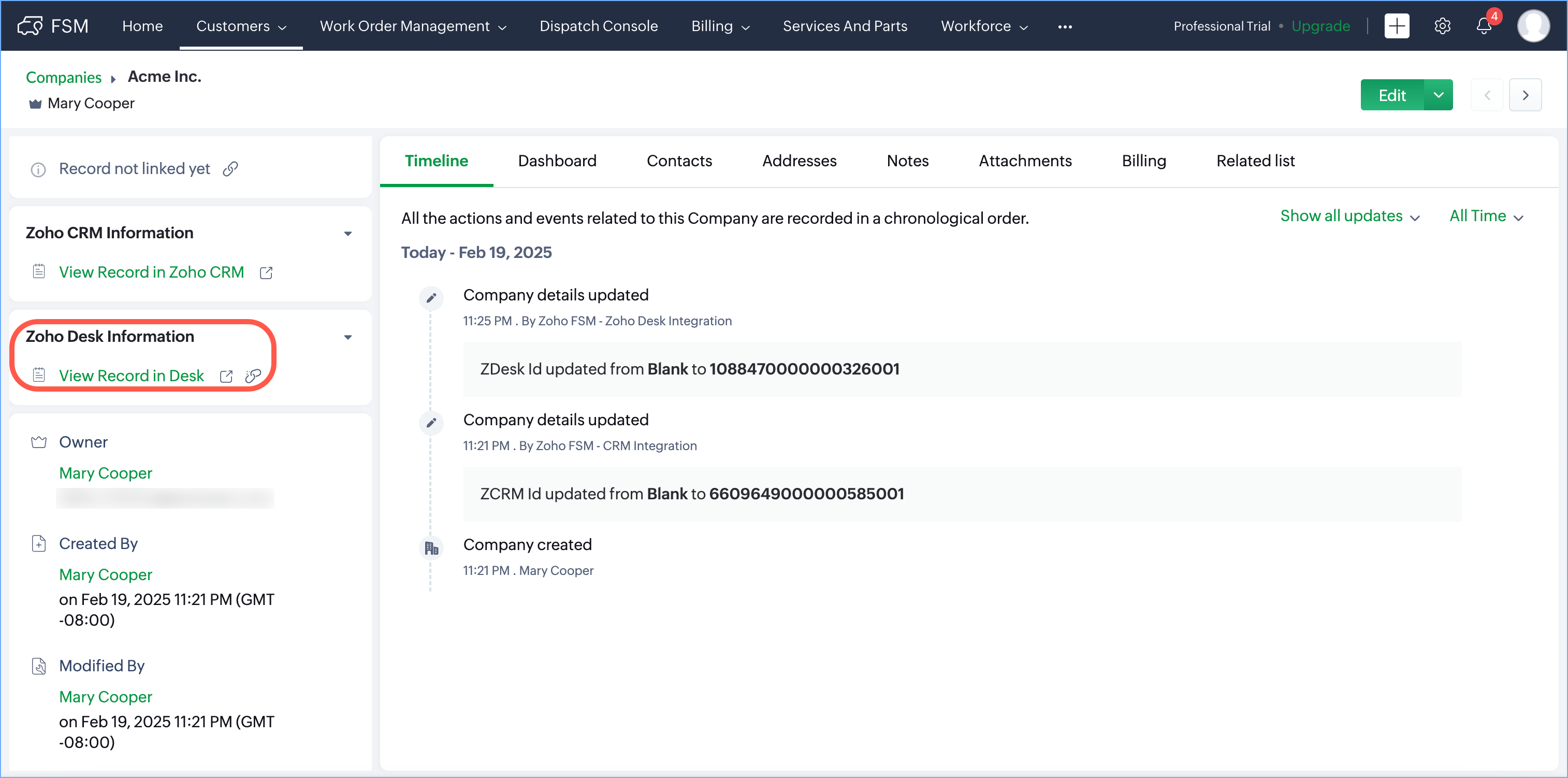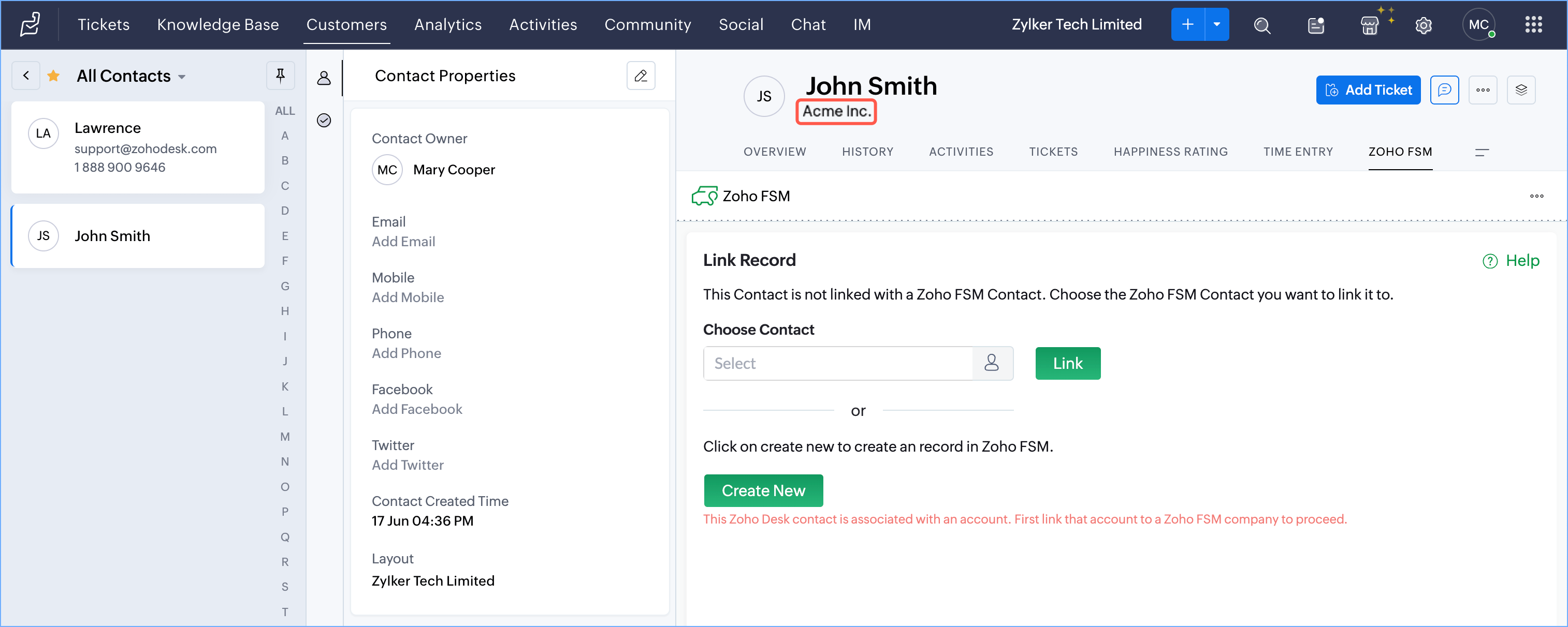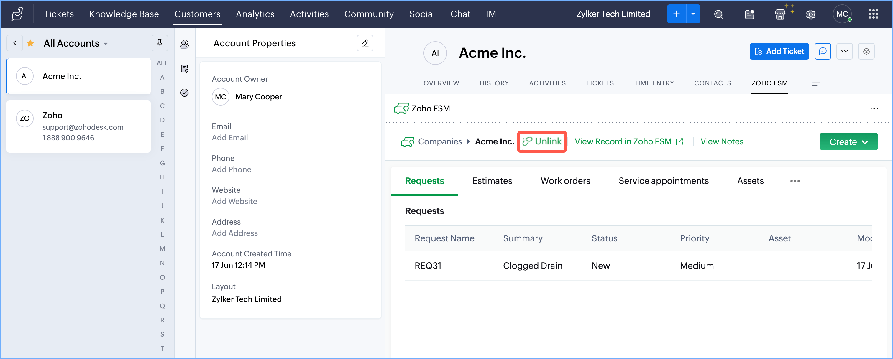 Link/Unlink Zoho Desk Customers to Zoho FSM Customers
