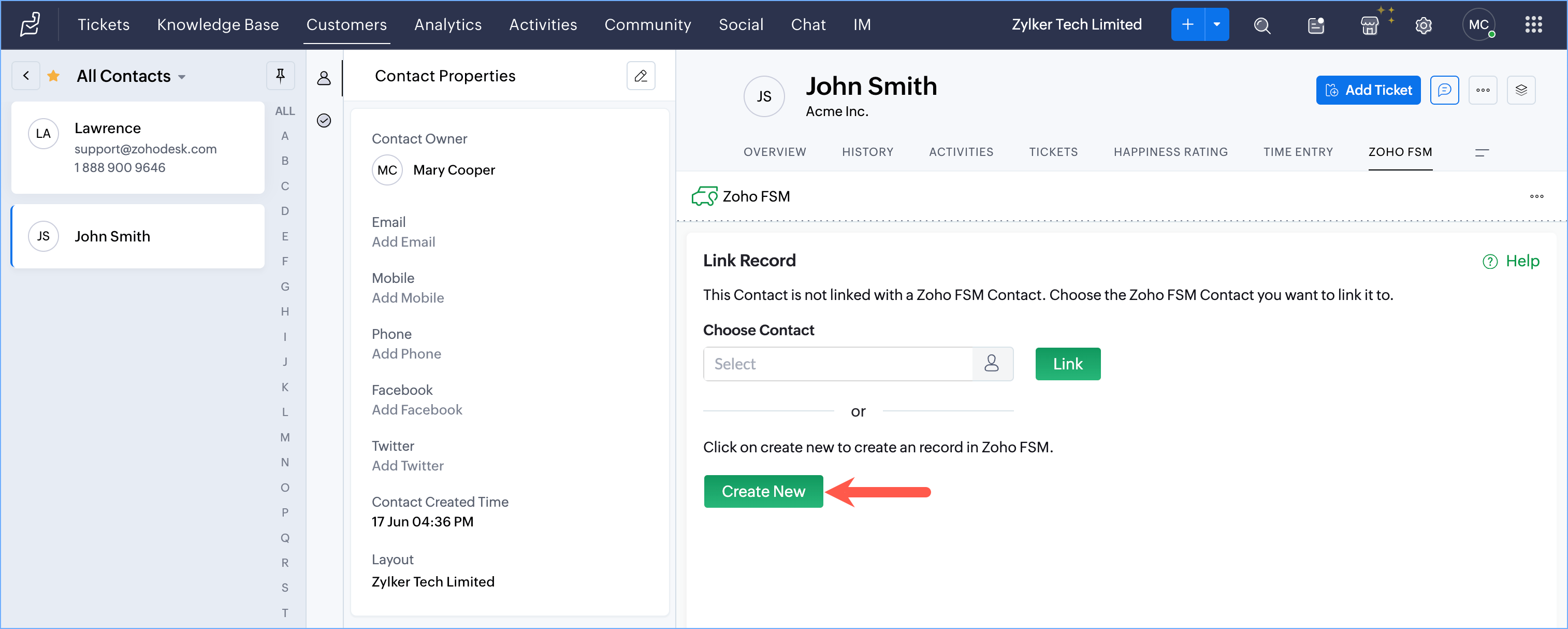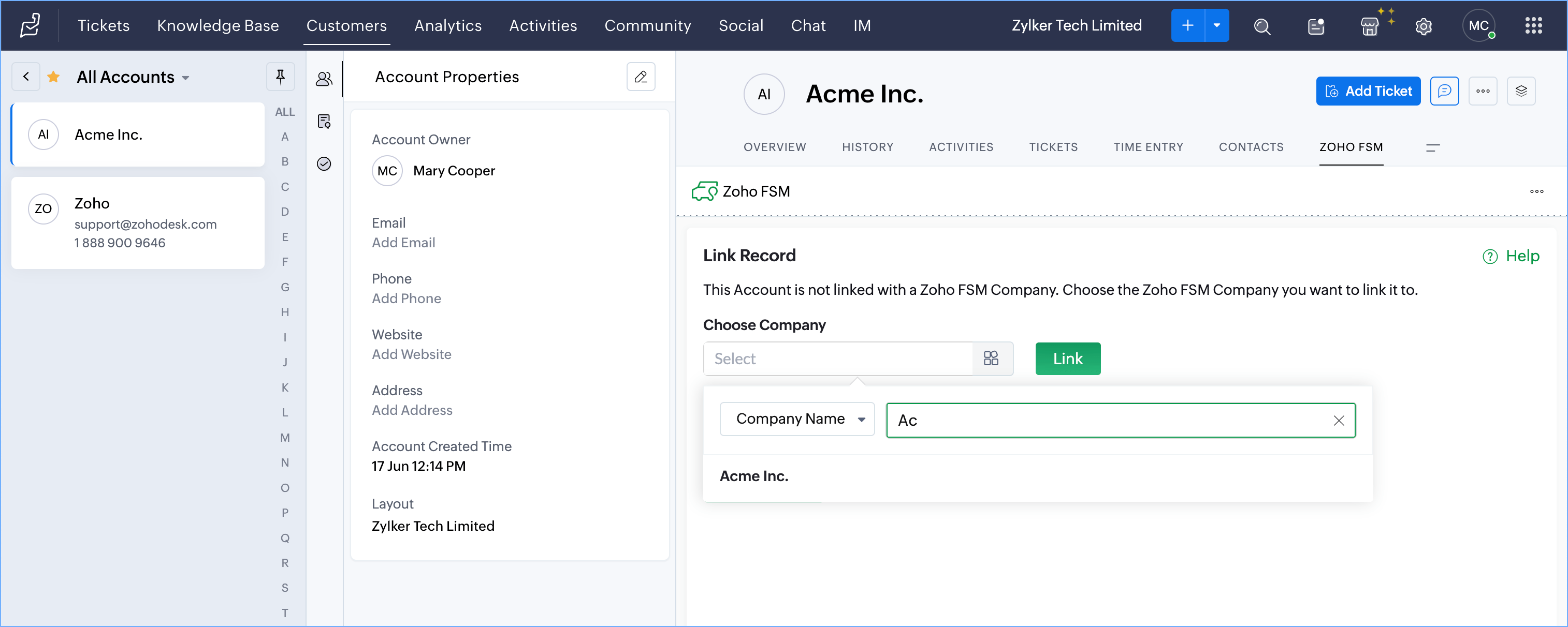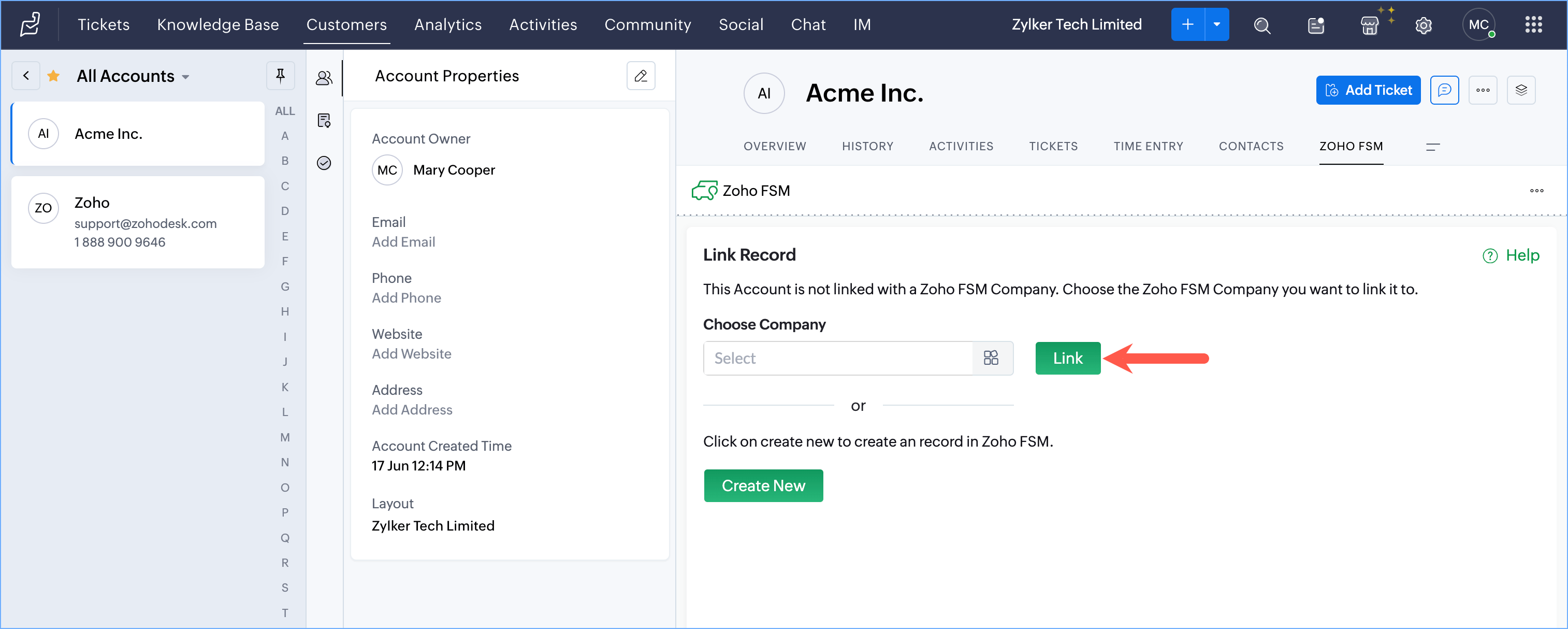 To link a Zoho Desk Customer to a Zoho FSM Customer: