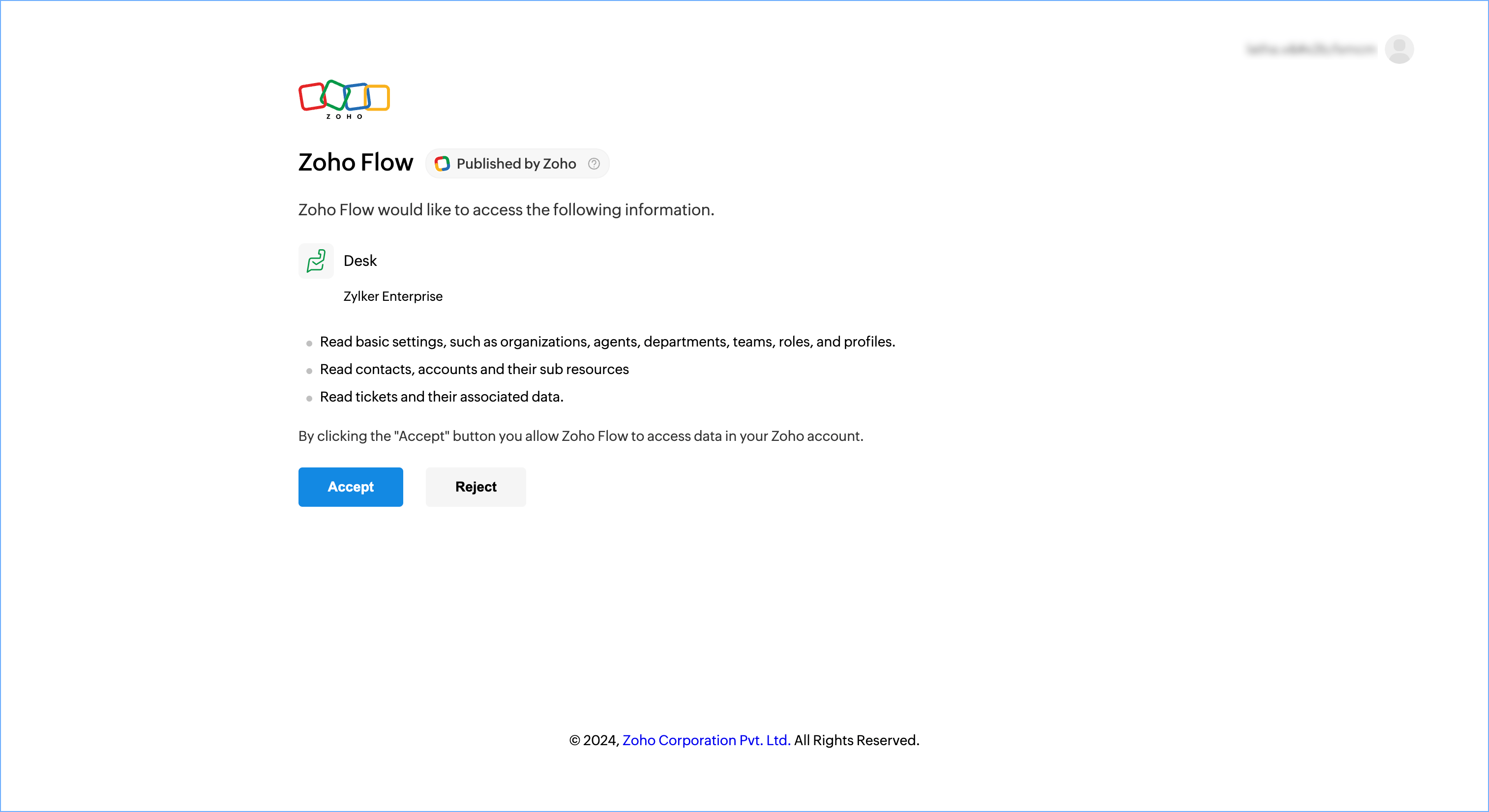 - Click Accept to allow access to your Zoho Desk data.