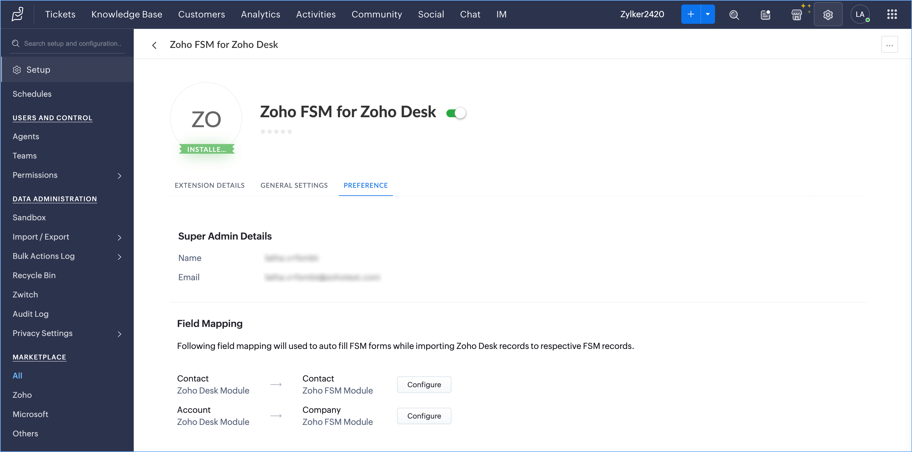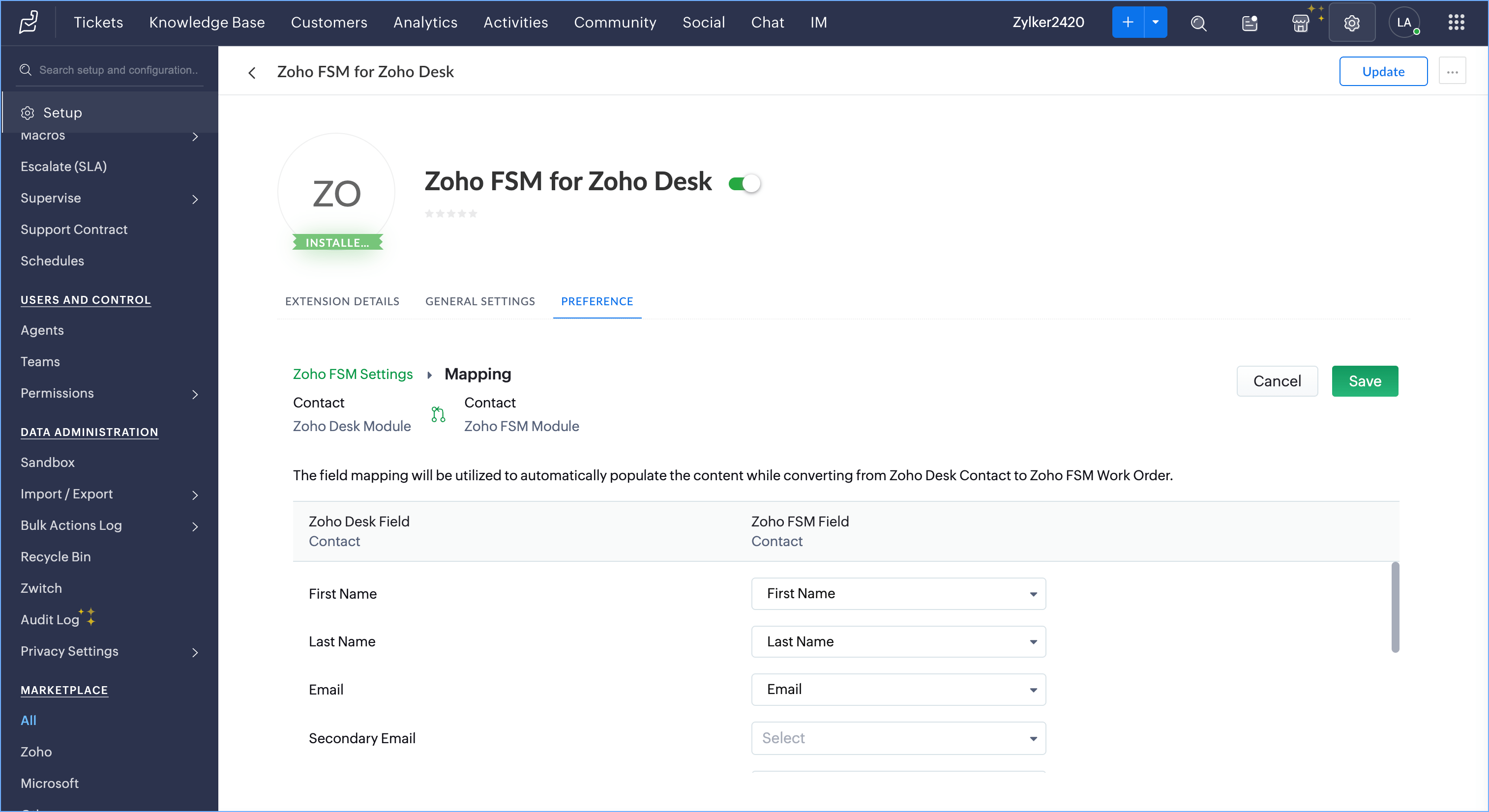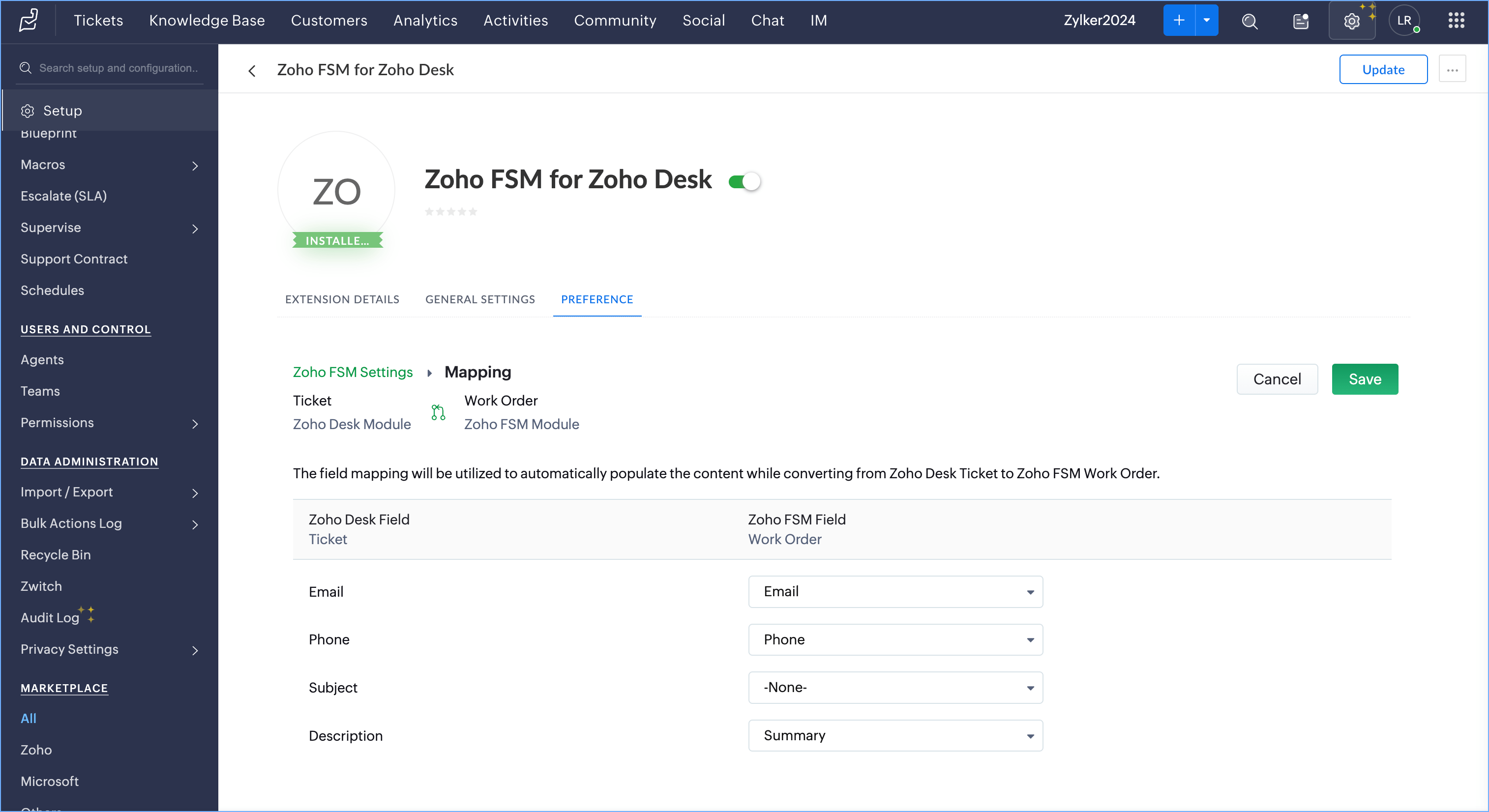 You can manage these field mappings at any time. Navigate to Setup > Marketplace > All. Under Installed Extensions, click Zoho FSM for Zoho Desk. You will find the Field Mapping under the Preference tab.