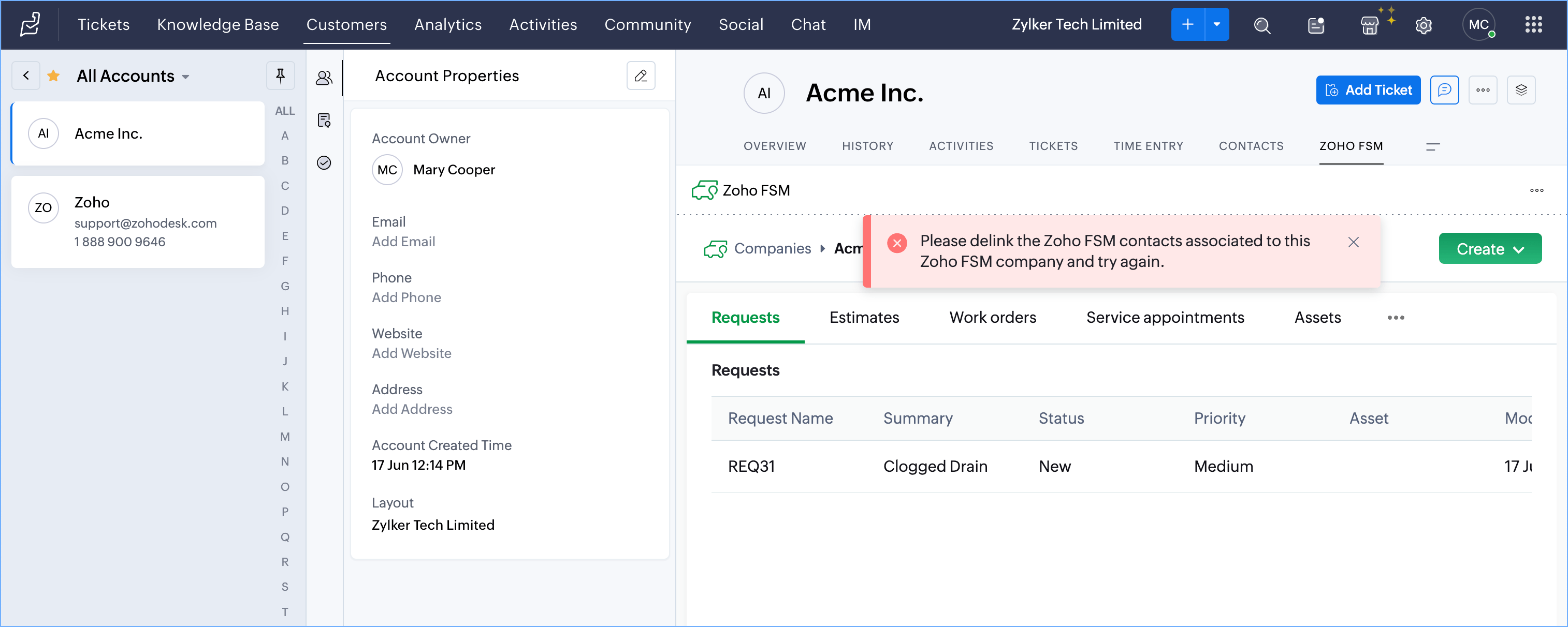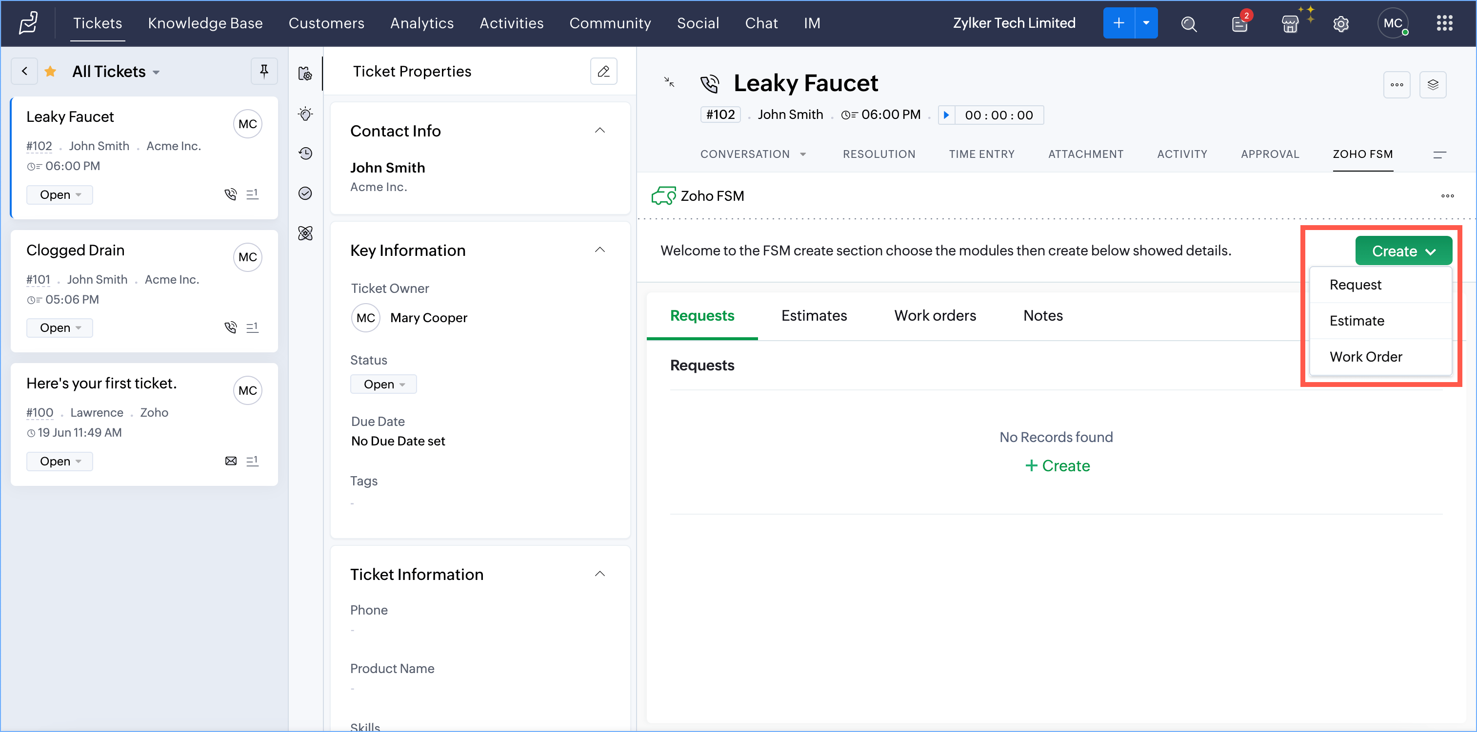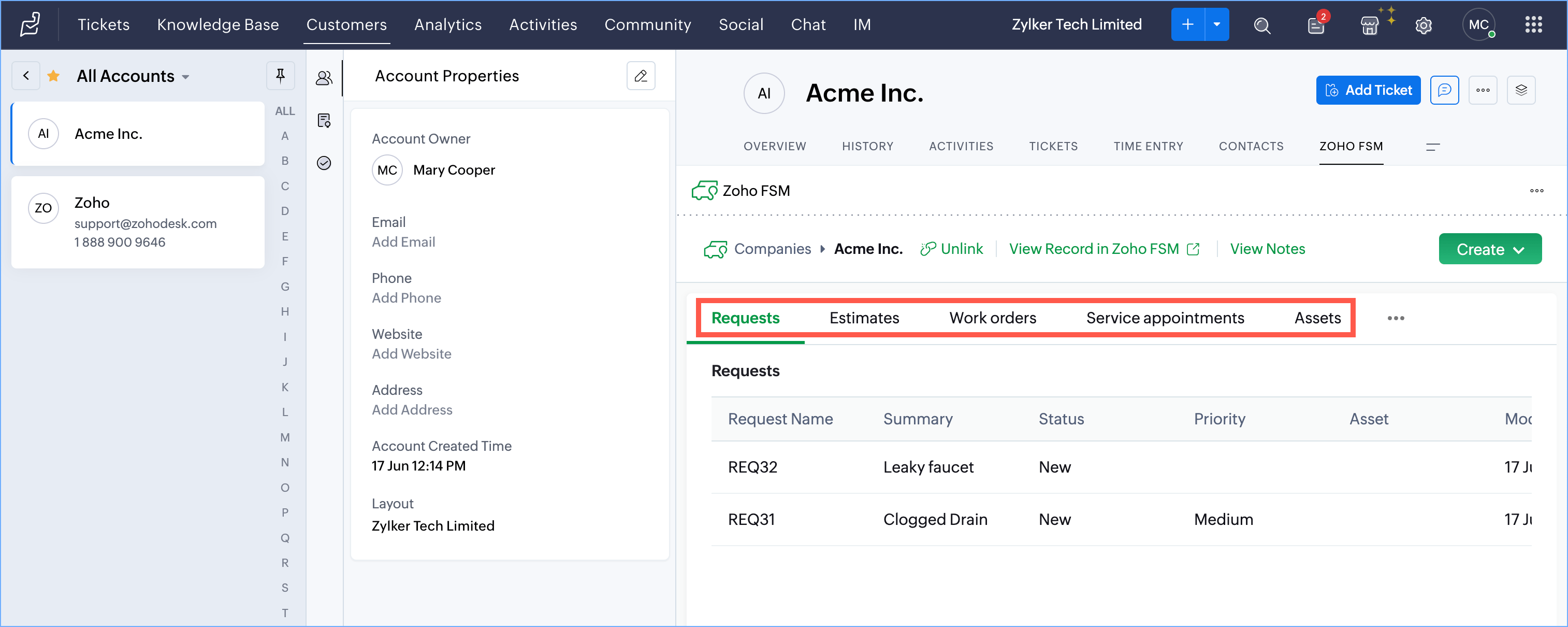 - Create Zoho FSM Requests, Estimates, and Work Orders from a Zoho Desk Ticket, Account or Contact