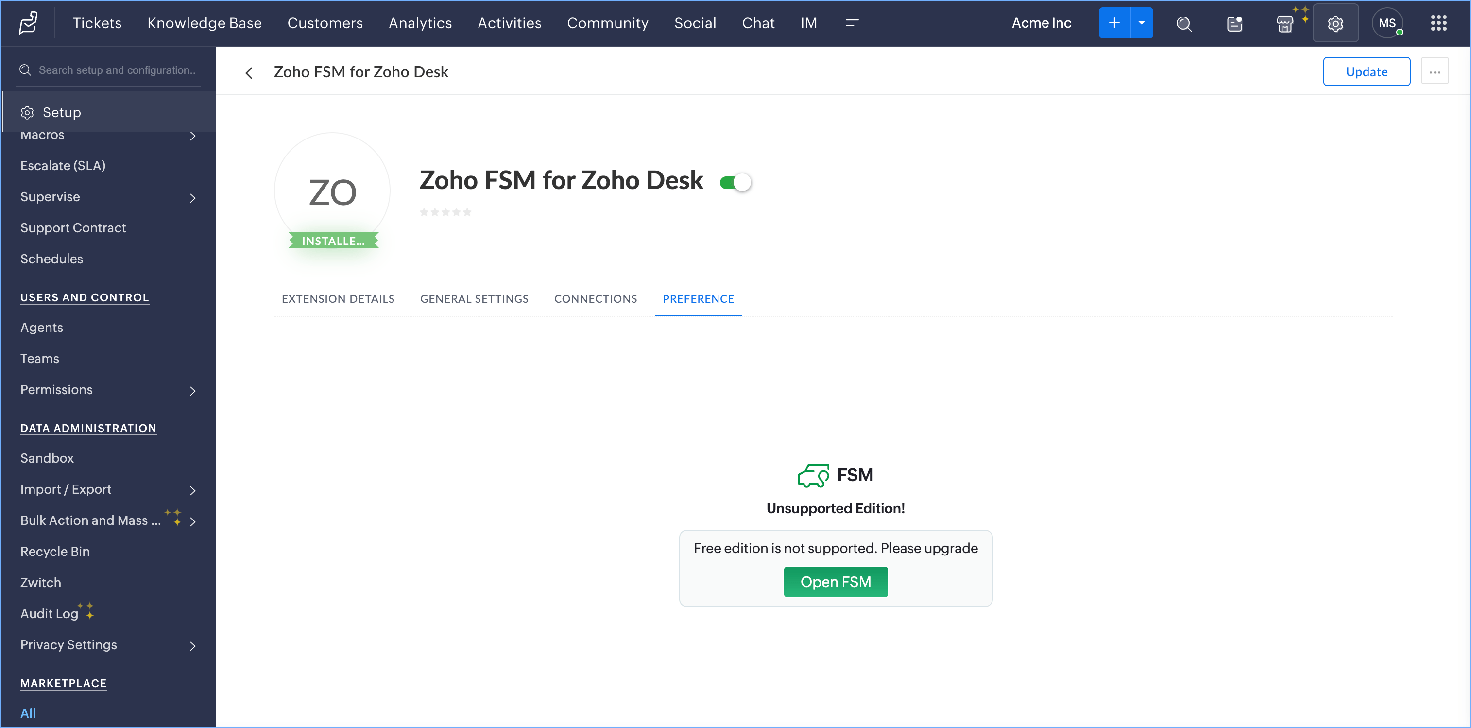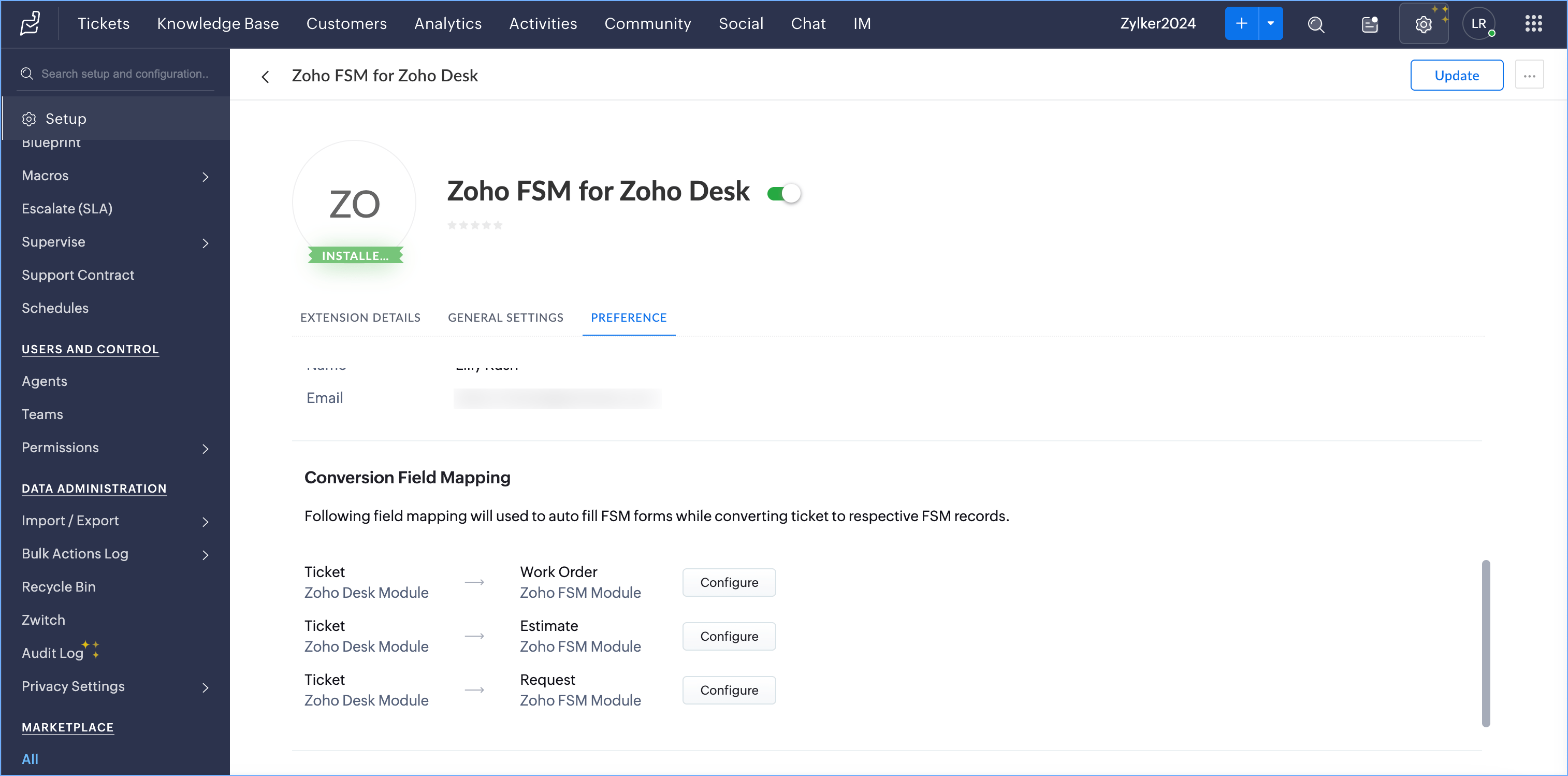You can manage these conversion field mappings at any time. In Zoho Desk, navigate to Setup > Marketplace > All. Click the Installed Extensions tab, and click Zoho FSM for Zoho Desk. You will find the Conversion Field Mapping under the Preference tab.