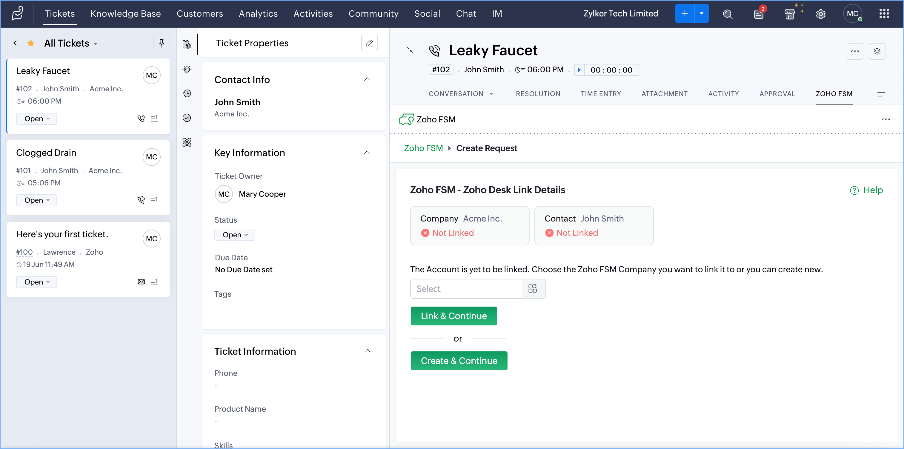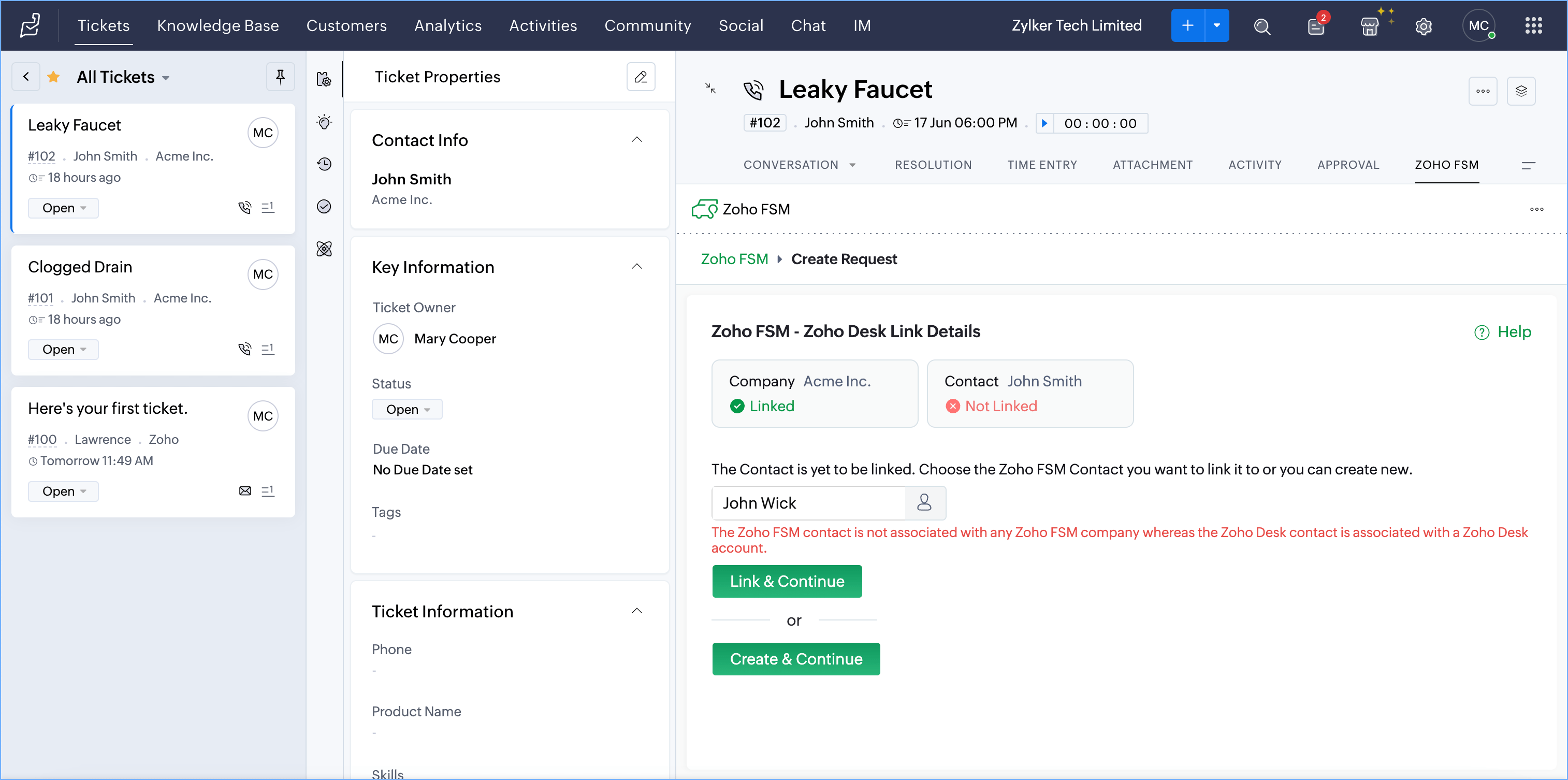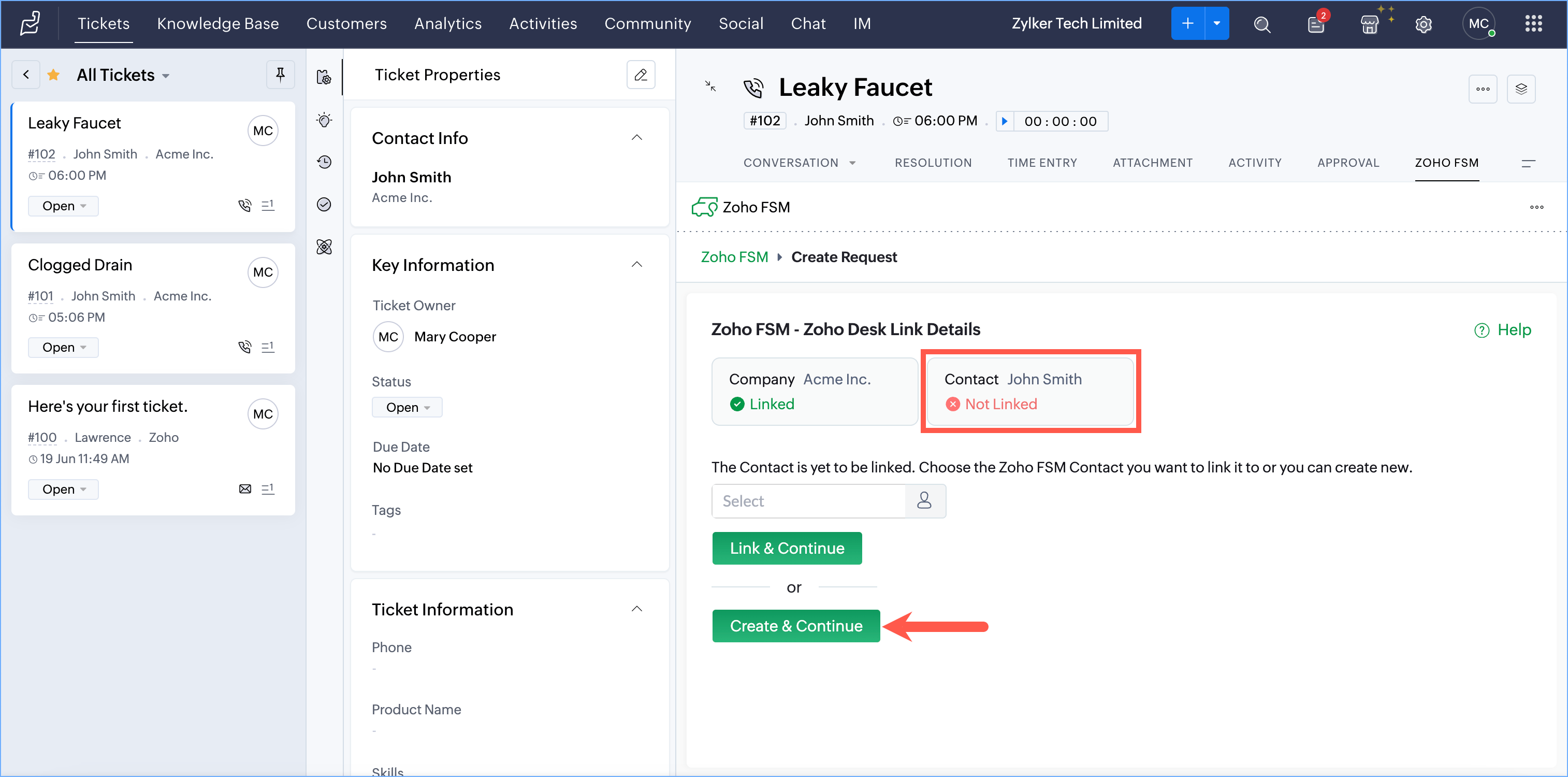 If there is a Company and Contact associated with the ticket, after the Company has been linked, click on Create & Continue to create the Contact too in Zoho FSM.