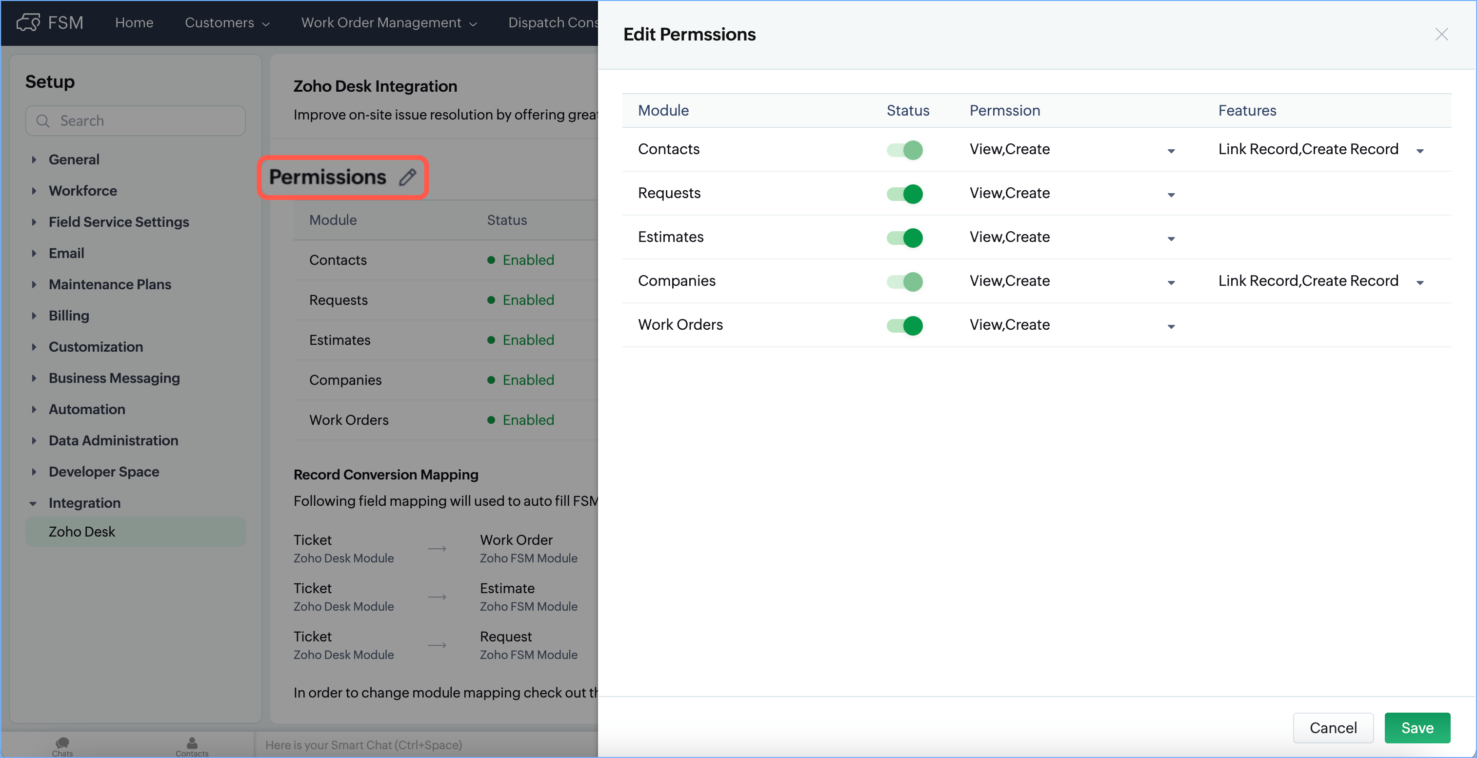 creating records for Zoho FSM modules within Tickets in Zoho Desk, some of the details are prefilled in the Create forms. There are field mappings that determine which field values get copied from the Zoho FSM modules to the Tickets module. To manage these mappings, do the following:
