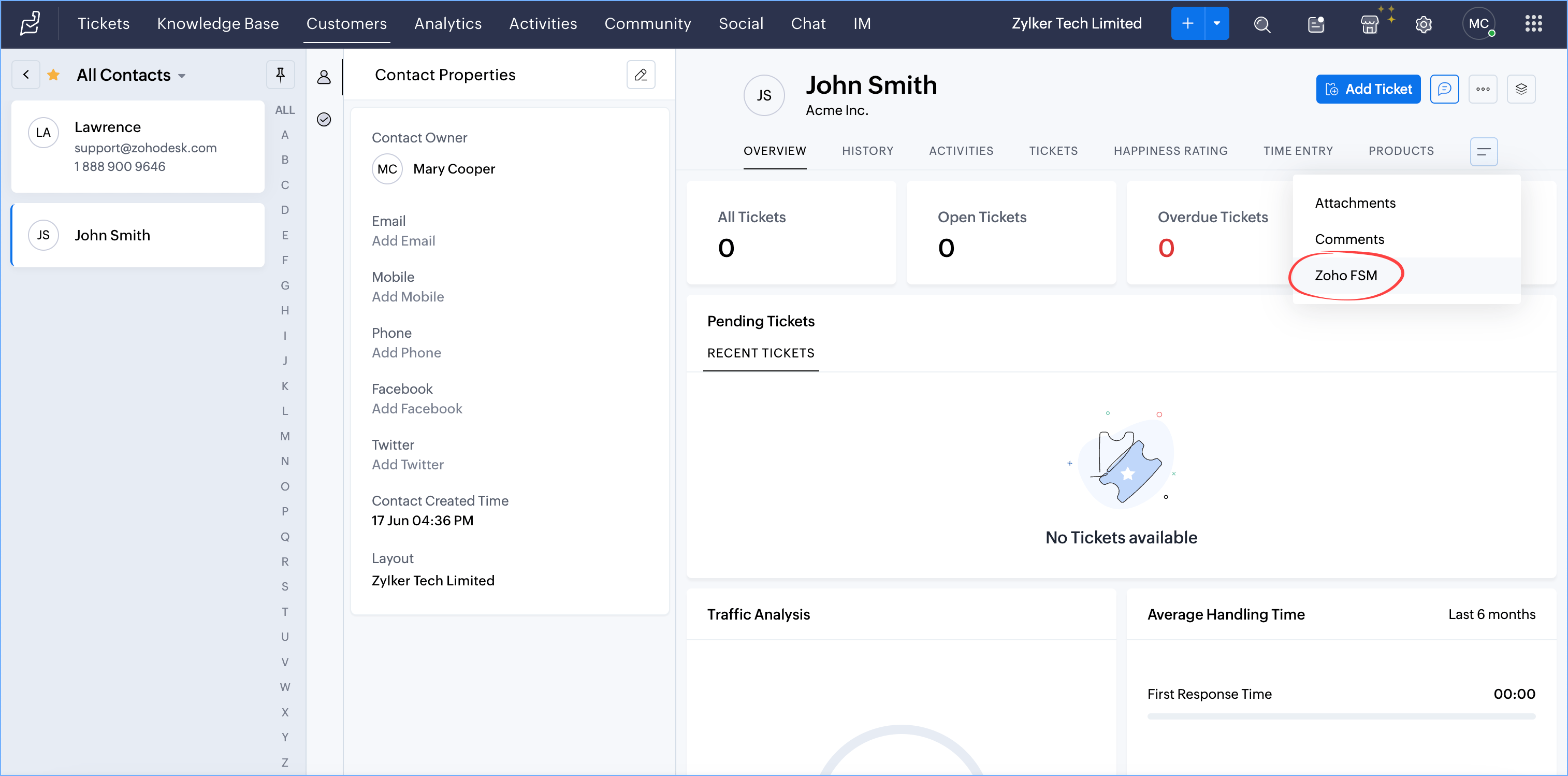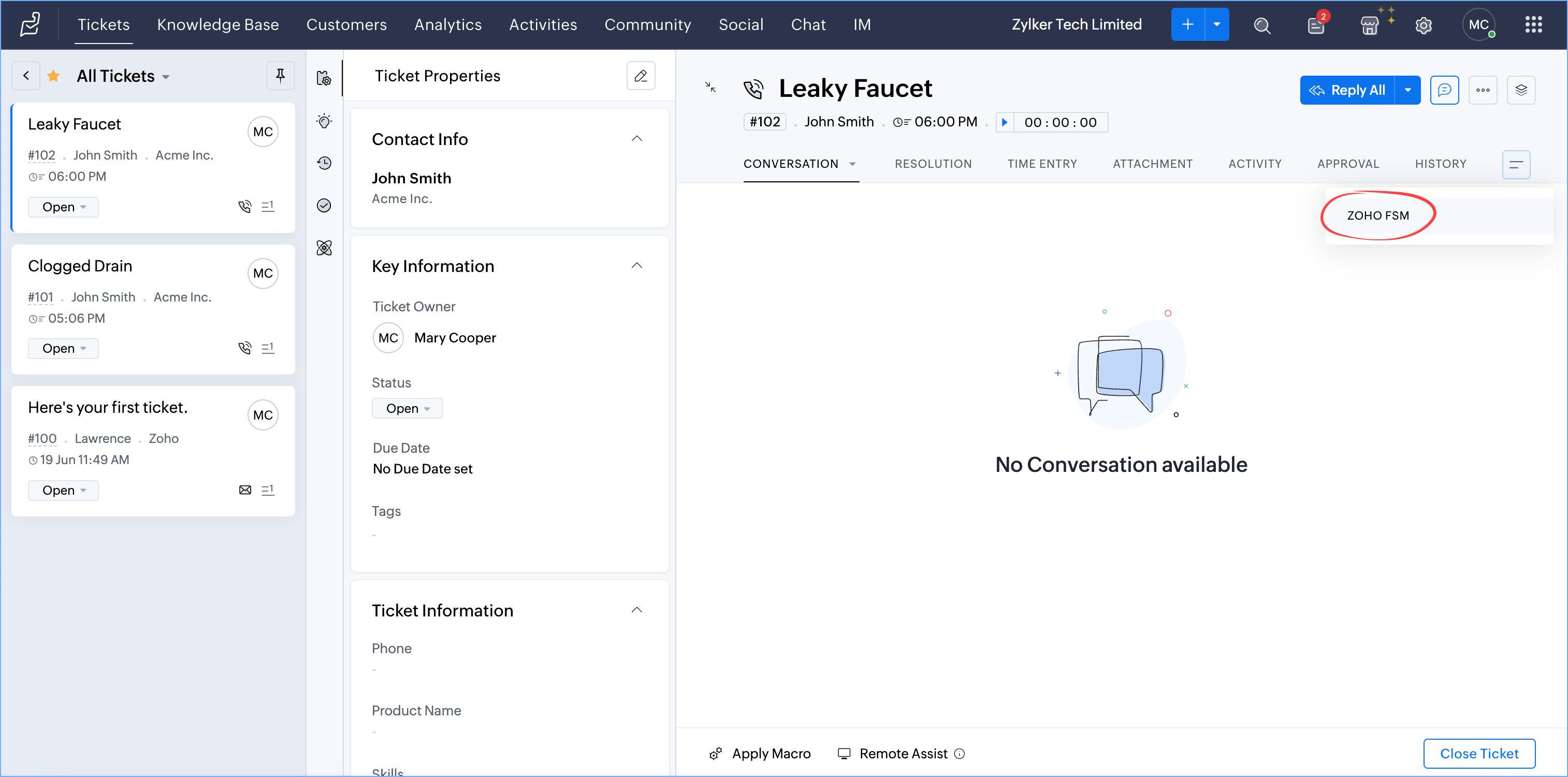 - From Tickets, select a record and click the Zoho FSM tab.
