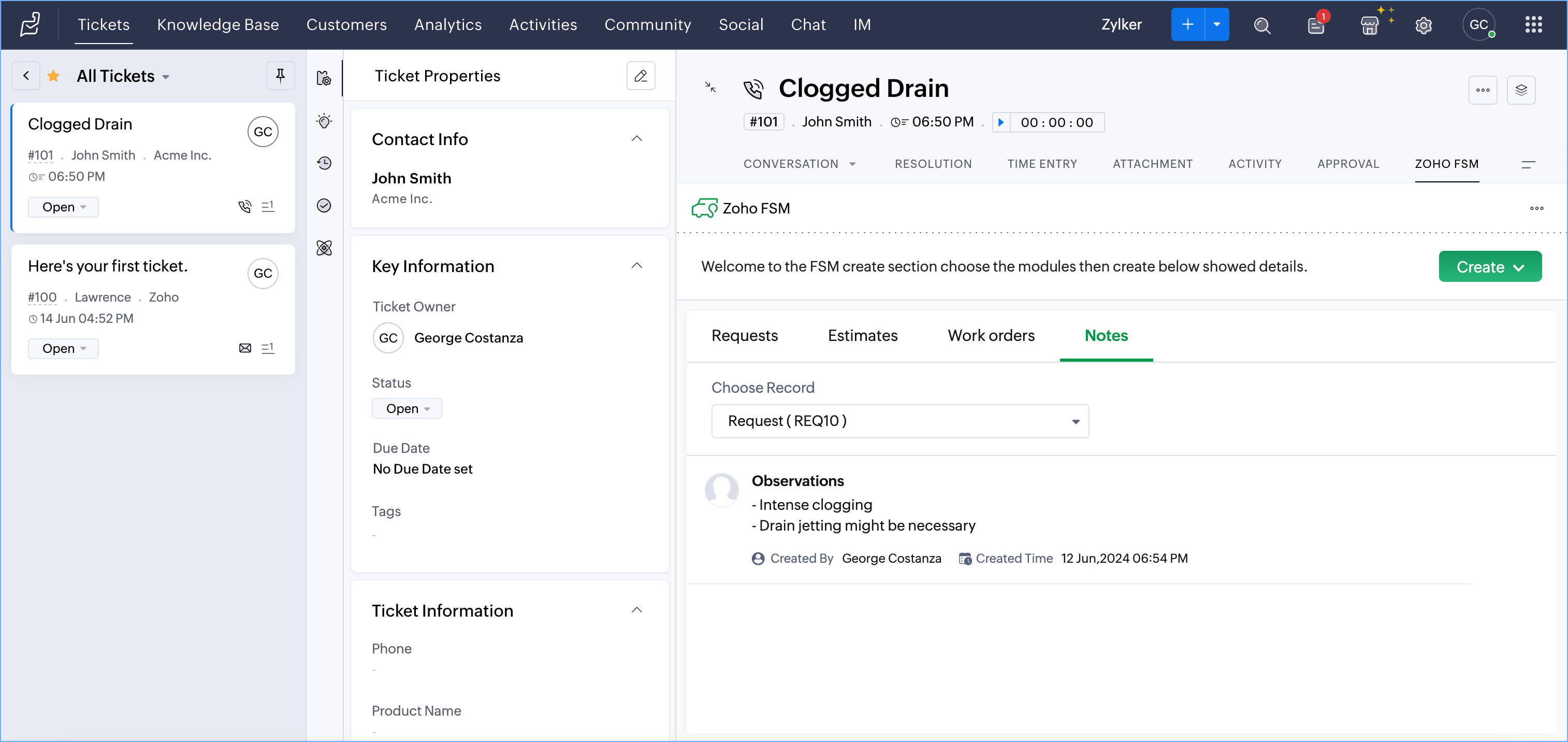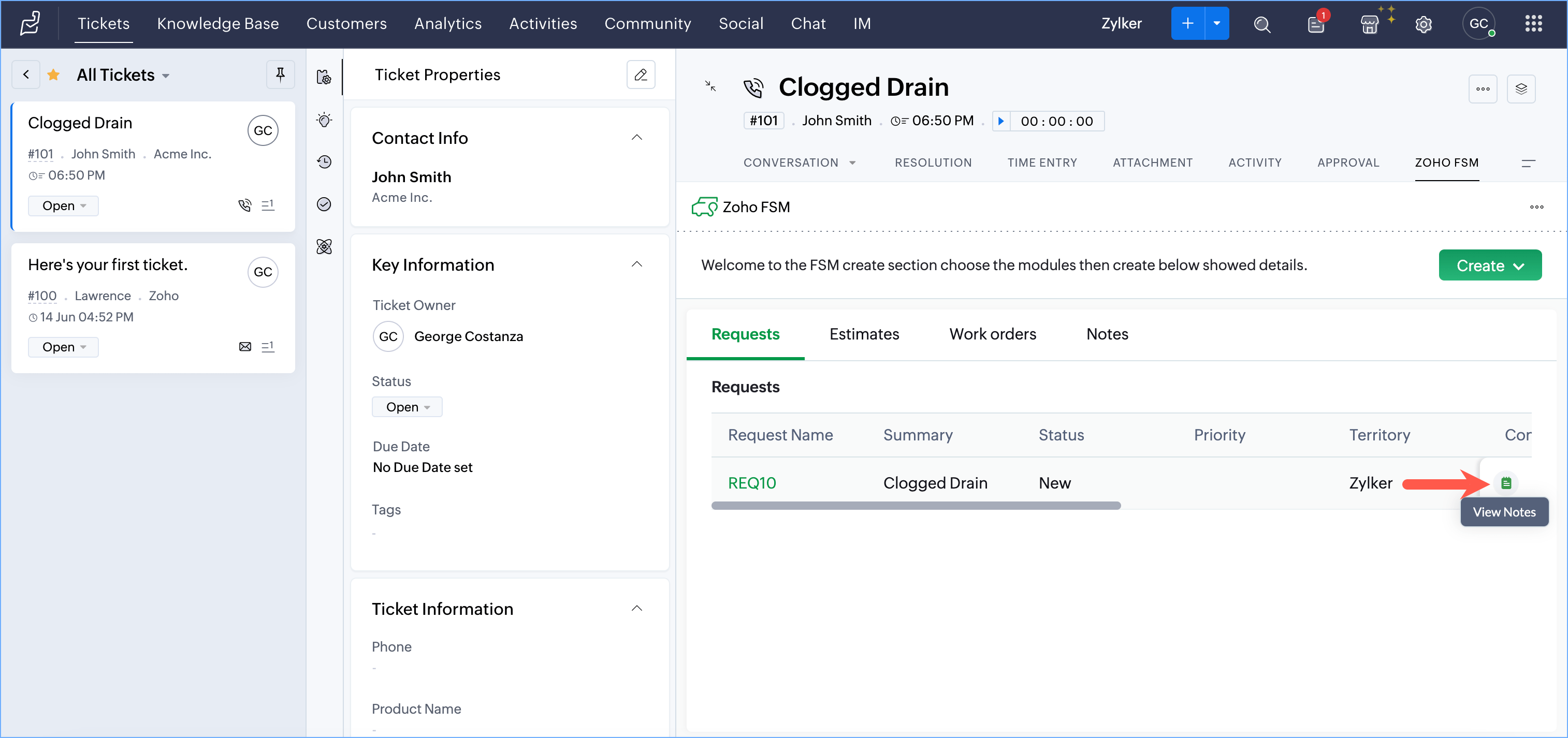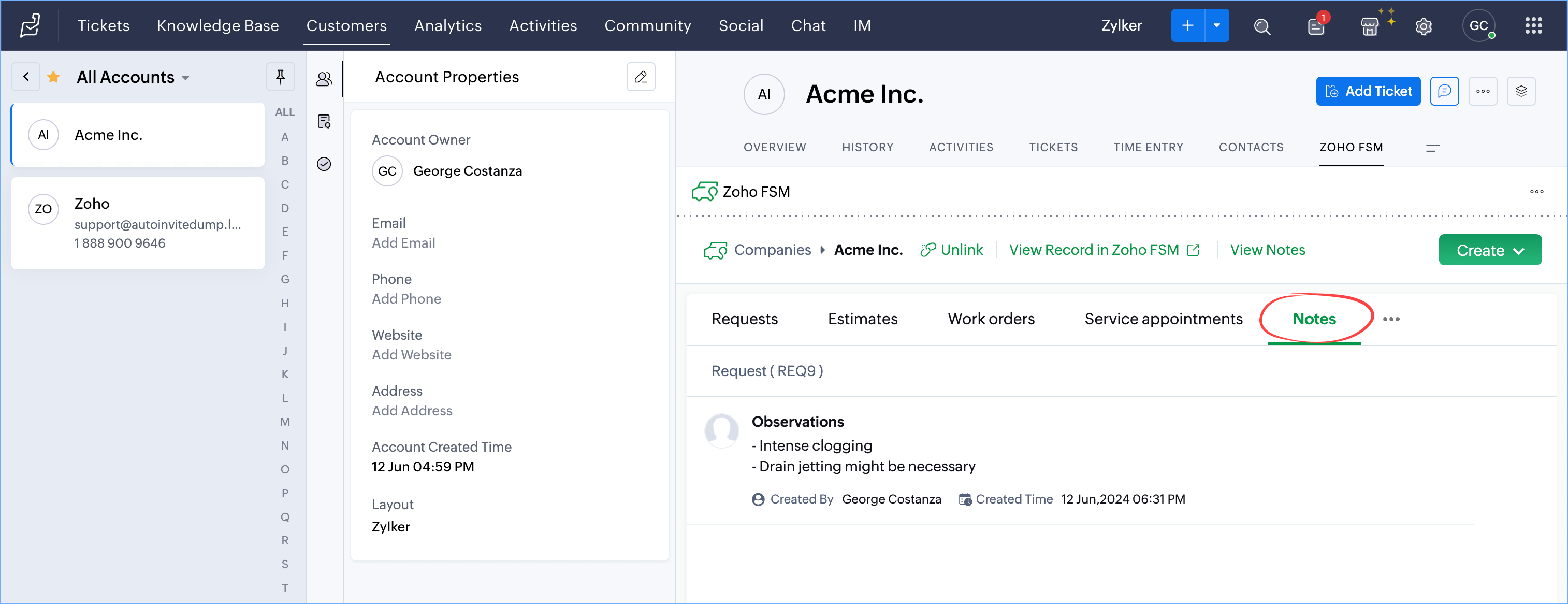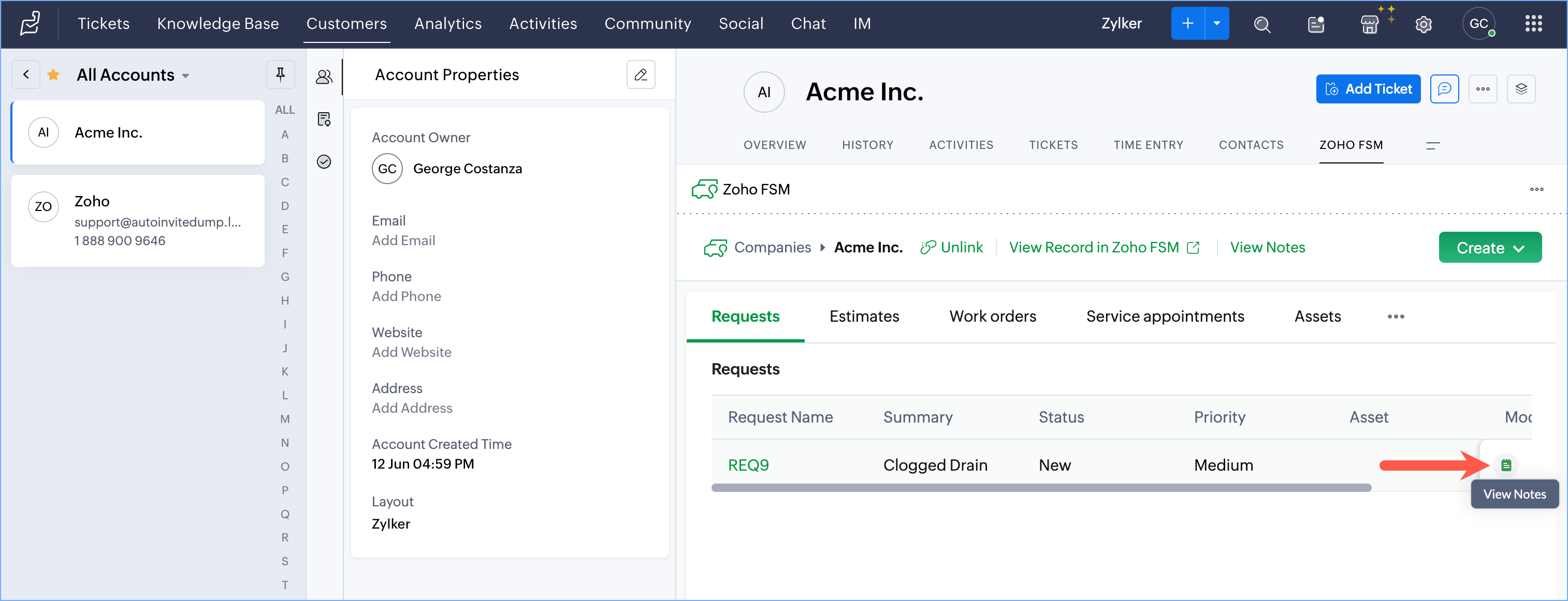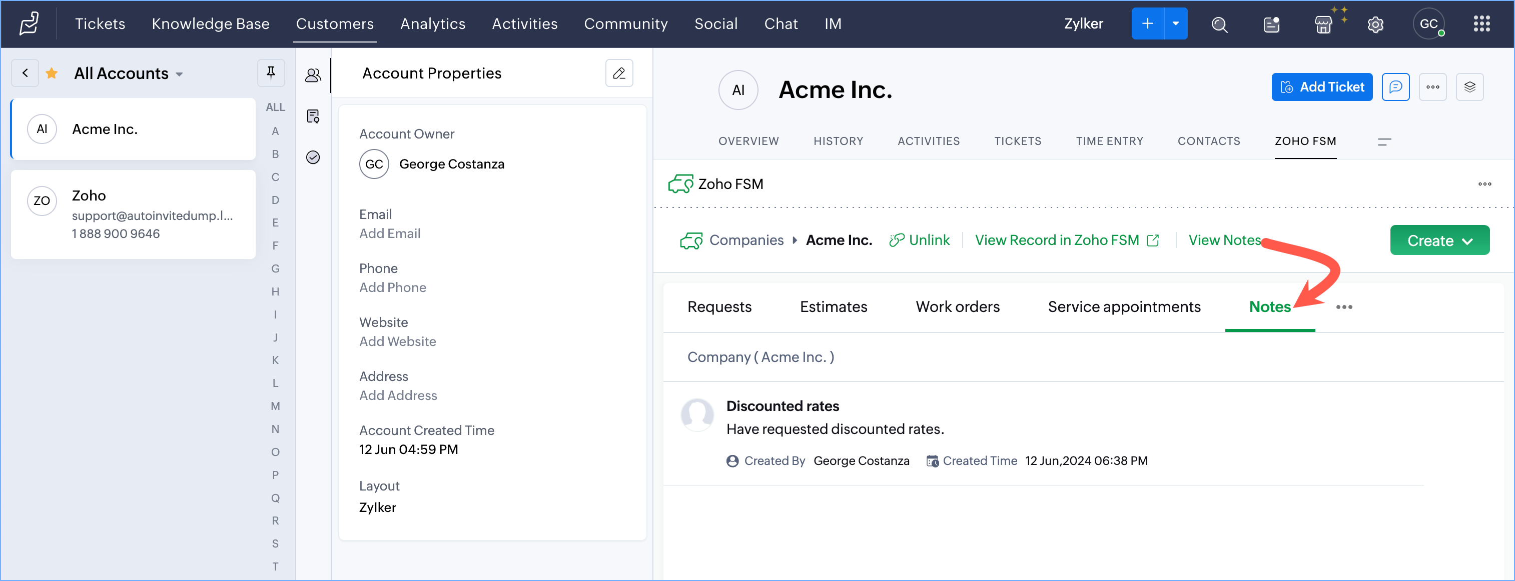 - Within a Contact, or Account record in Zoho Desk, you can view the notes added to it from Zoho FSM. You can also view the notes added to the Request, Estimate, Work Order, Service Appointment, and Asset records associated with the Contact, or Account record.