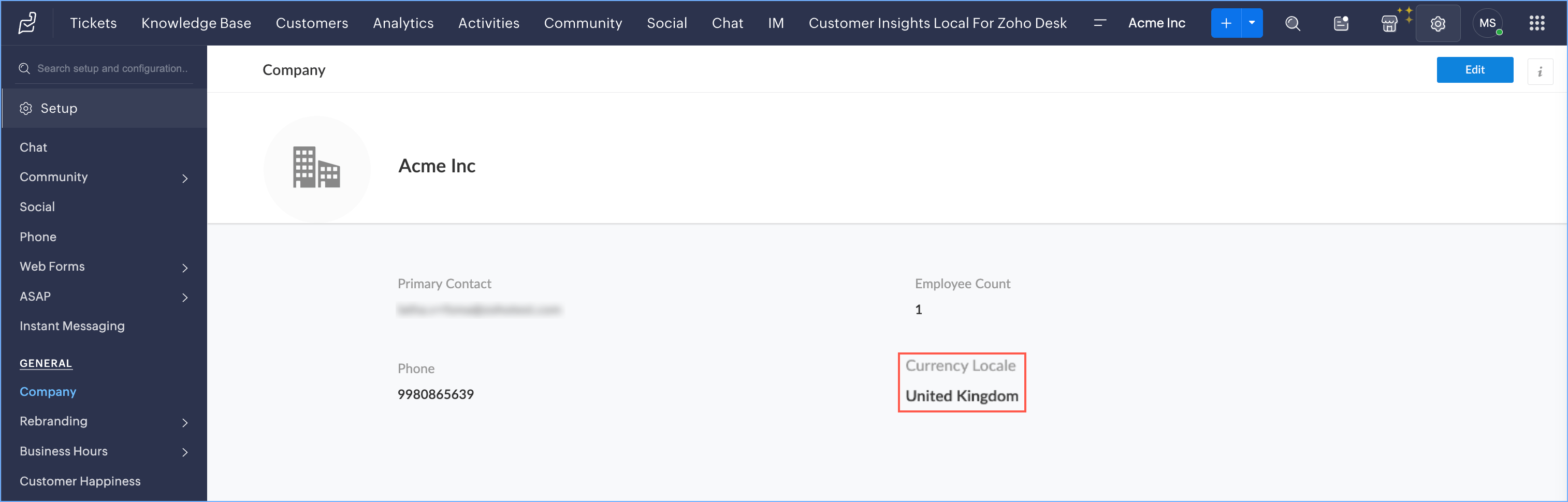 In Zoho Desk, the locale information can be found at Setup > General > Company.
