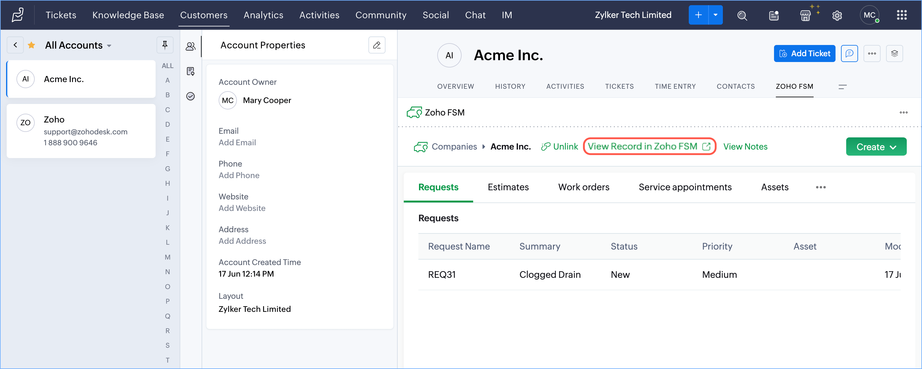 View Record in FSM to view the associated record in Zoho FSM. Once the Zoho Desk Account/Contact record is linked to Zoho FSM, you can