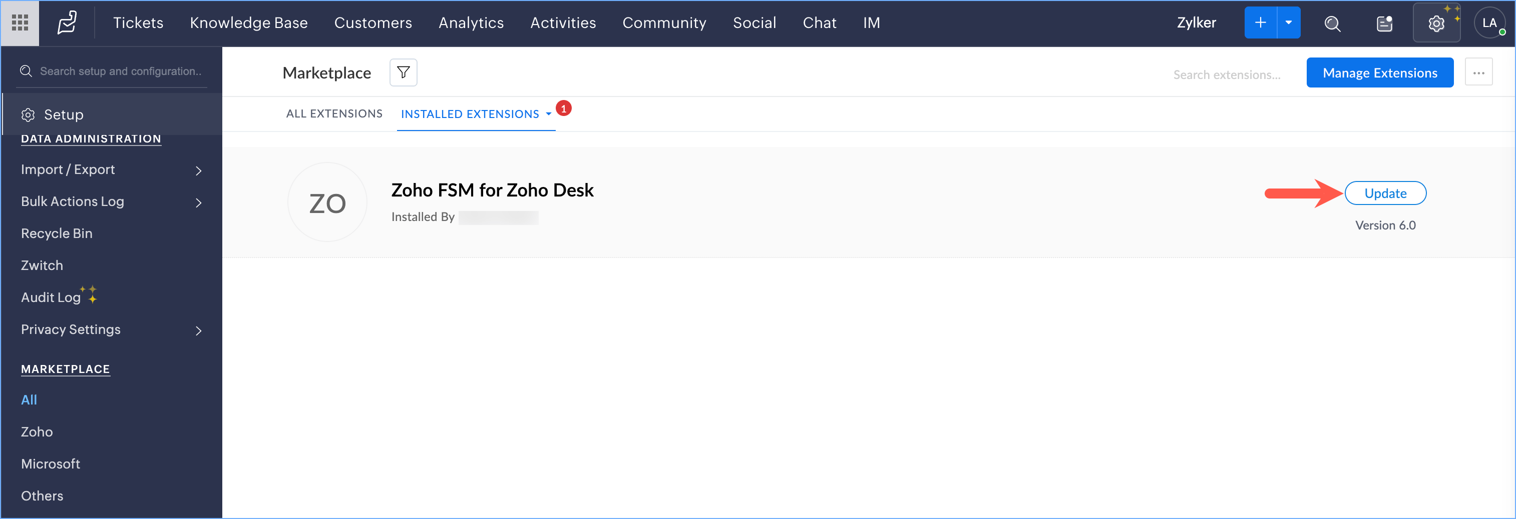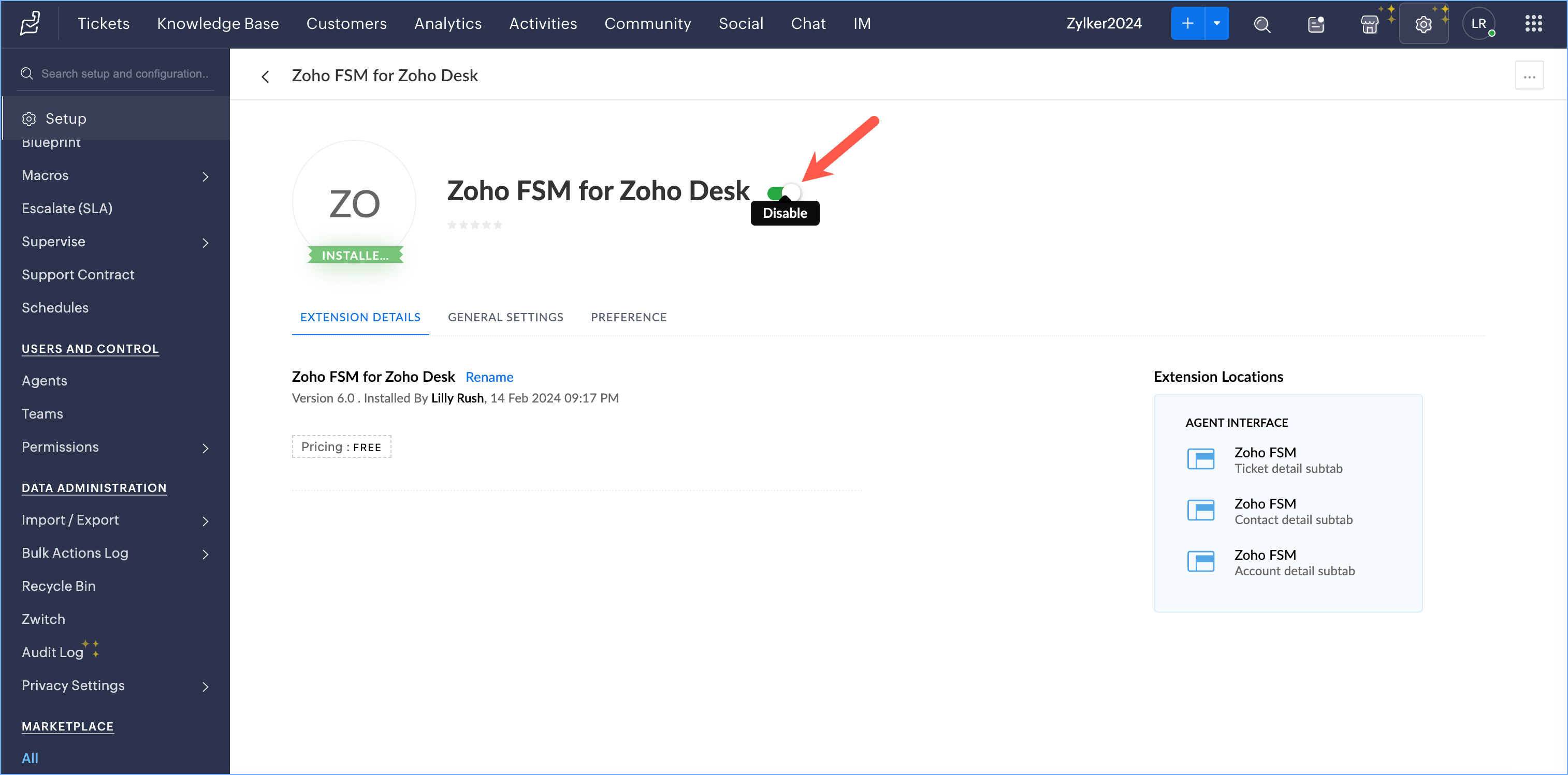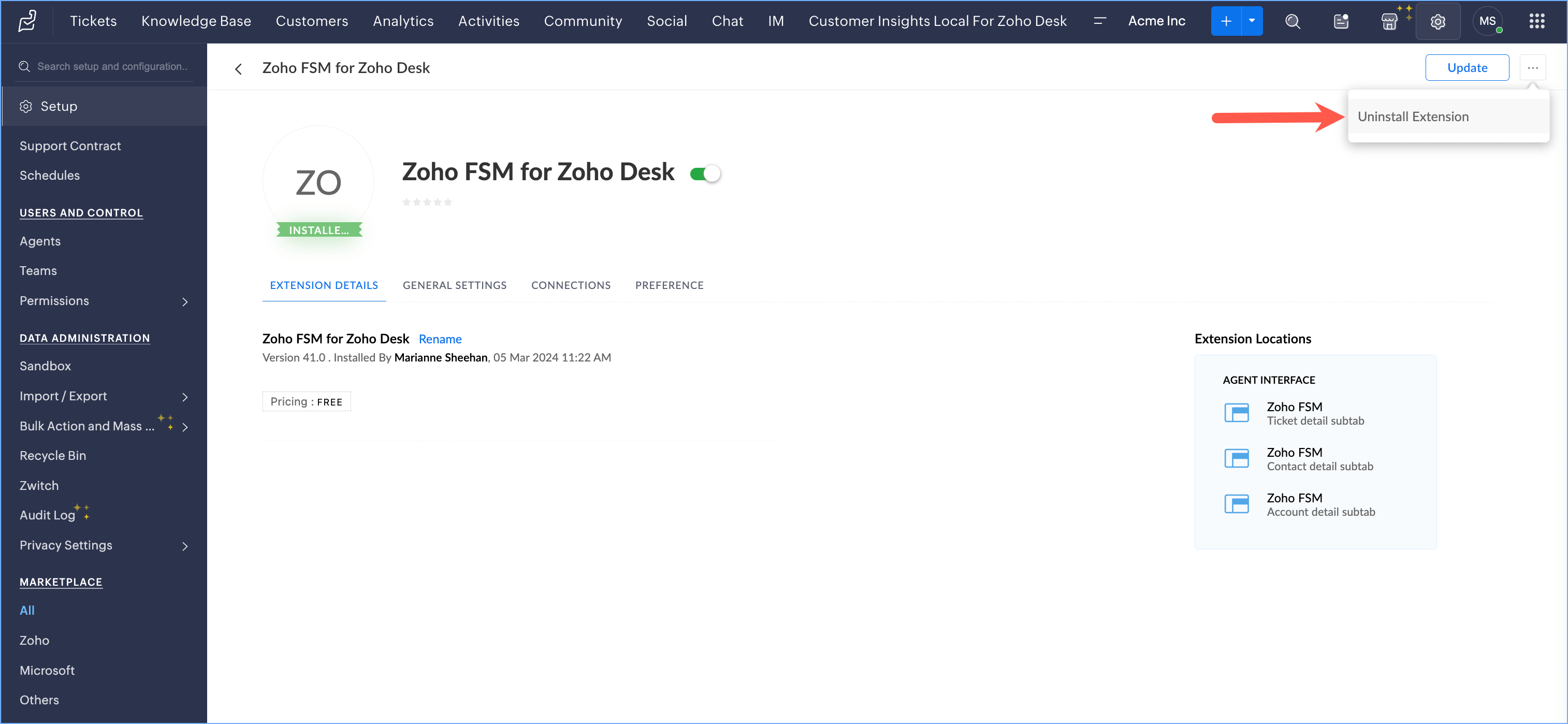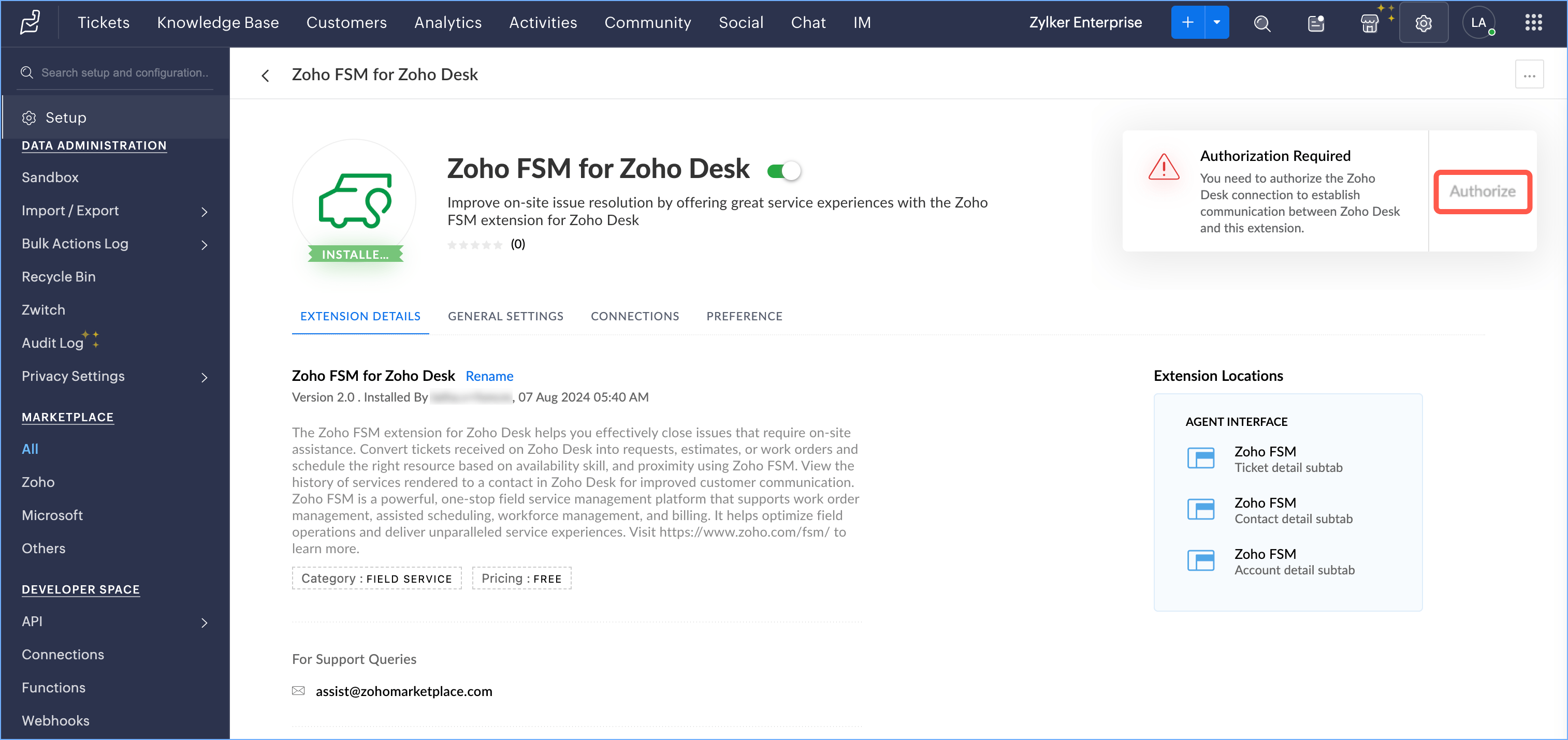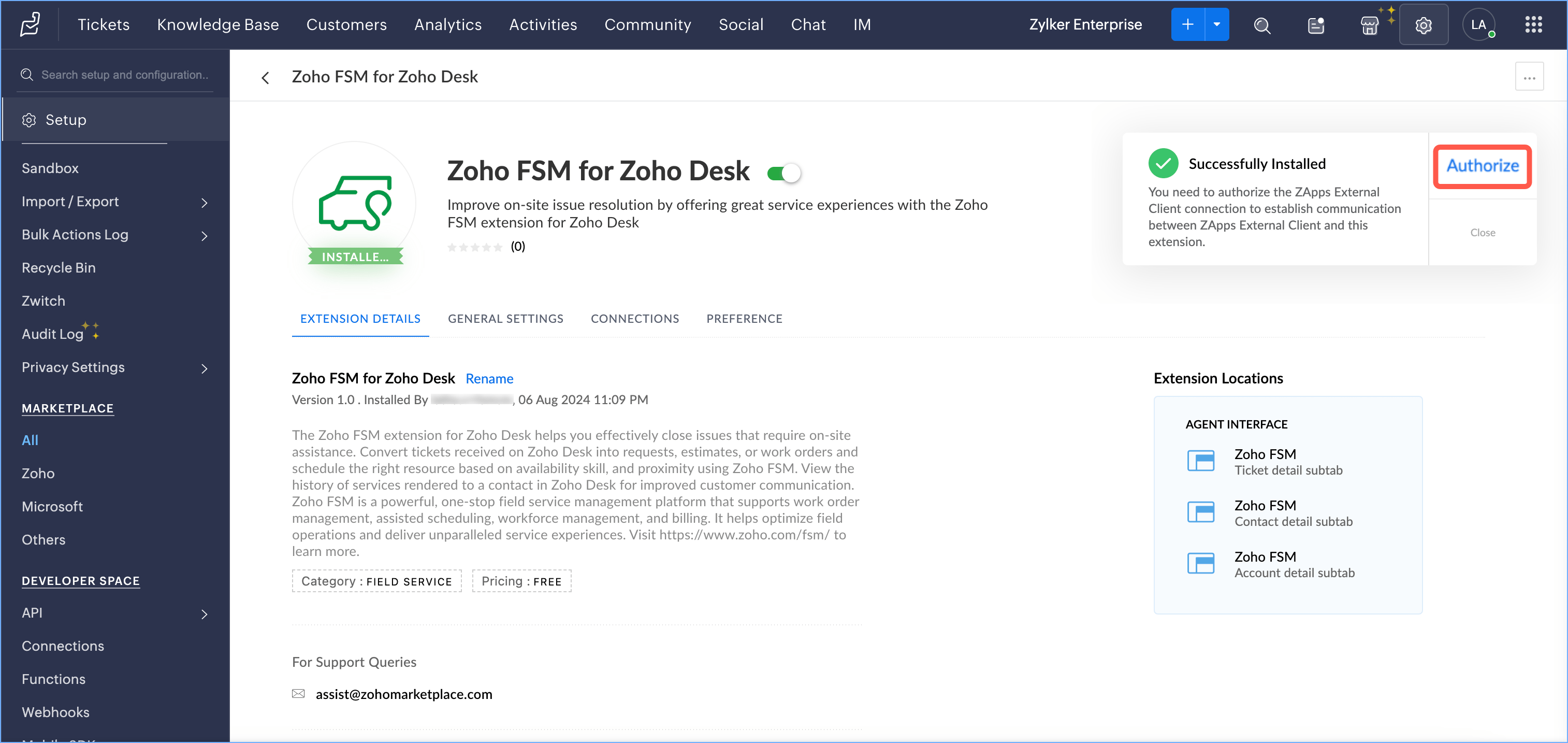 - Click the Installed Extensions tab, and click Zoho FSM for Zoho Desk.