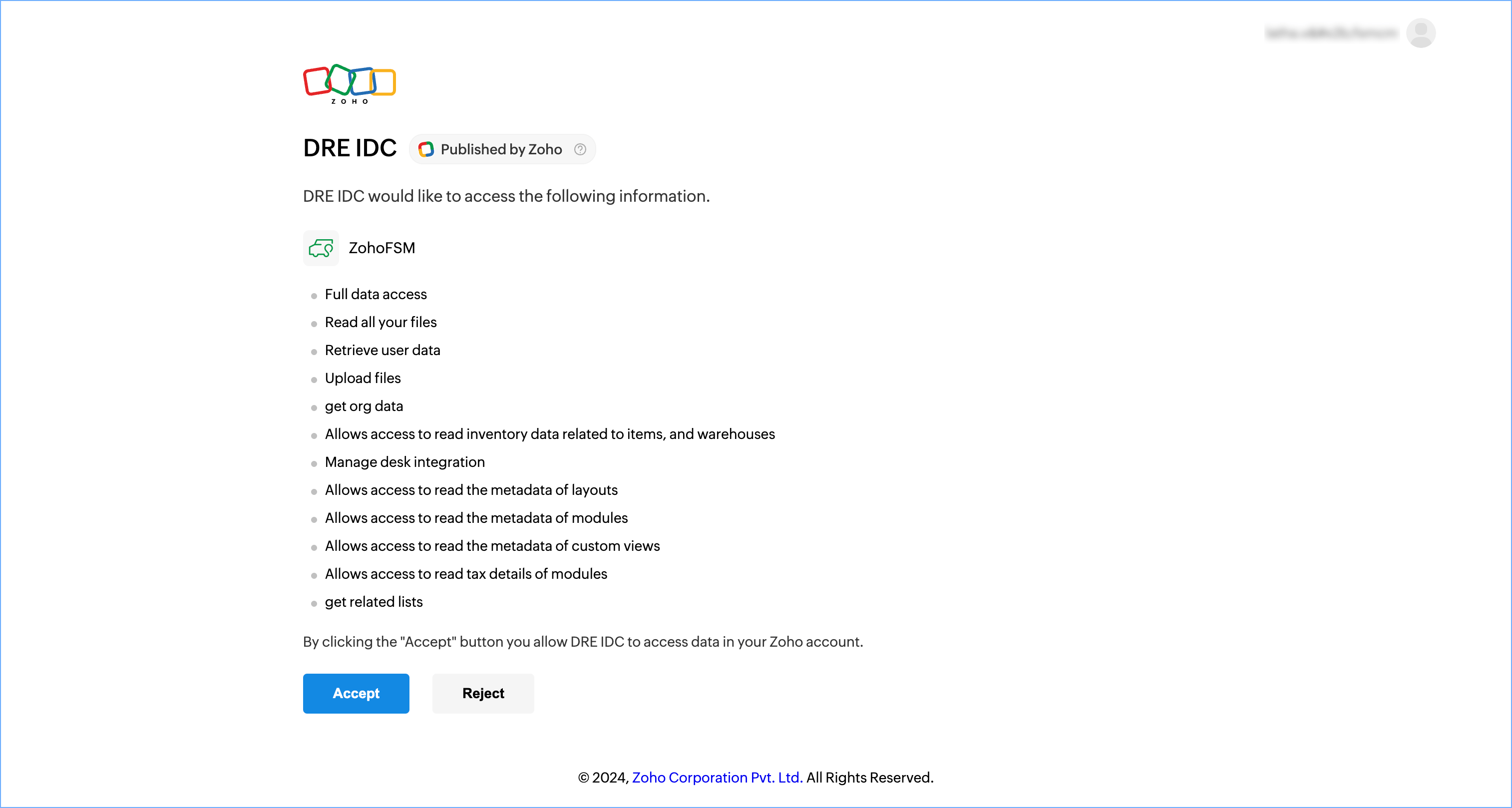 - Click Accept to allow access to your Zoho FSM data.