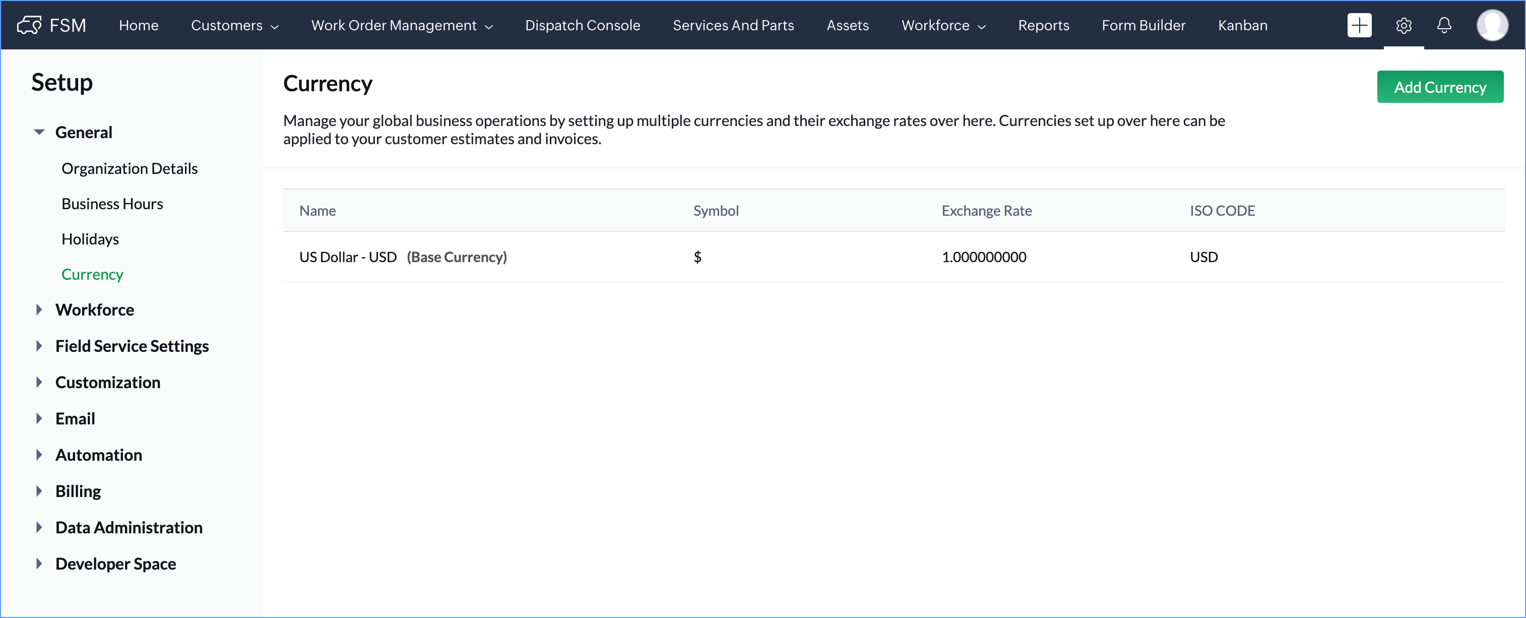 In Zoho FSM, the currency information can be found at