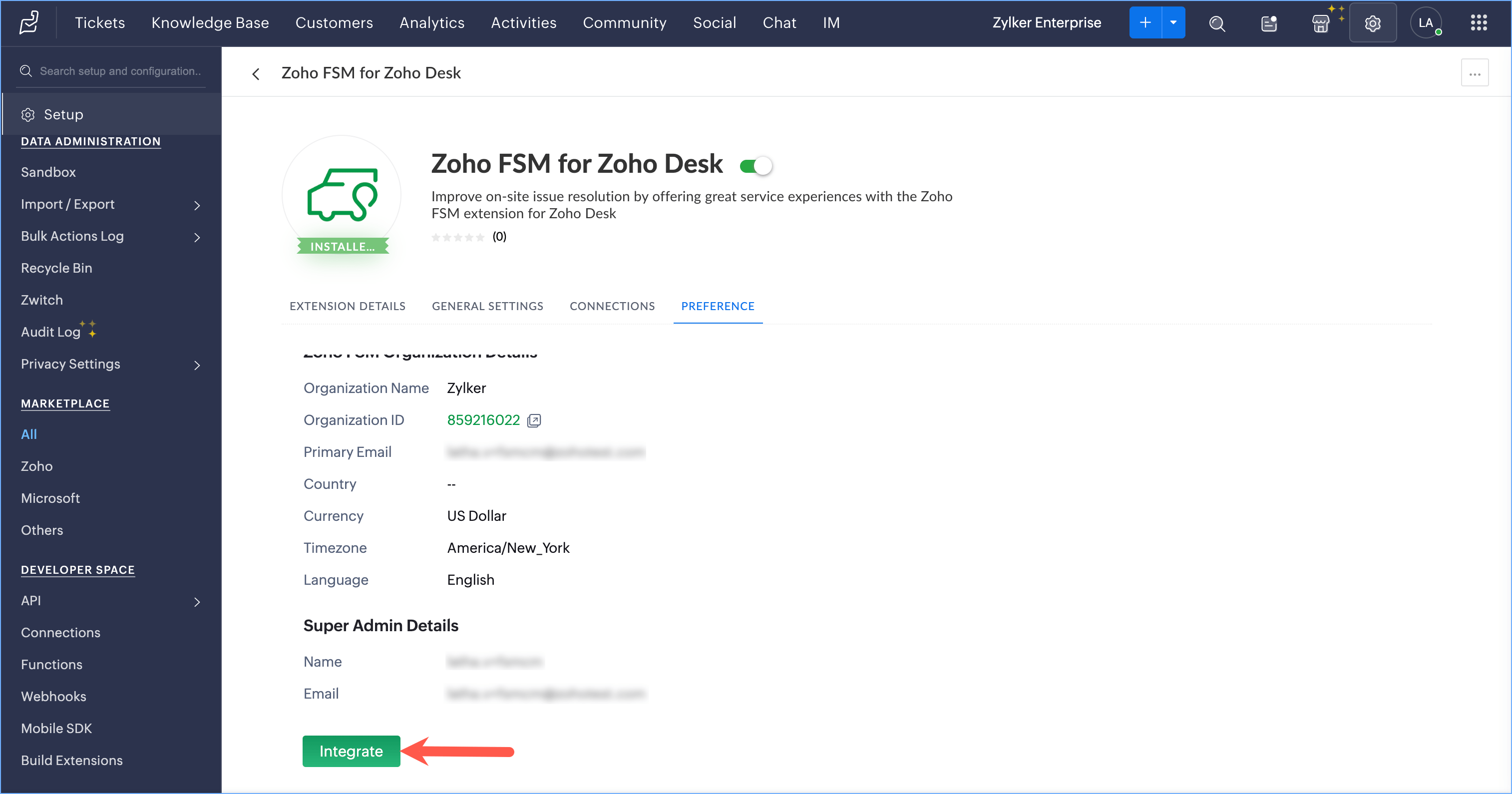 - In Zoho FSM, navigate to Setup > Integration > Zoho Desk and click