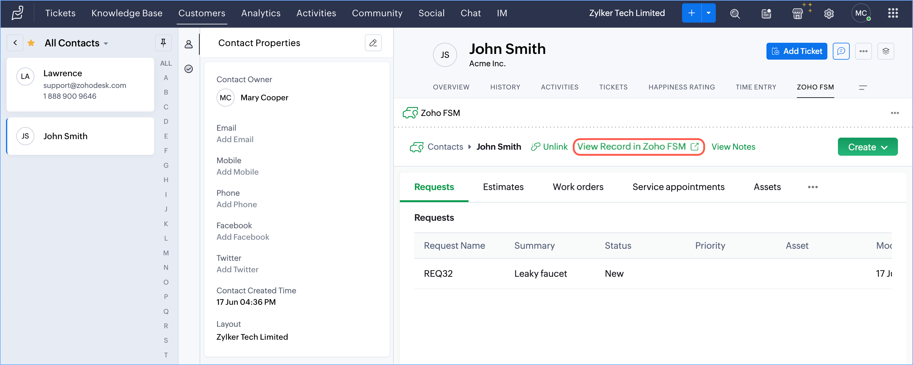create Zoho FSM Requests, Estimates, and Work Orders from it. The Requests, Estimates, Work Orders, Service Appointments and Assets created for the Account/Contact from Zoho FSM will also be listed here.