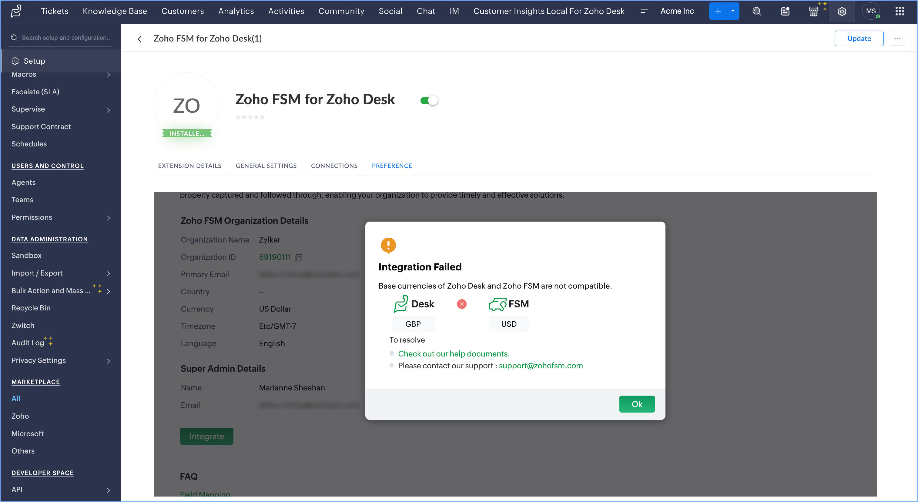 Scenario 2: Base currency mismatch between Zoho Desk and Zoho FSM