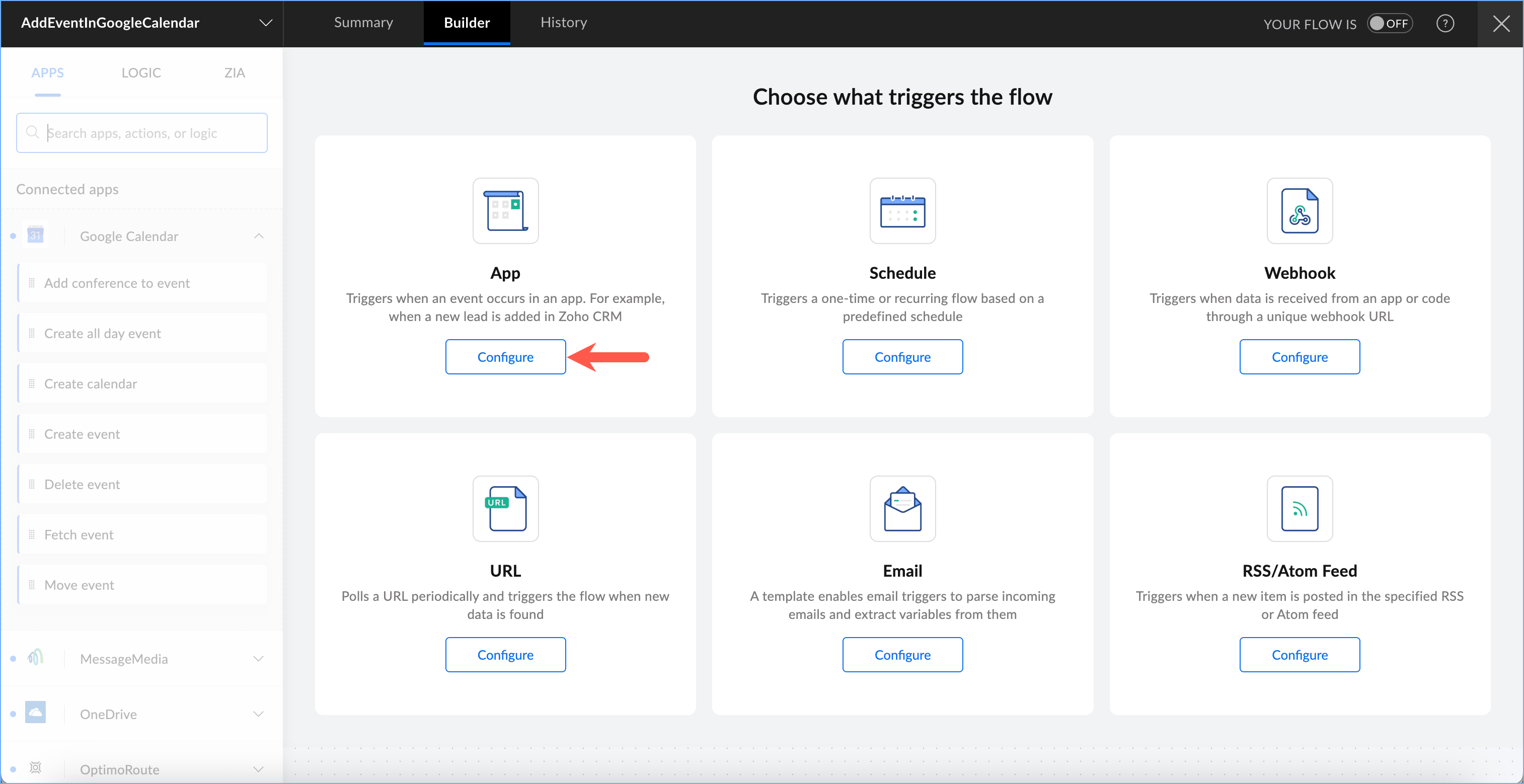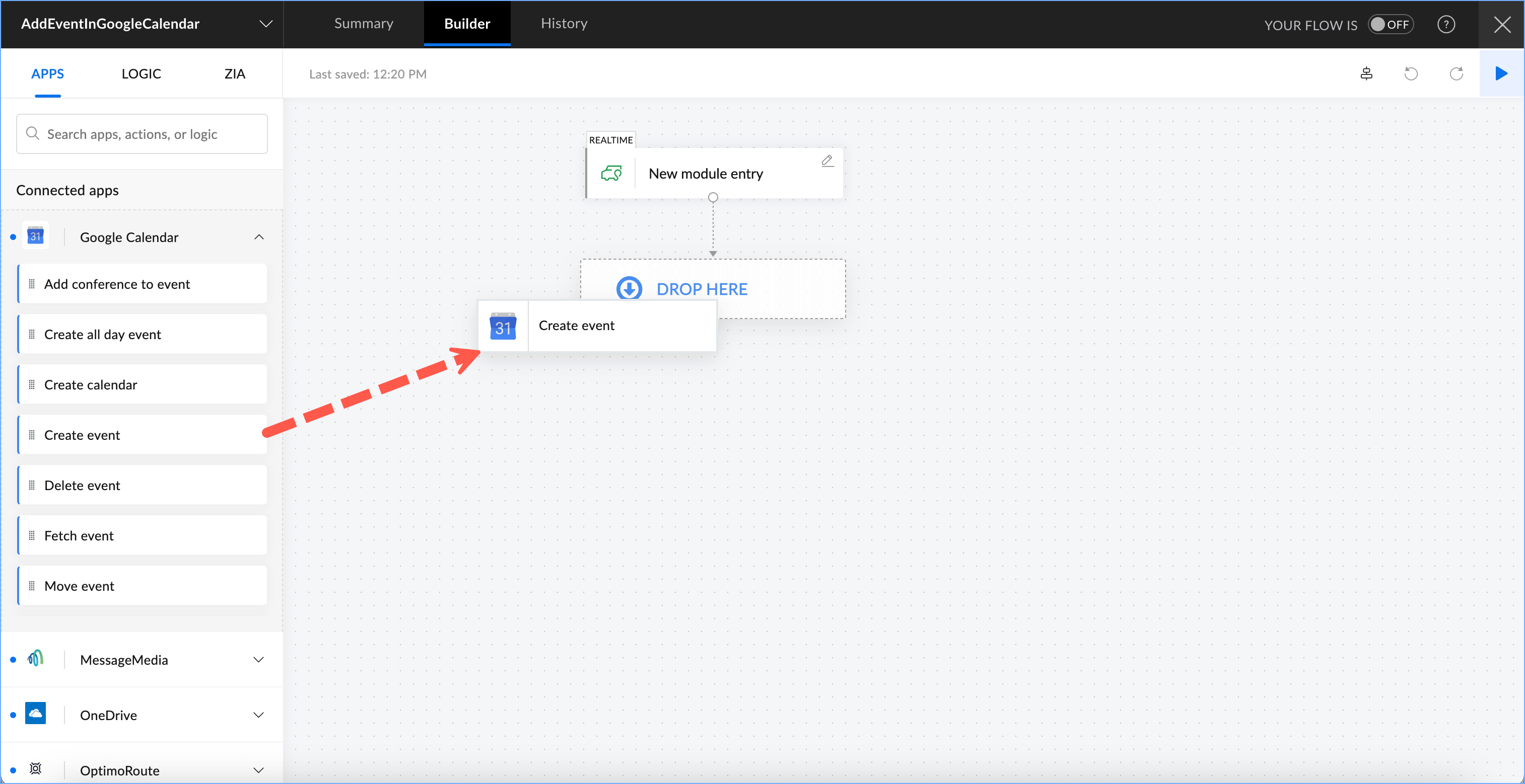 1. Select Google Calendar as the app where the Action should occur and drag and drop the action Create event to the Builder.
