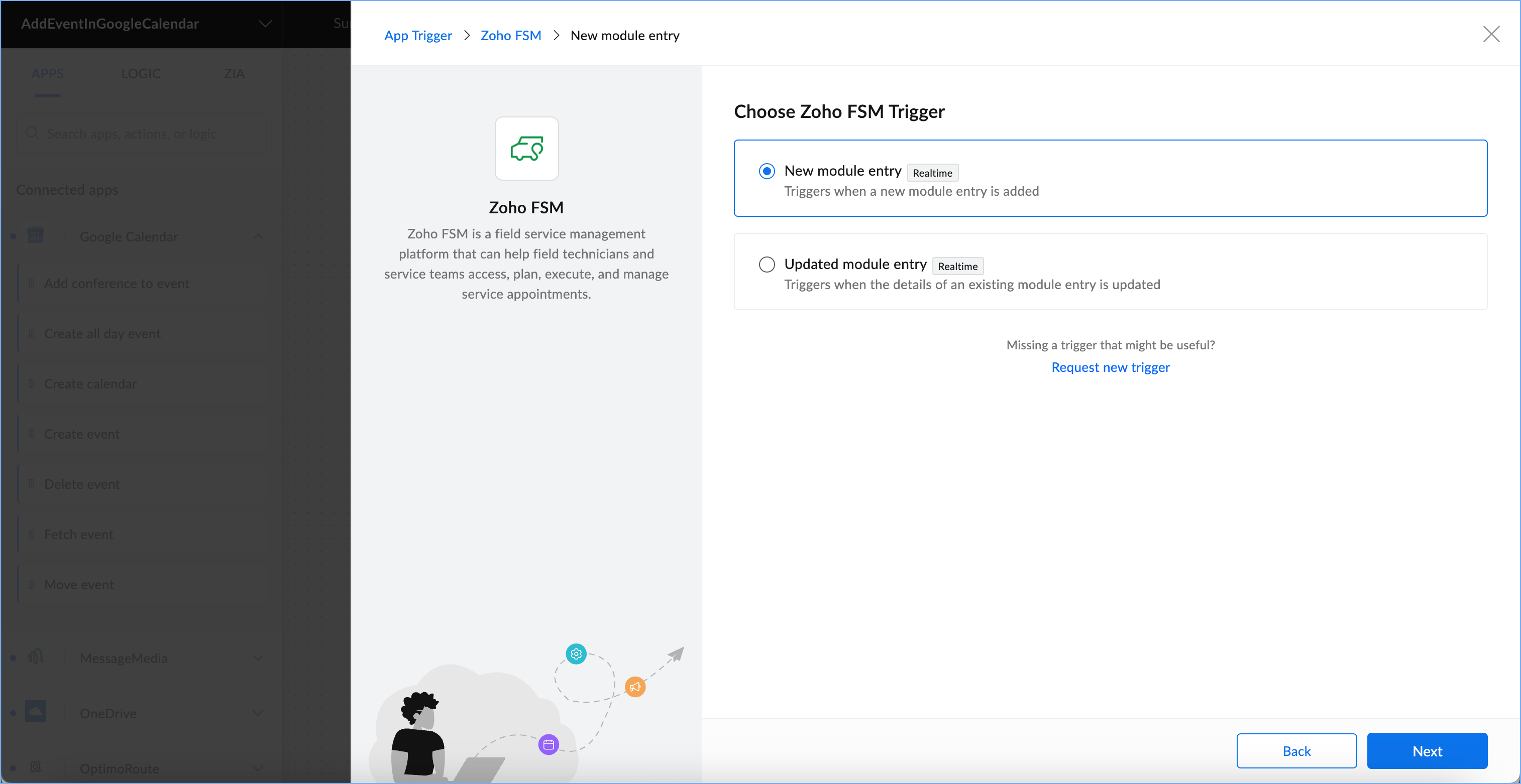 7. Choose the trigger in Zoho FSM as New module entry and click Next.