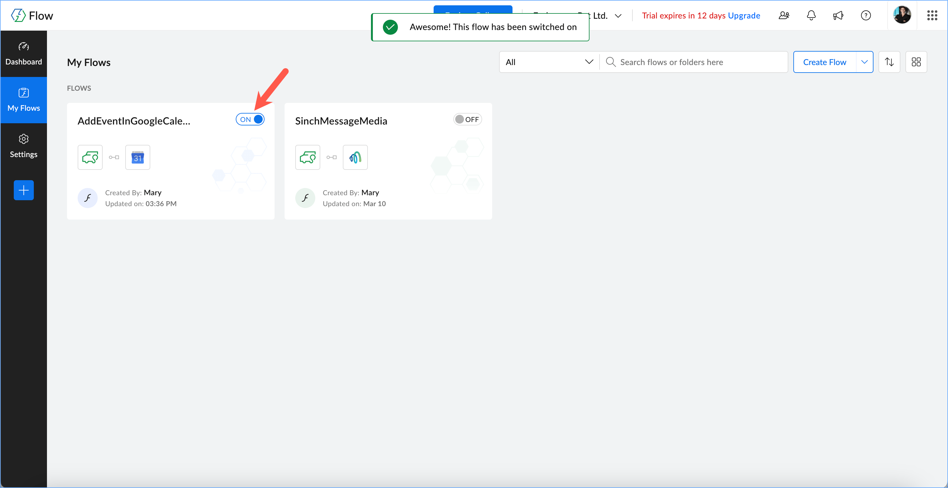 Use case: Using Sinch MessageMedia, text message the customer about a new request created for them. We will be using Zoho Flow to automate this. Follow the steps below to implement this use case: In Zoho Flow, click on My Flows in the left menu and ...