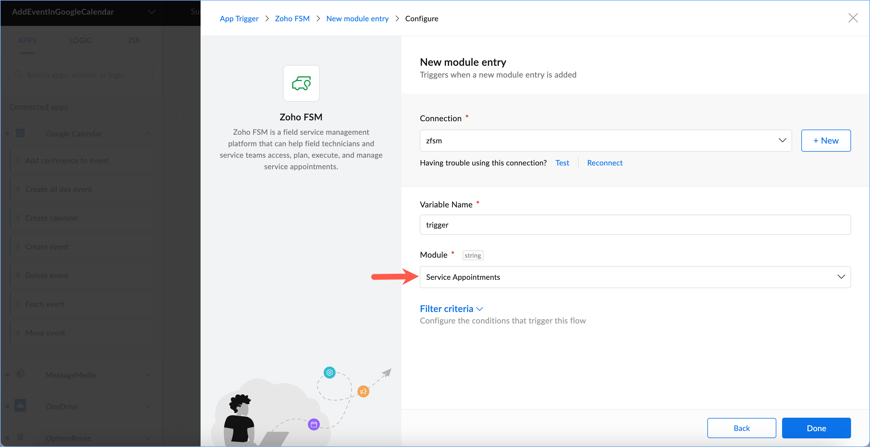 11. Select Service Appointments as the Zoho FSM module for which you want to apply the New module entry trigger. Click Done.