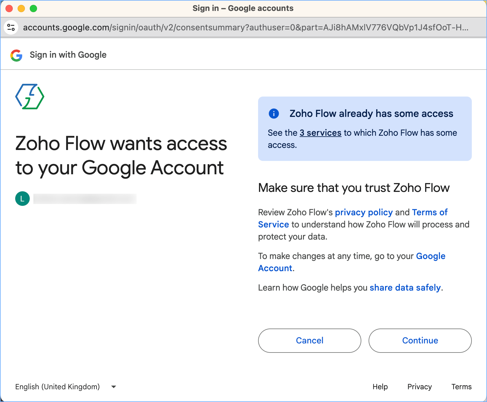 10. Click Accept to allow Zoho Flow to access your Zoho FSM data.