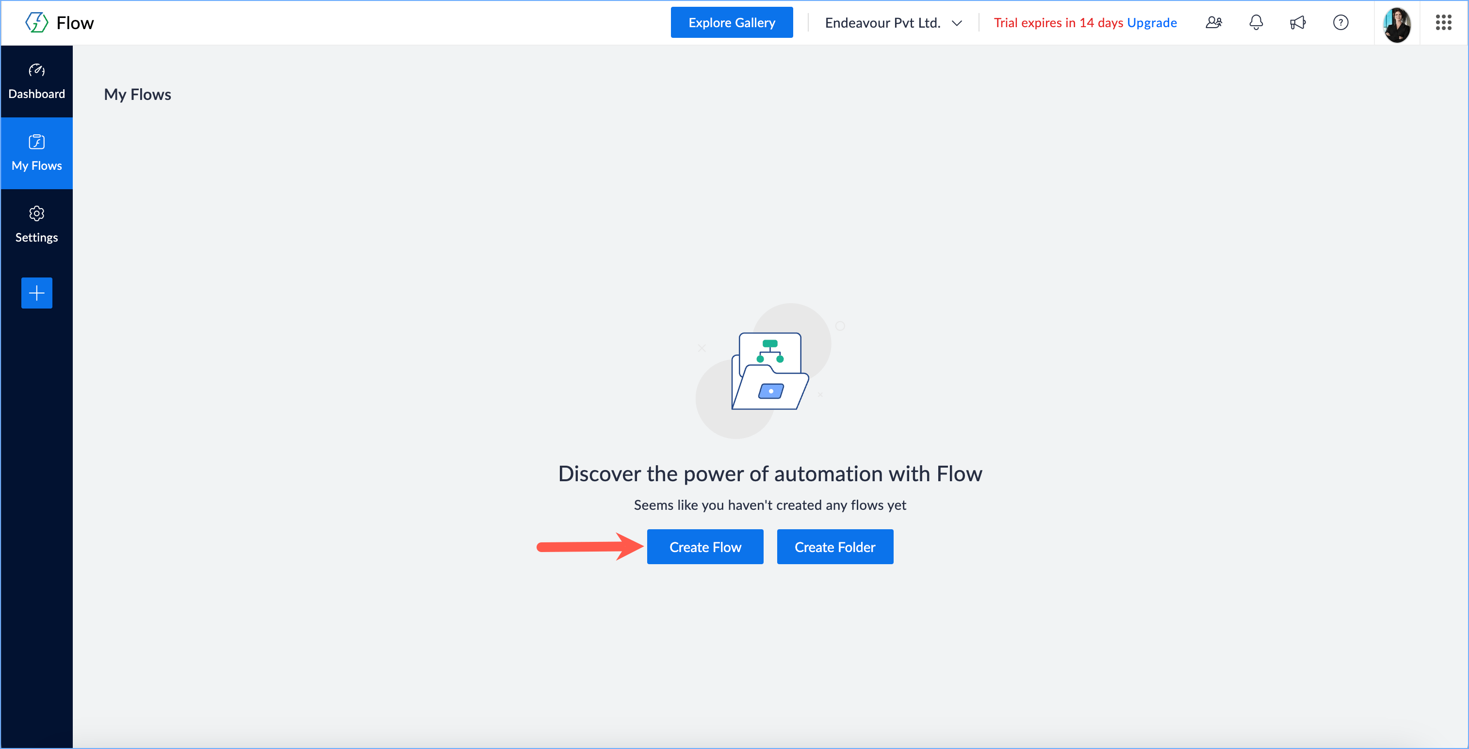 In Zoho Flow, integrations are established using Flows. A flow comprises a trigger and one or more actions. The trigger initiates the flow, while the actions execute the designated tasks.