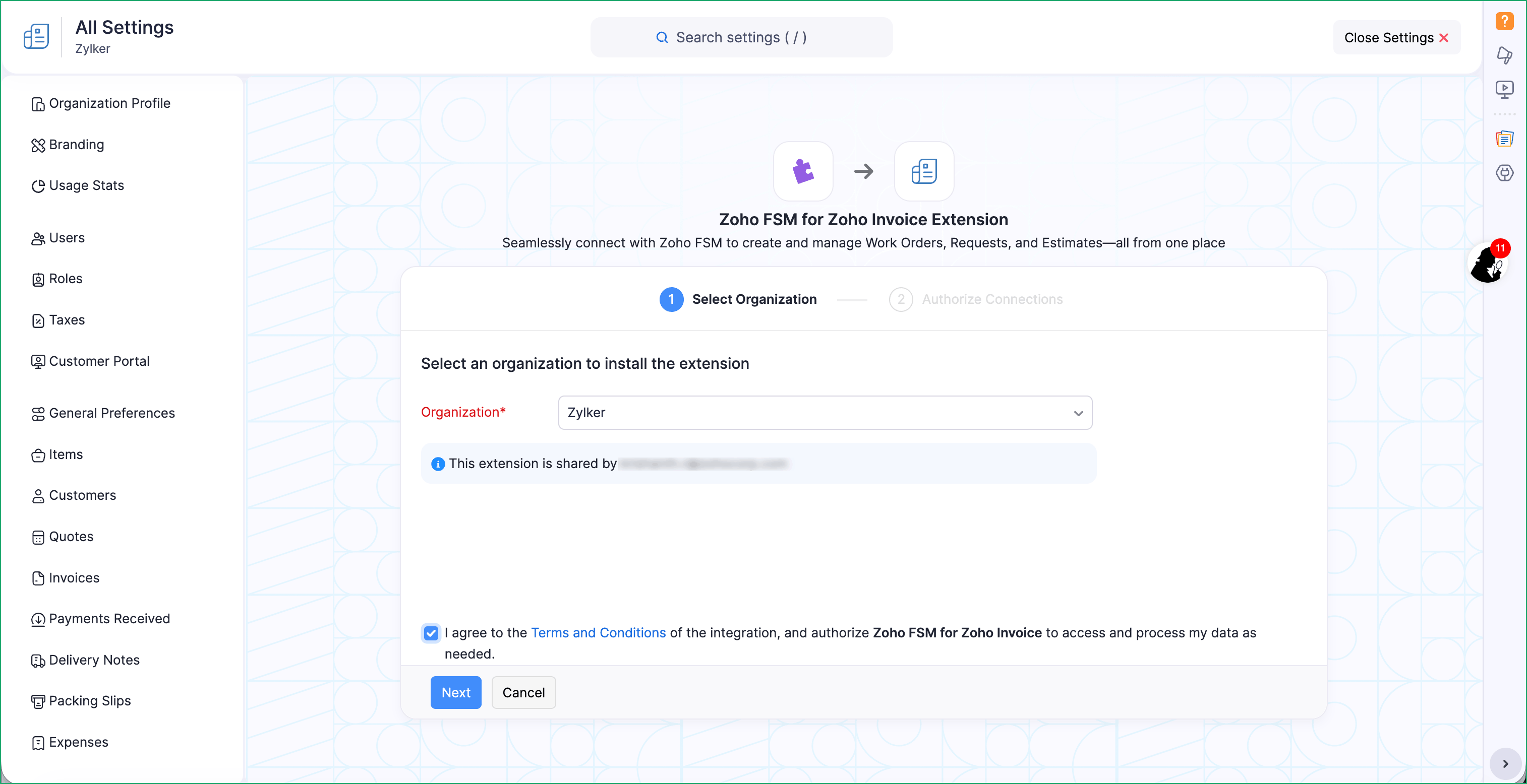 - Select the Zoho Invoice organization where you want to install the extension, select the checkbox for terms and conditions, and click Next.