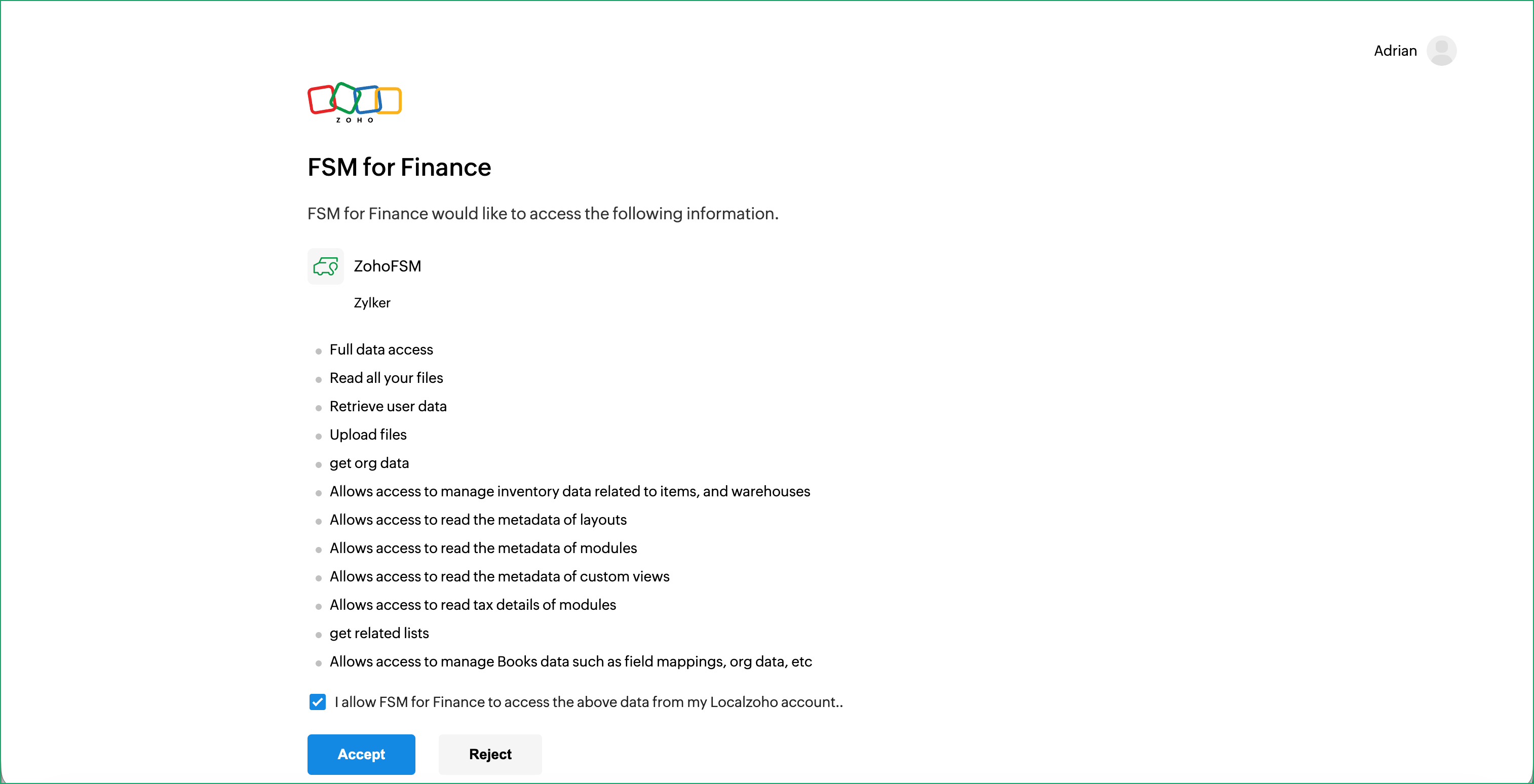 If a Zoho FSM user without the Administrator profile installs the extension, they will encounter the error shown in the screenshot below when attempting to complete the integration setup. To resolve this issue, an Administrator must uninstall the extension and then reinstall it.