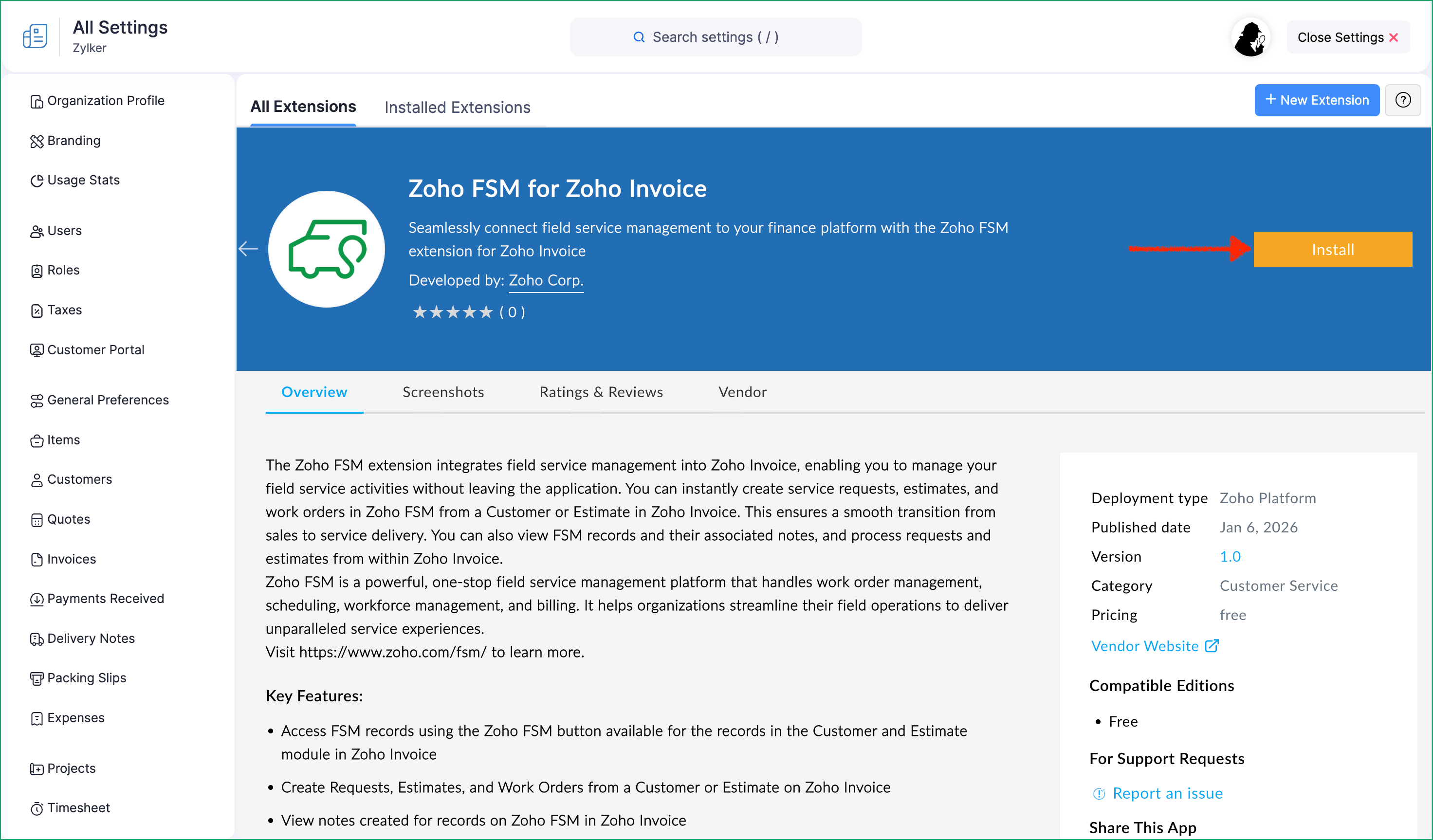 - Click the Installed Extensions tab, and click View details for Zoho FSM for Zoho Invoice.