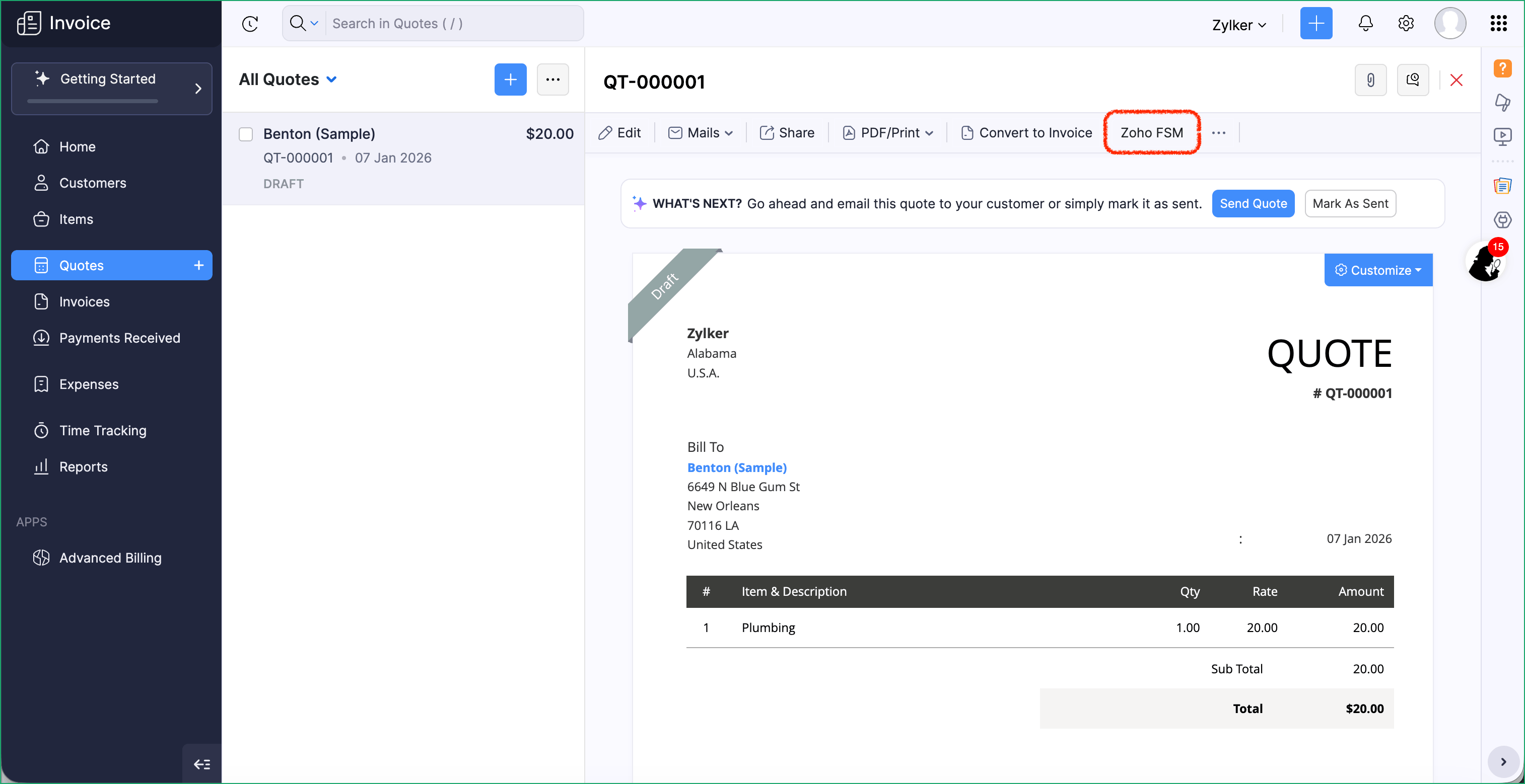 - Select a Customer or Quote and click Zoho FSM.