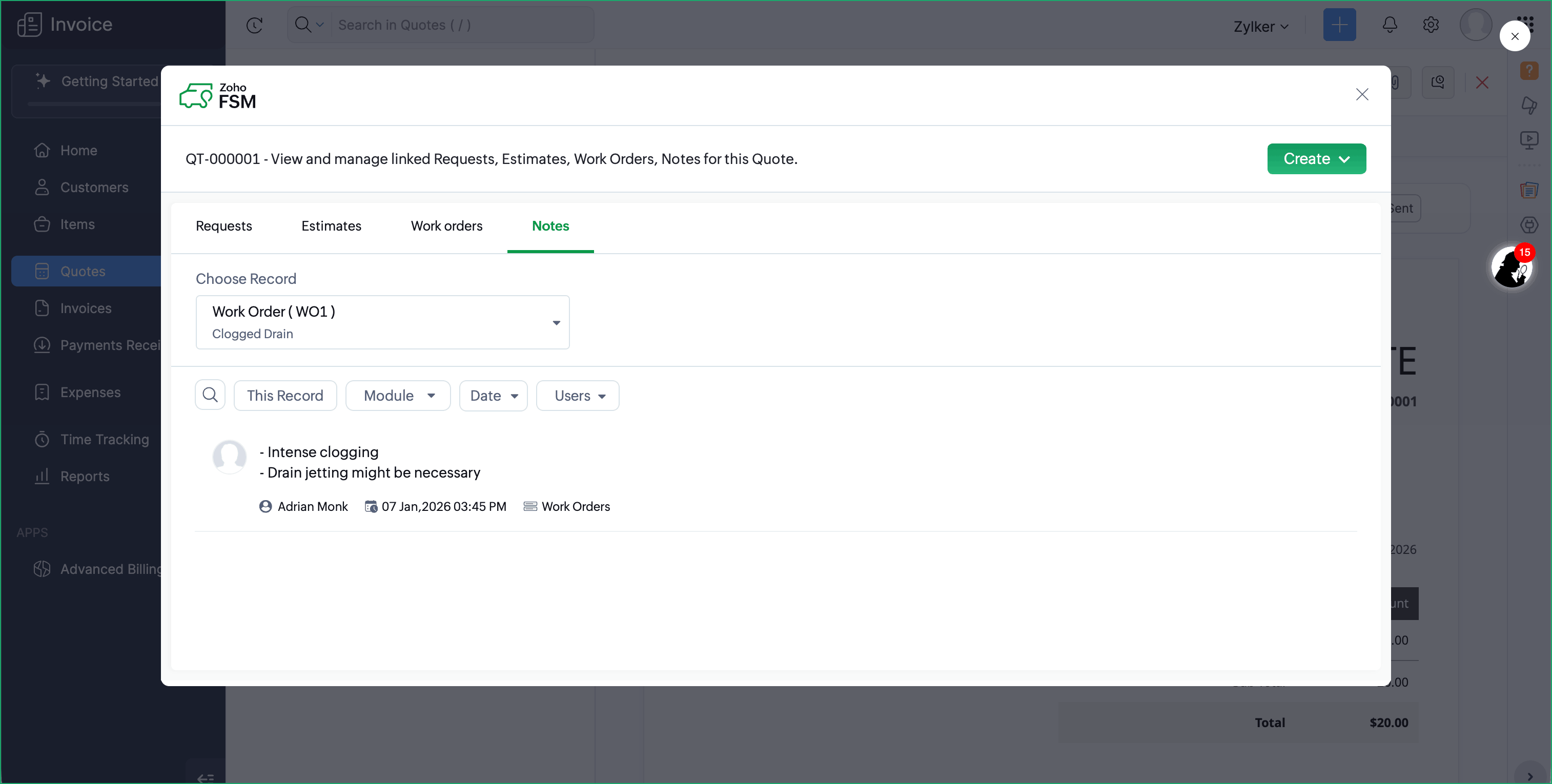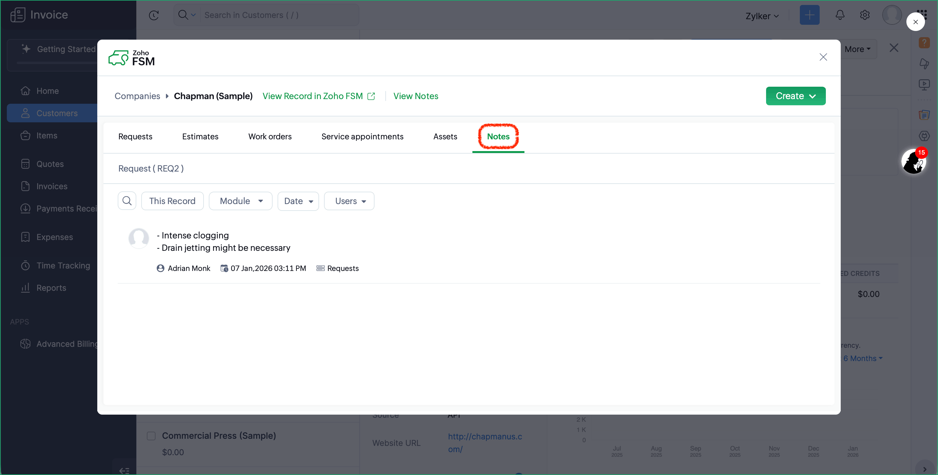 - View notes of Zoho FSM records associated with a Zoho Invoice Customer or Quote