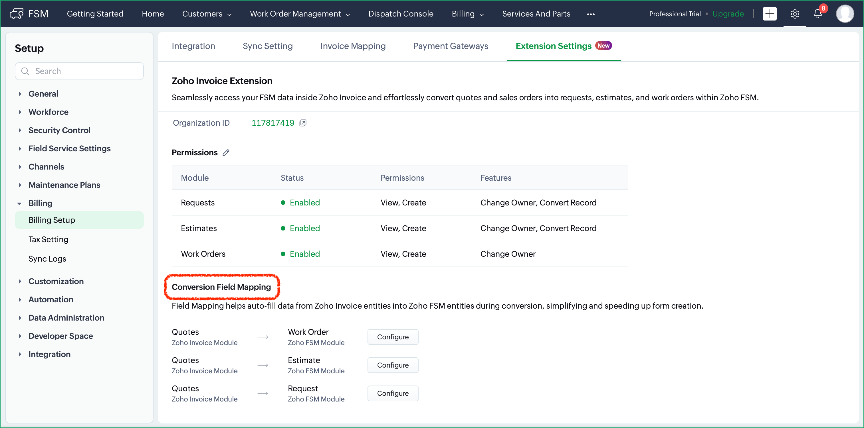 - In Zoho FSM, navigate to Setup > Billing > Billing Setup and select the Extension Settings tab.