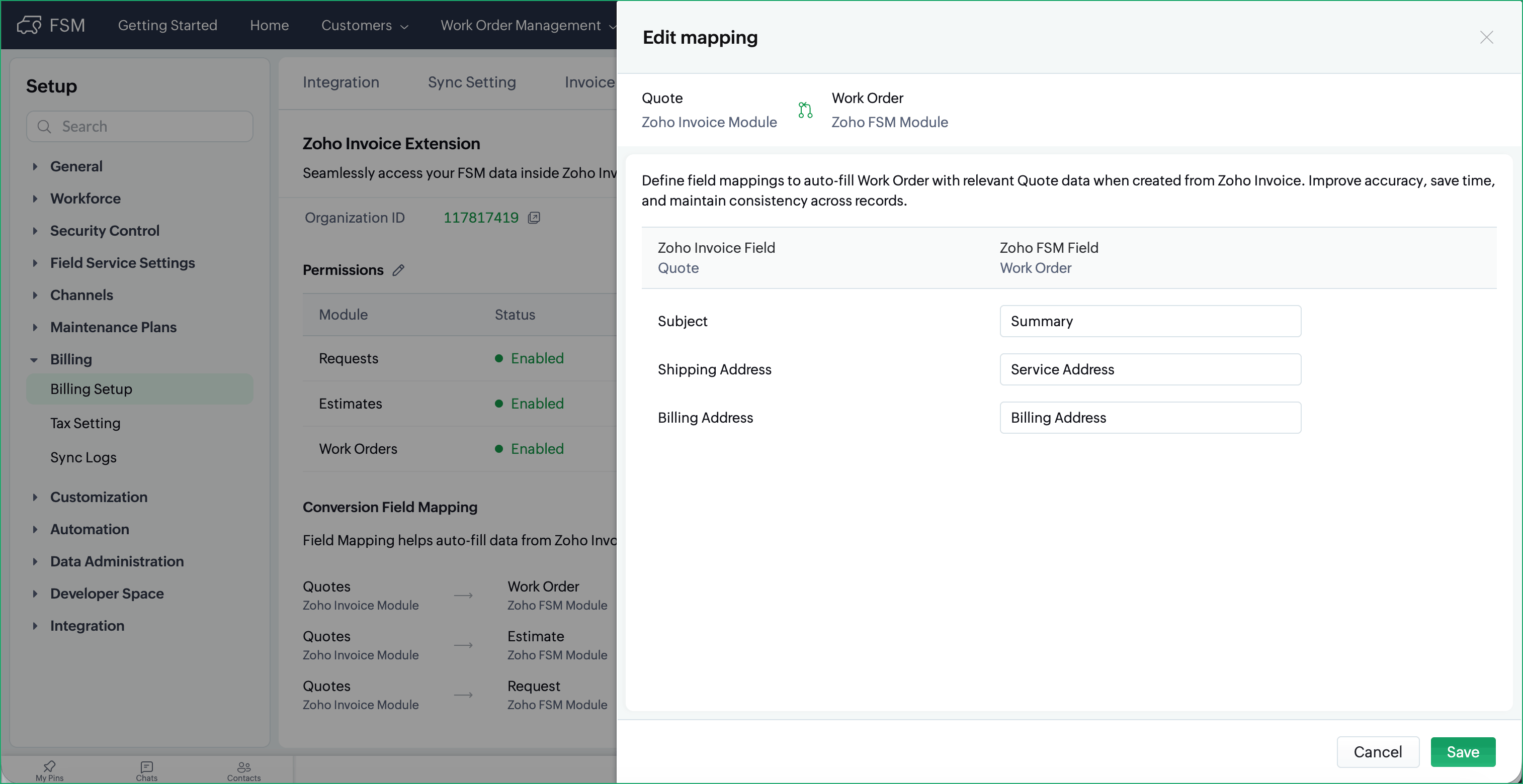 creating records for Zoho FSM modules within Quotes in Zoho Invoice, some of the details are prefilled in the Create forms. There are field mappings that determine which field values get copied from the Zoho FSM modules to these Zoho Invoice module. To manage these mappings, do the following in Zoho FSM: