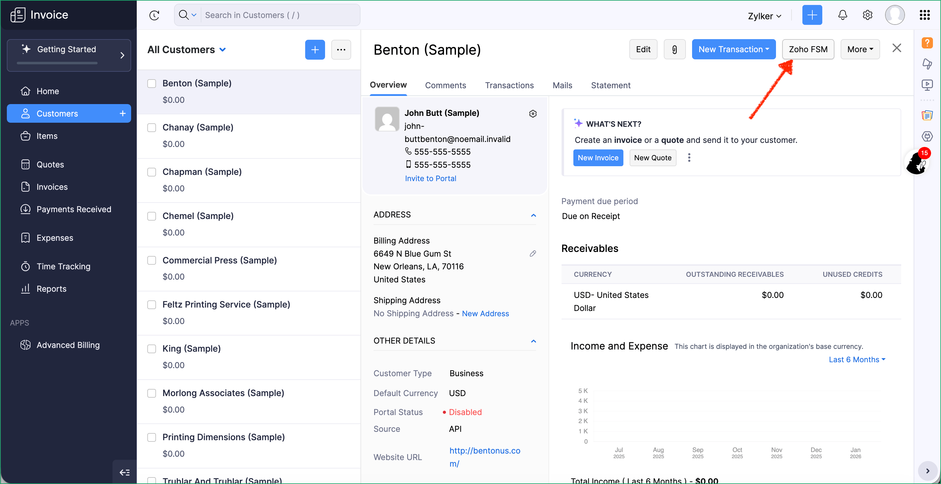 - Go to a Customers/Quotes record in Zoho Invoice and click the Zoho FSM button.