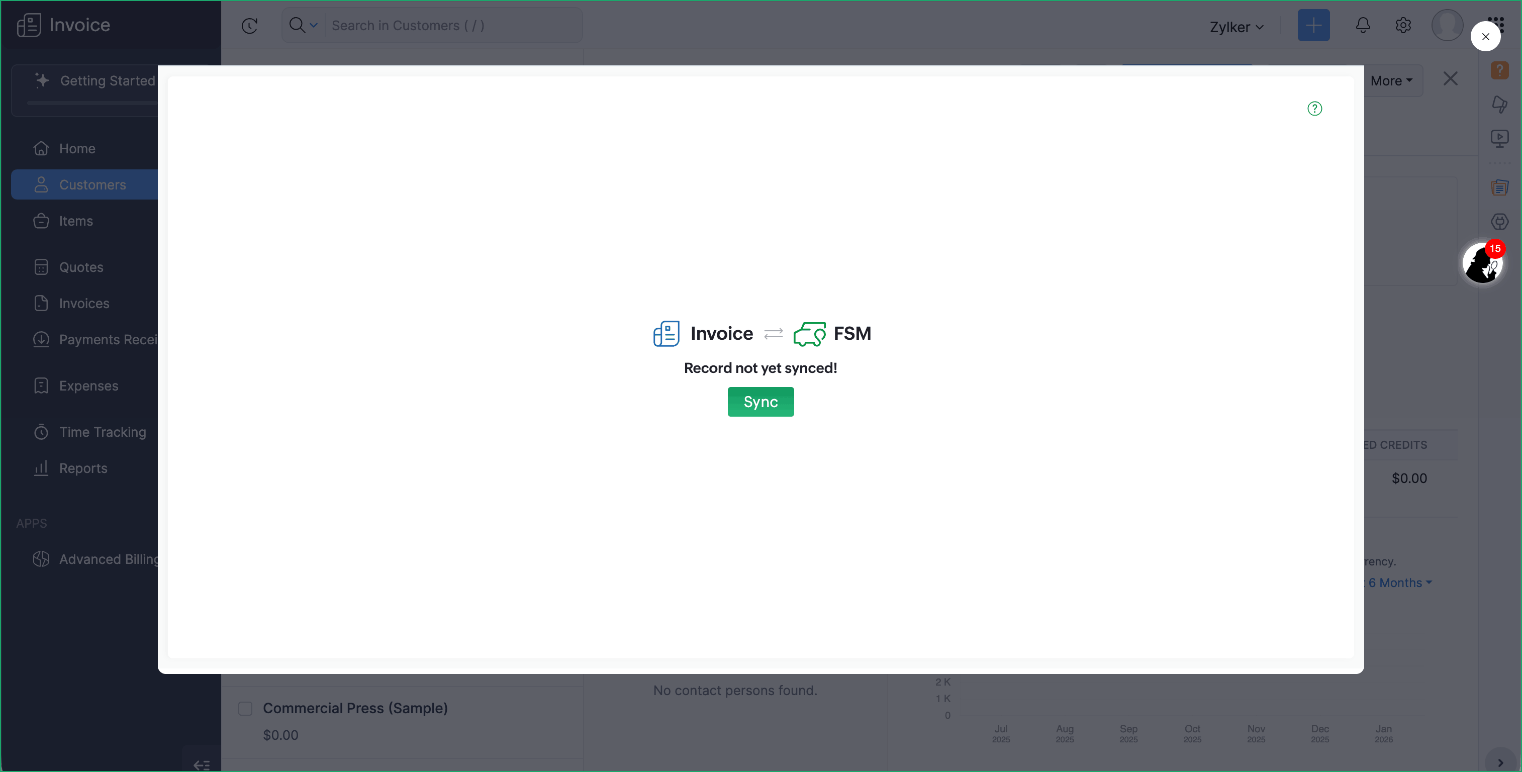 - If the customer is not present in Zoho FSM, click Sync/Sync & Continue to create the record in Zoho FSM.