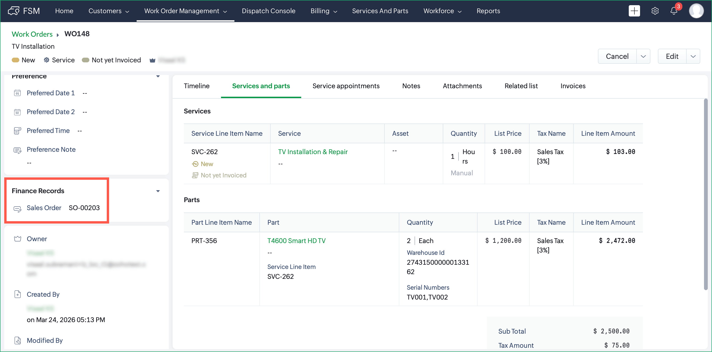 Note: This automation only applies to work orders created directly within Zoho FSM; it does not apply to those created from existing sales orders via the