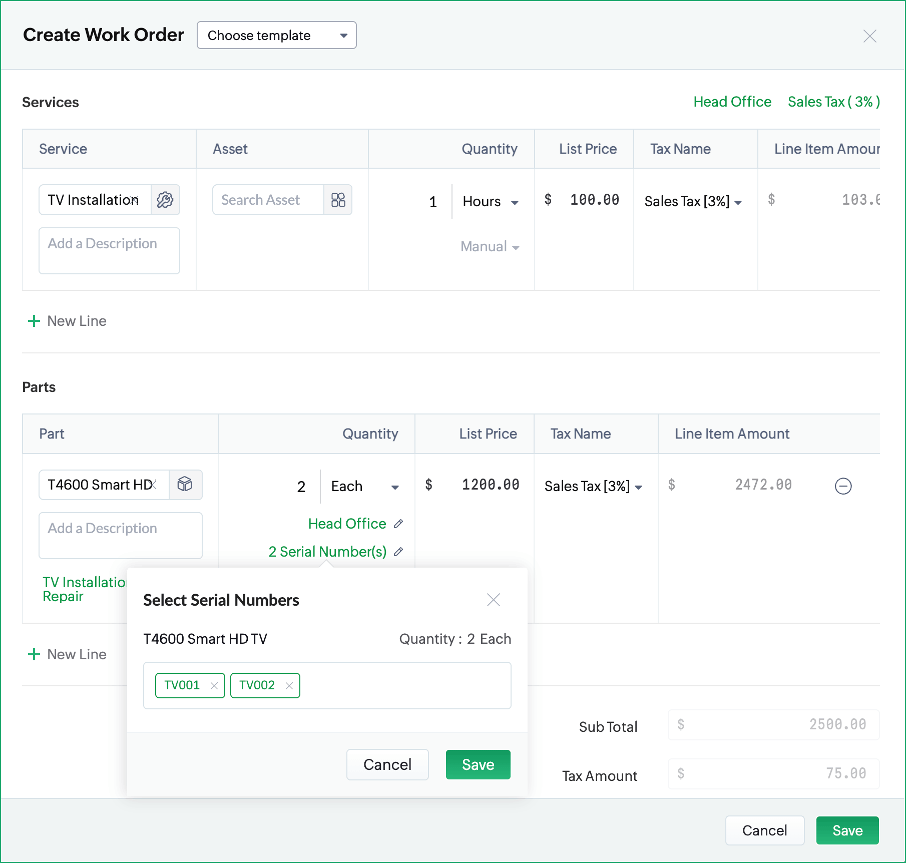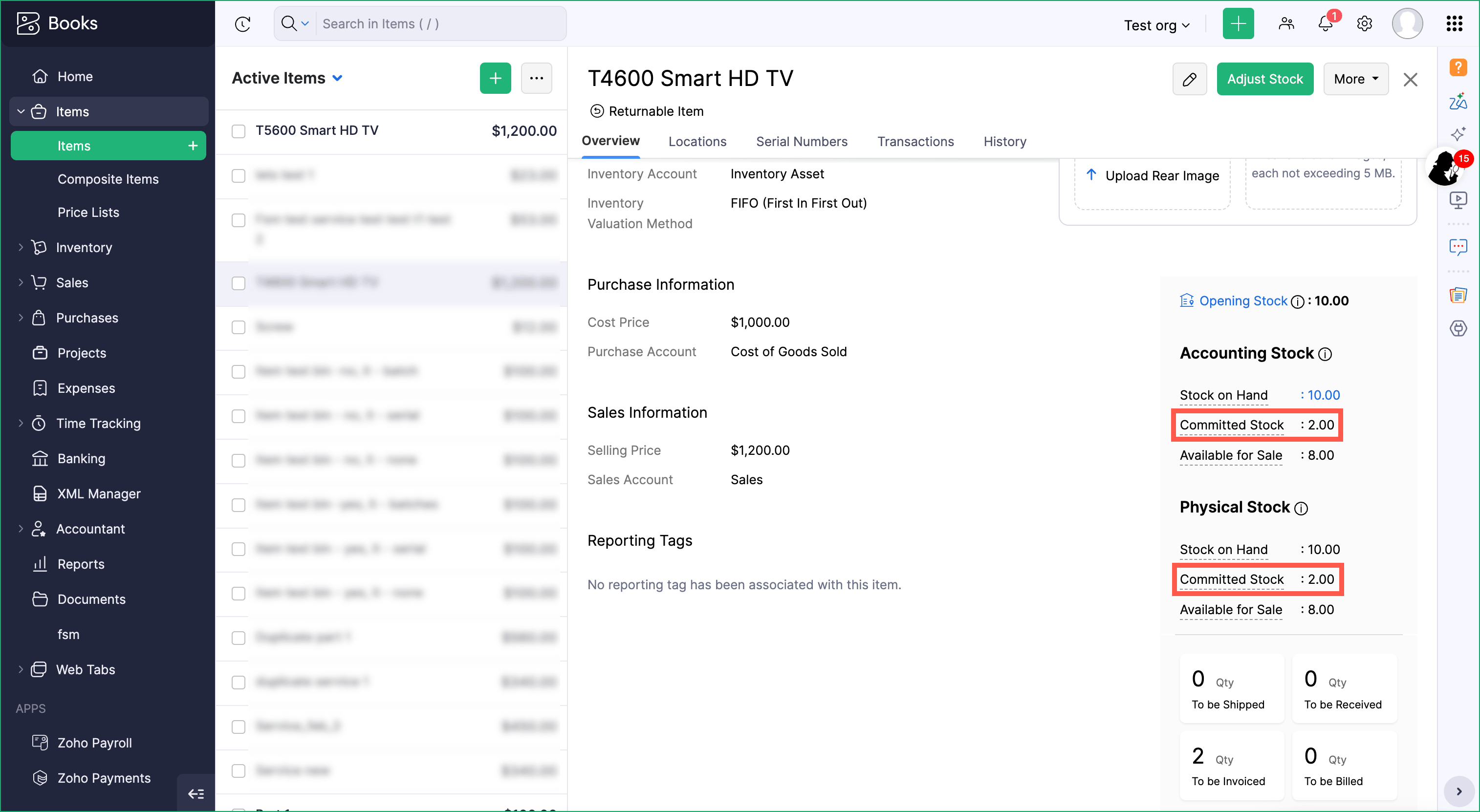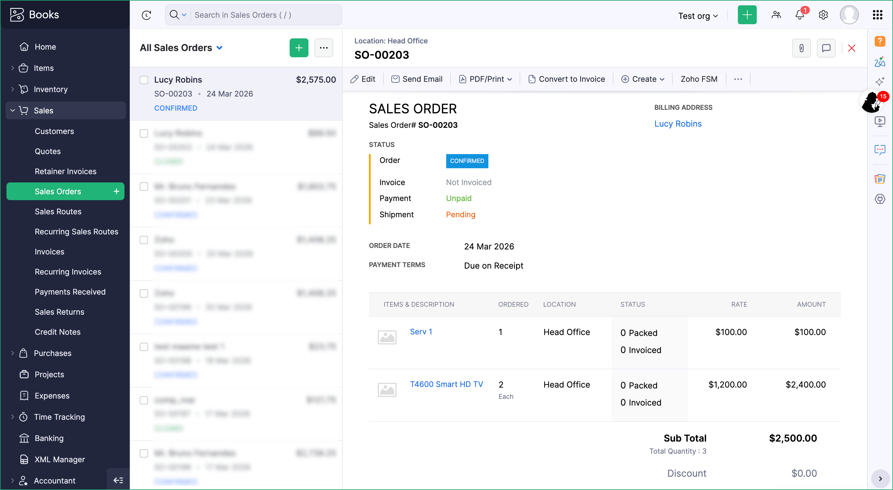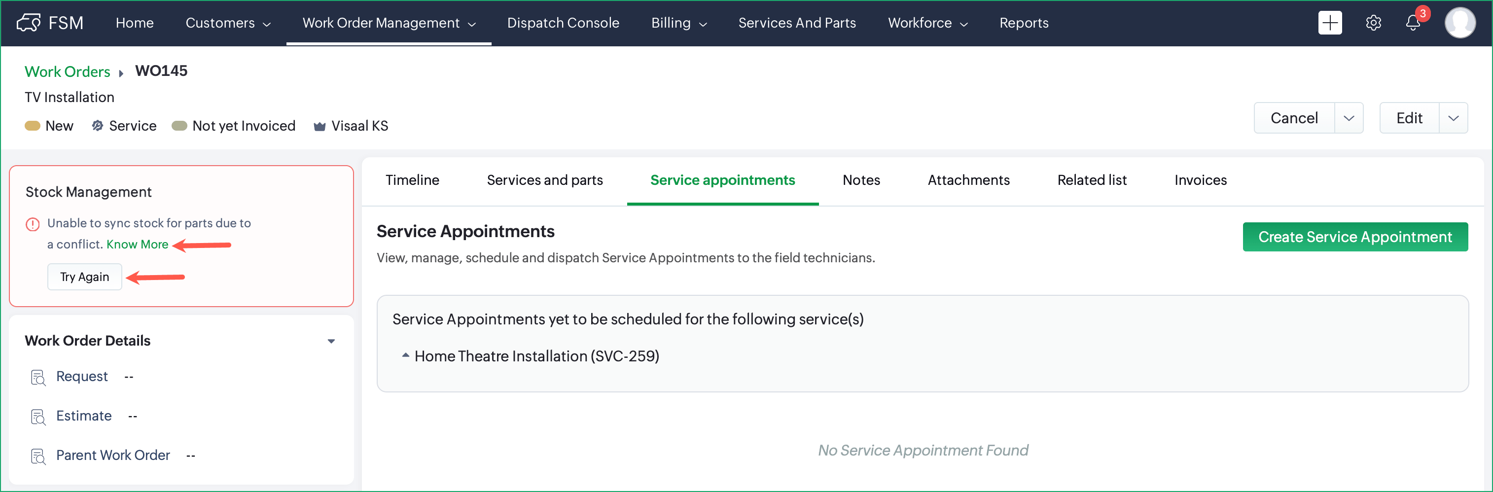 You can automate the process of sales order creation in Zoho Books/Inventory whenever a work order is generated in Zoho FSM. This automation can be managed from the Billing settings in Zoho FSM. The Committed Stock is automatically updated based on the parts specified in the work order.