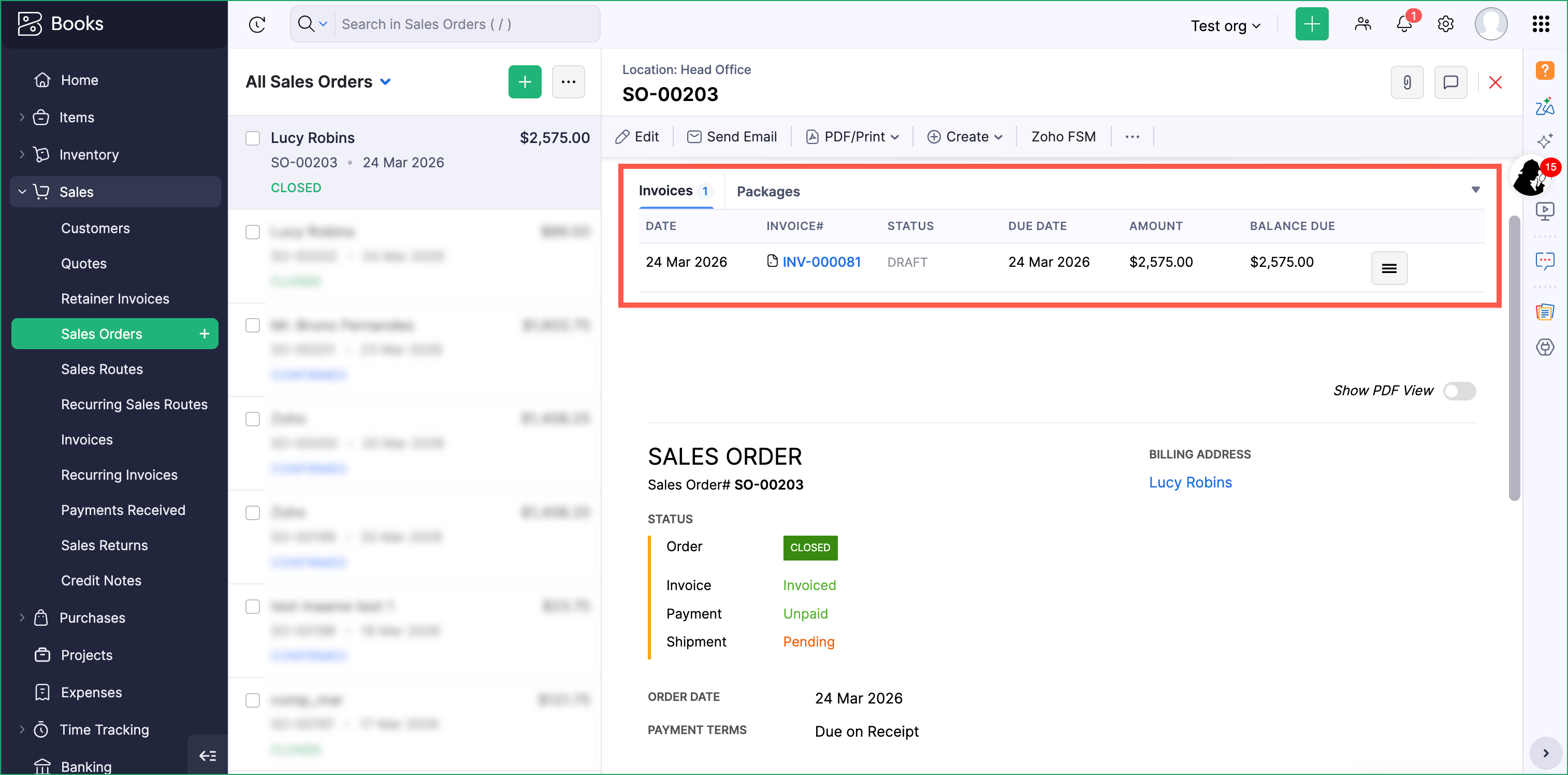 - When you create an invoice for the work order, it will be reflected in the sales order.
