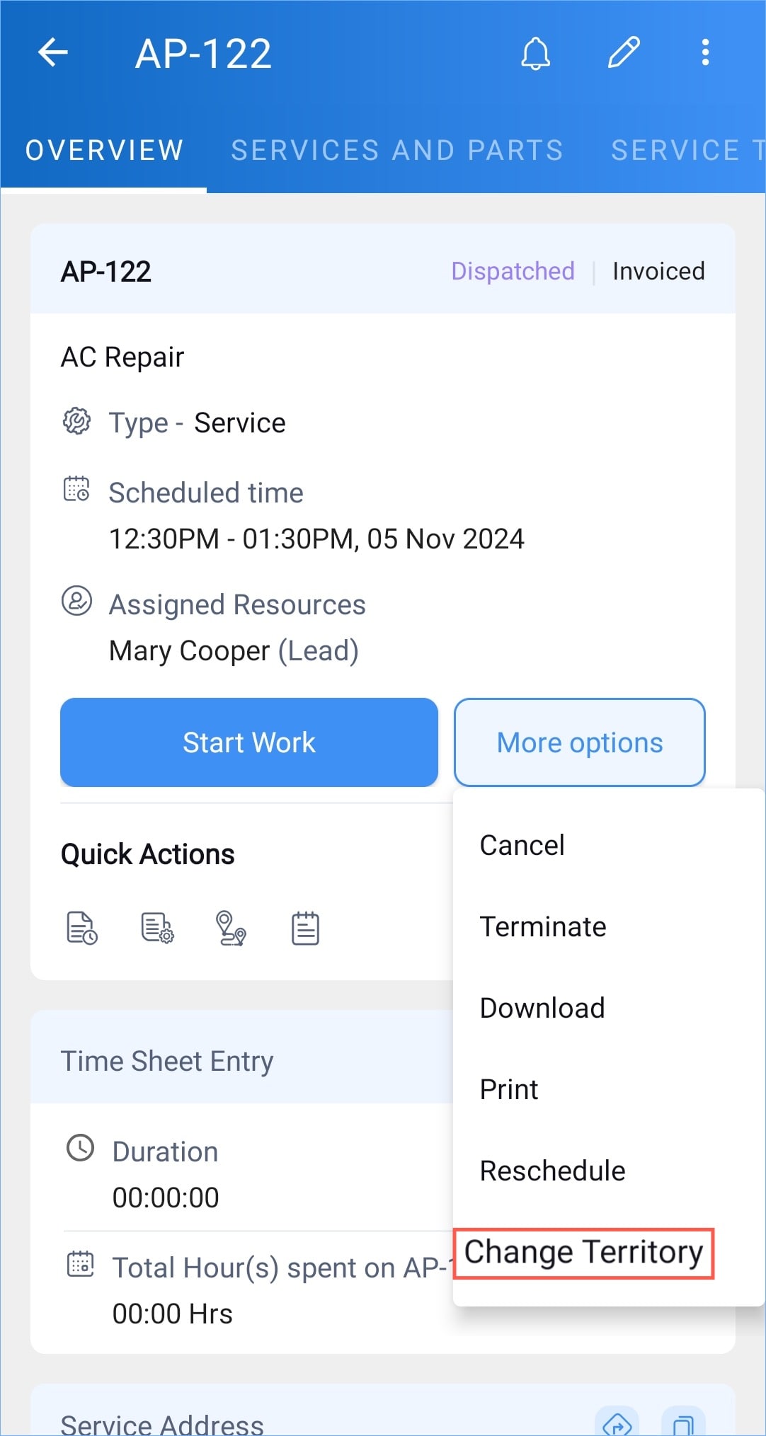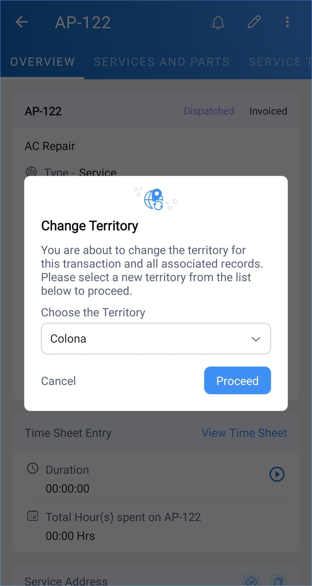 To change the territory associated with Requests, Estimates, Work Orders, and Service Appointments from the mobile app: