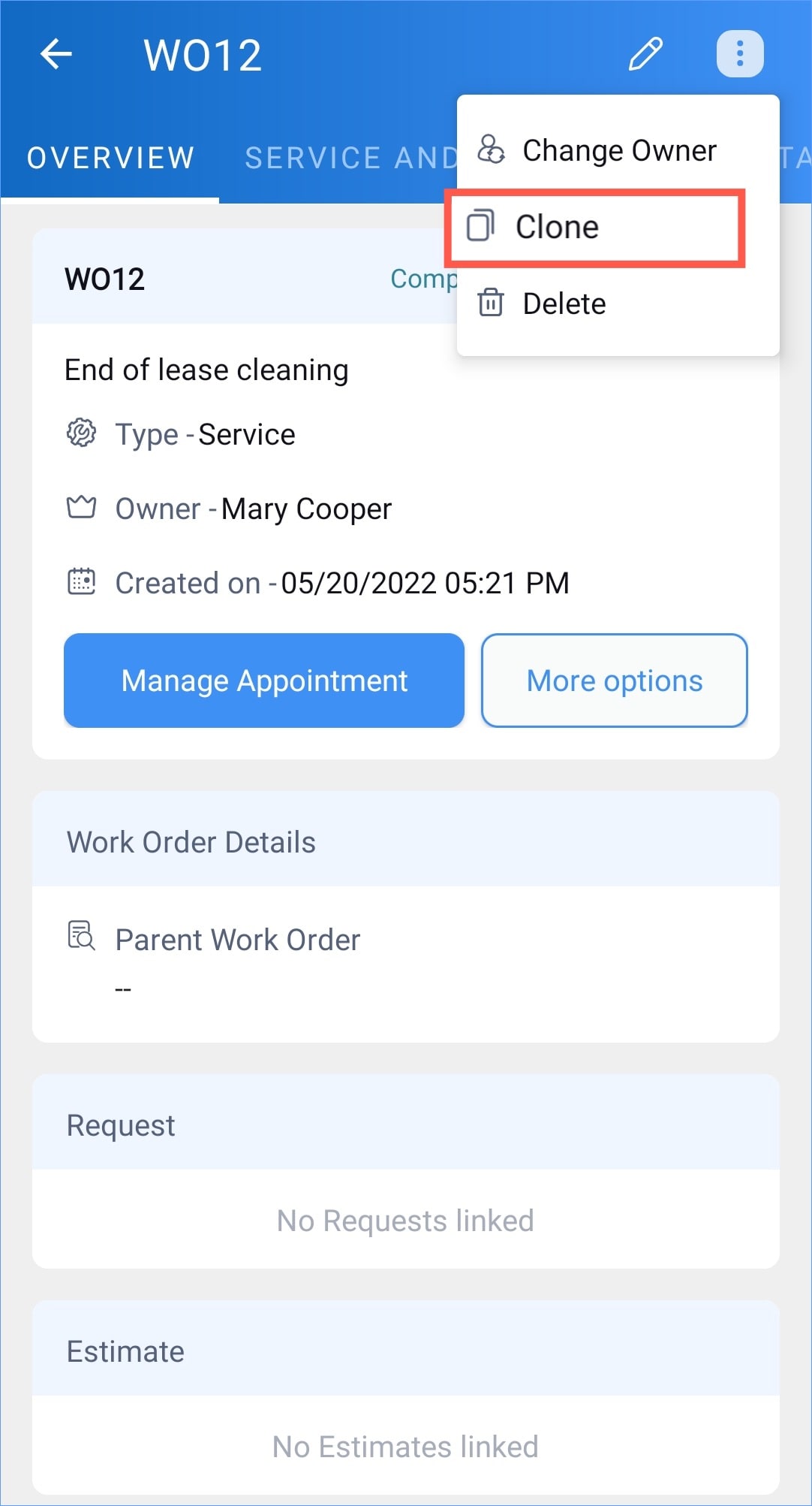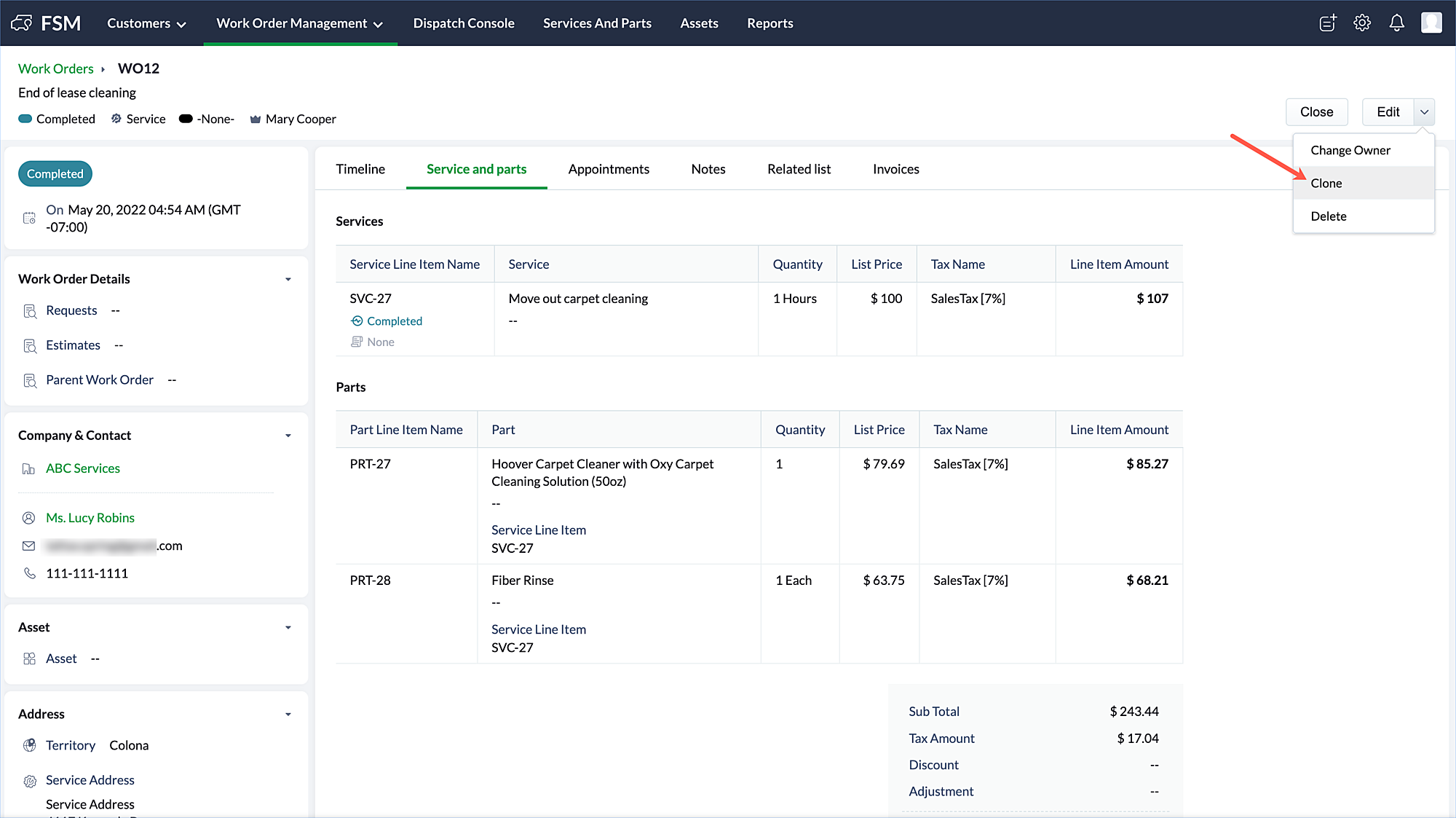 - Click the record you want to clone and in the [Module] Details page, select Clone from the Edit dropdown button.