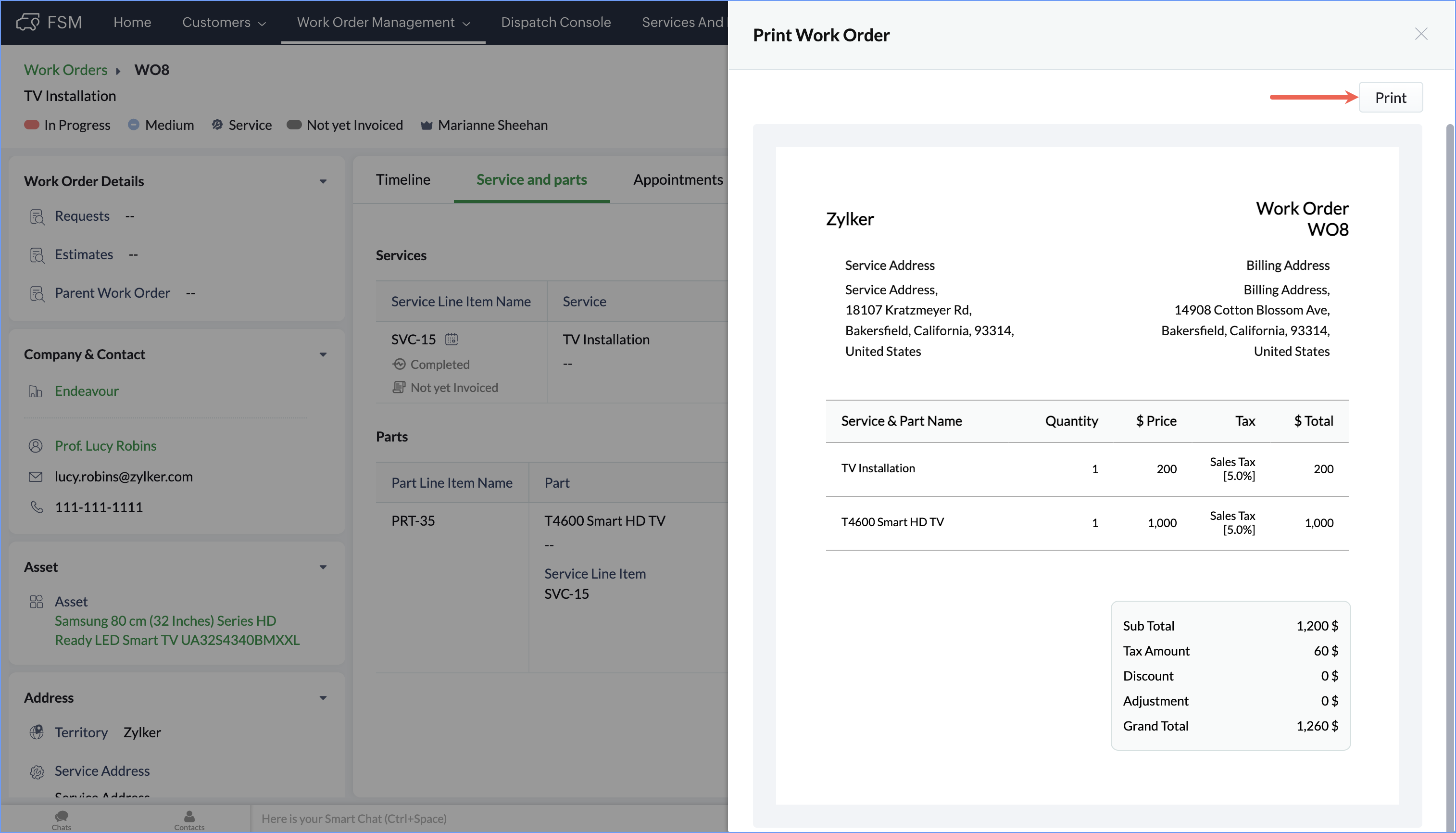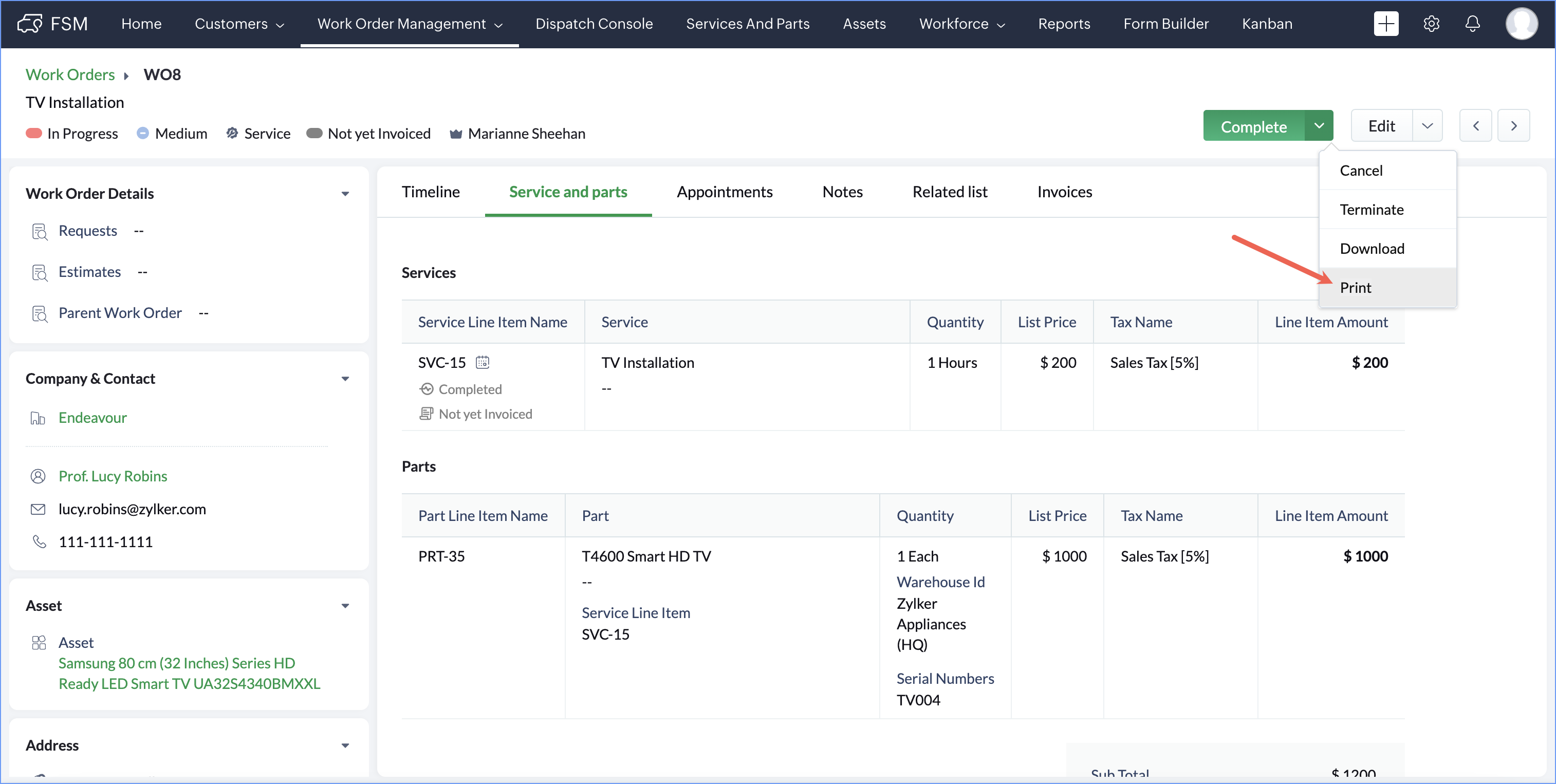 - Click the record you want to print and in the [Module] Details page, select Print from the dropdown button.